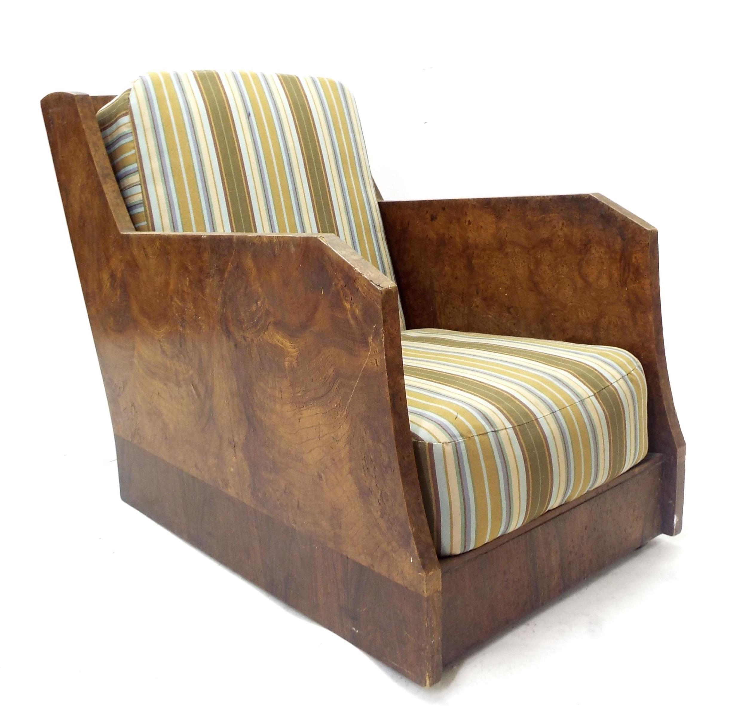 Harry Norris of Bolton burr veneered lounge chair in the manner of Epstein with recently upholstered drop-in seat and back, 23.5" wide, 38" deep