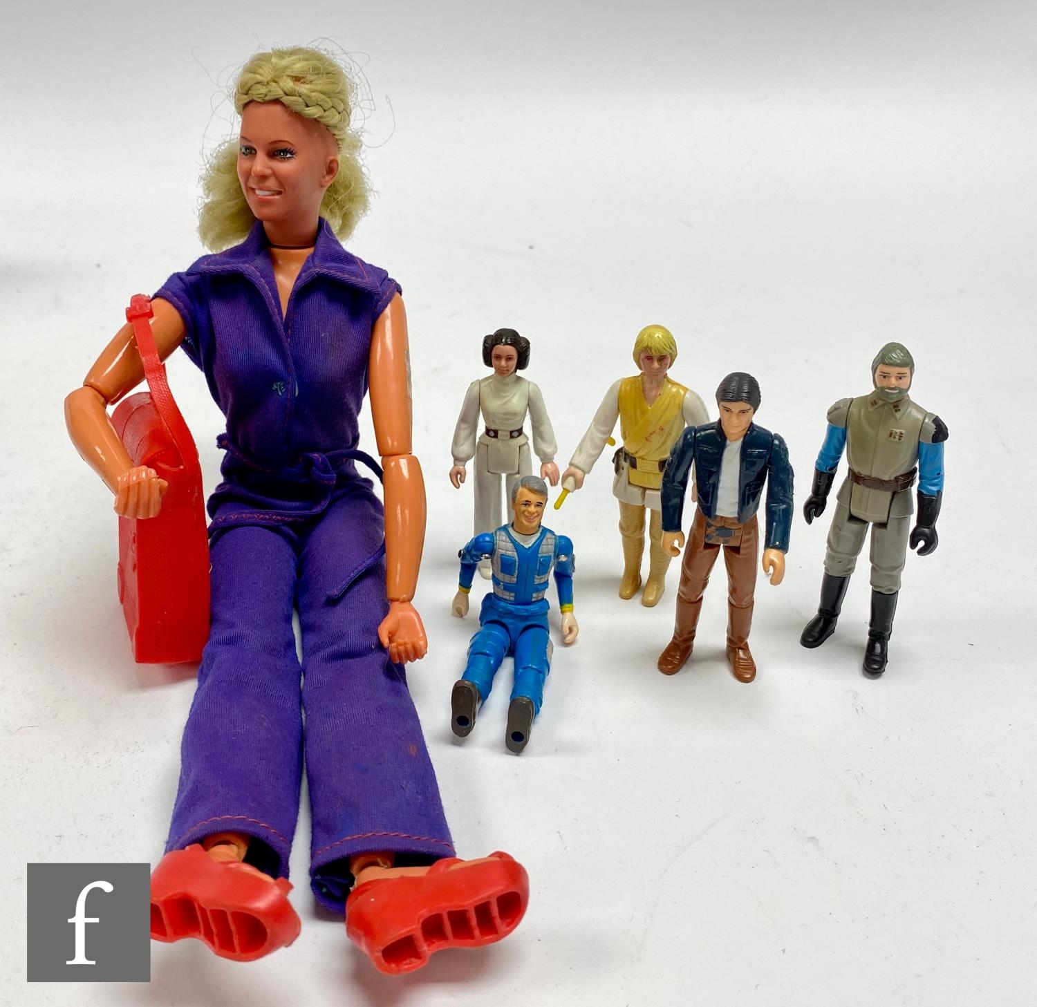 A collection of action figures, comprising Bionic Woman Jaime Sommers doll with bag and shoes, four Kenner Star Wars 3 3/4" figures and a Galoob A Team Hannibal figure, all playworn. (6)