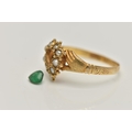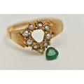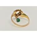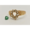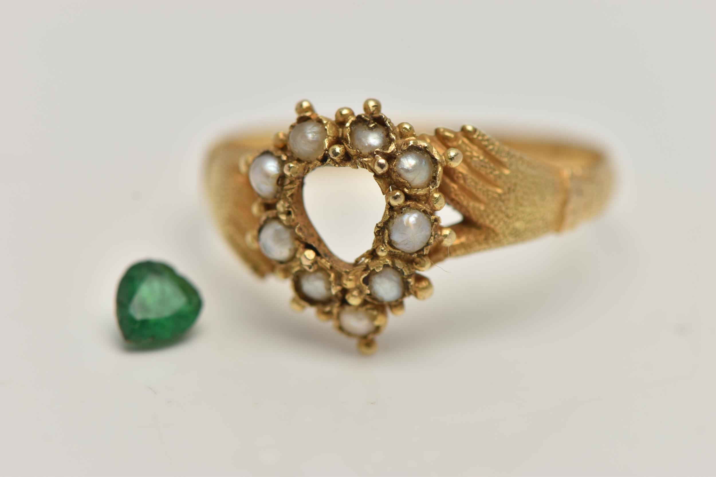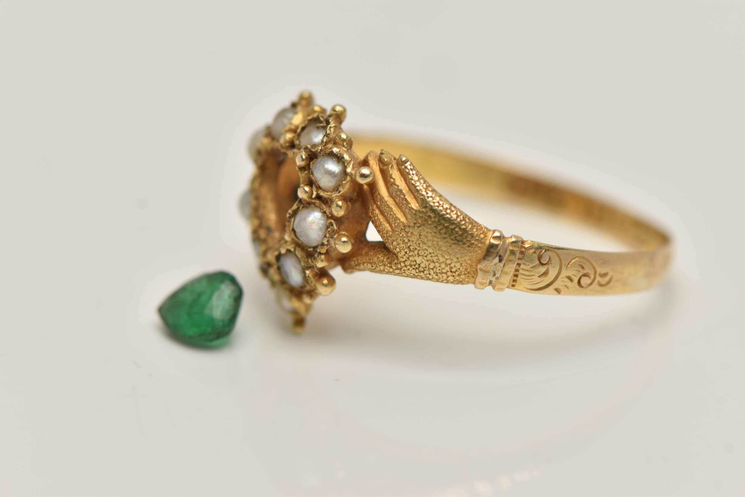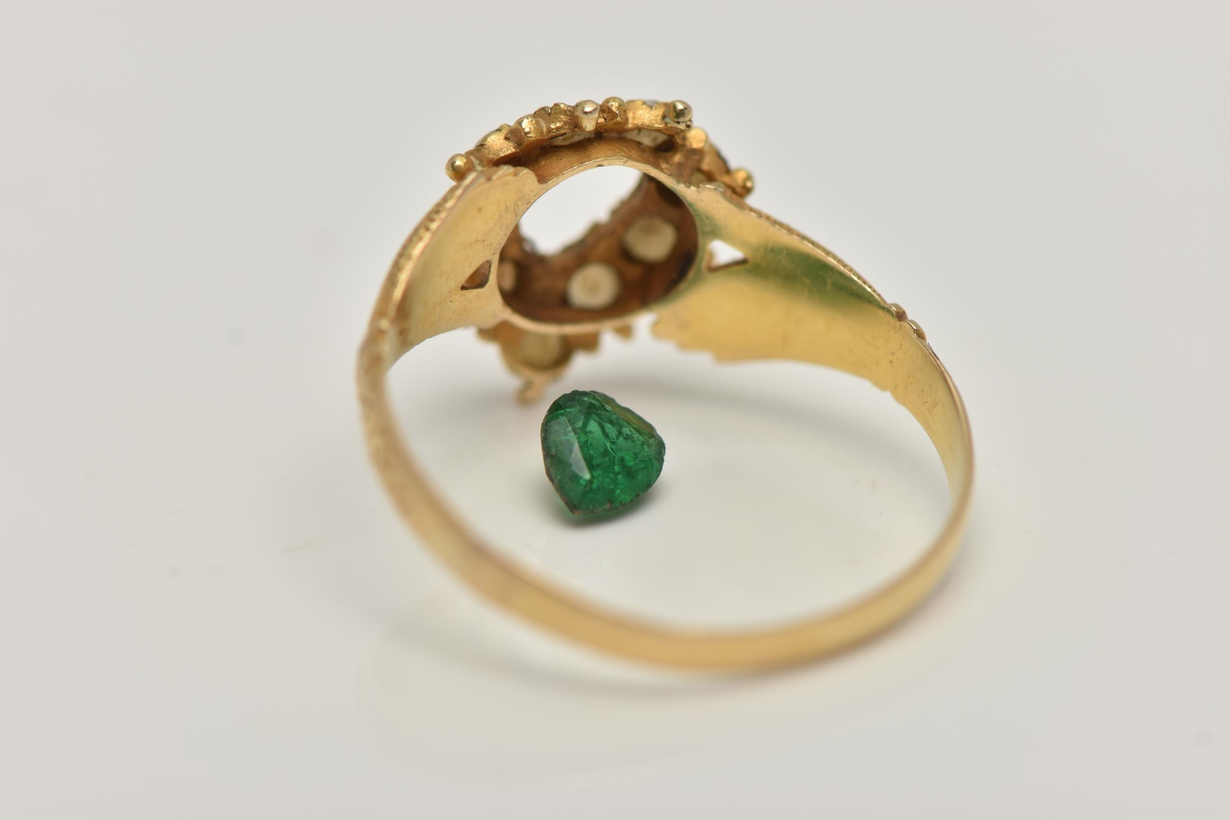 A LATE VICTORIAN 15CT GOLD RING, AF a principle triangular cut green paste stone (free from mount), with a surround of nine seed pearls, held into place with two hands, leading on to a tapered shoulder with engraved scrolling detail, hallmarked 'CR' 15ct Birmingham 1884, ring size O 1/2, approximate gross weight without stone 1.9 grams (Condition report: stone is loose from setting, significant internal fractures to stone, requires attention, all seed pearls currently intact, some slight distortion to band)