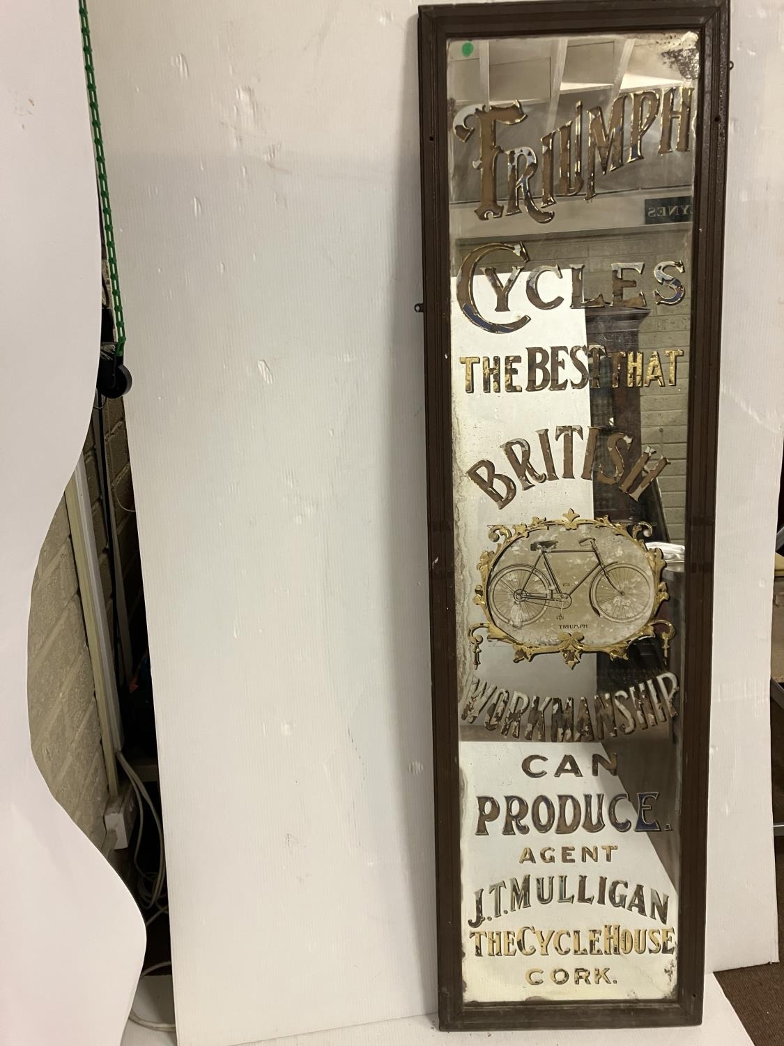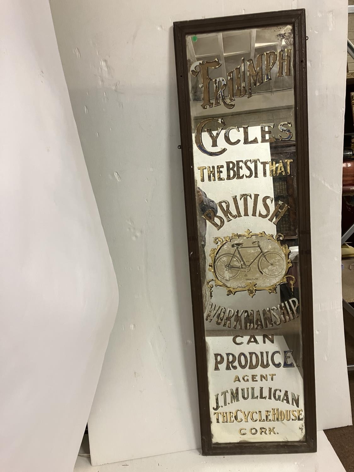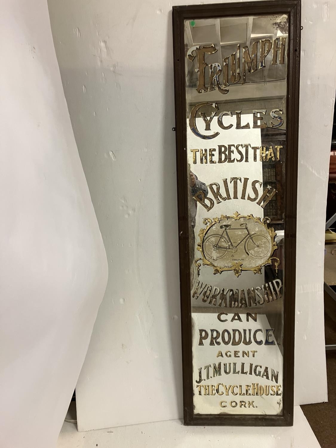 Old framed advertising mirror for Triumph Cycles, the best that British workmanship can produce - Agent J.T. Mulligan, The Cycle House, Cork. H. 173cm x 42cm (mirror size).