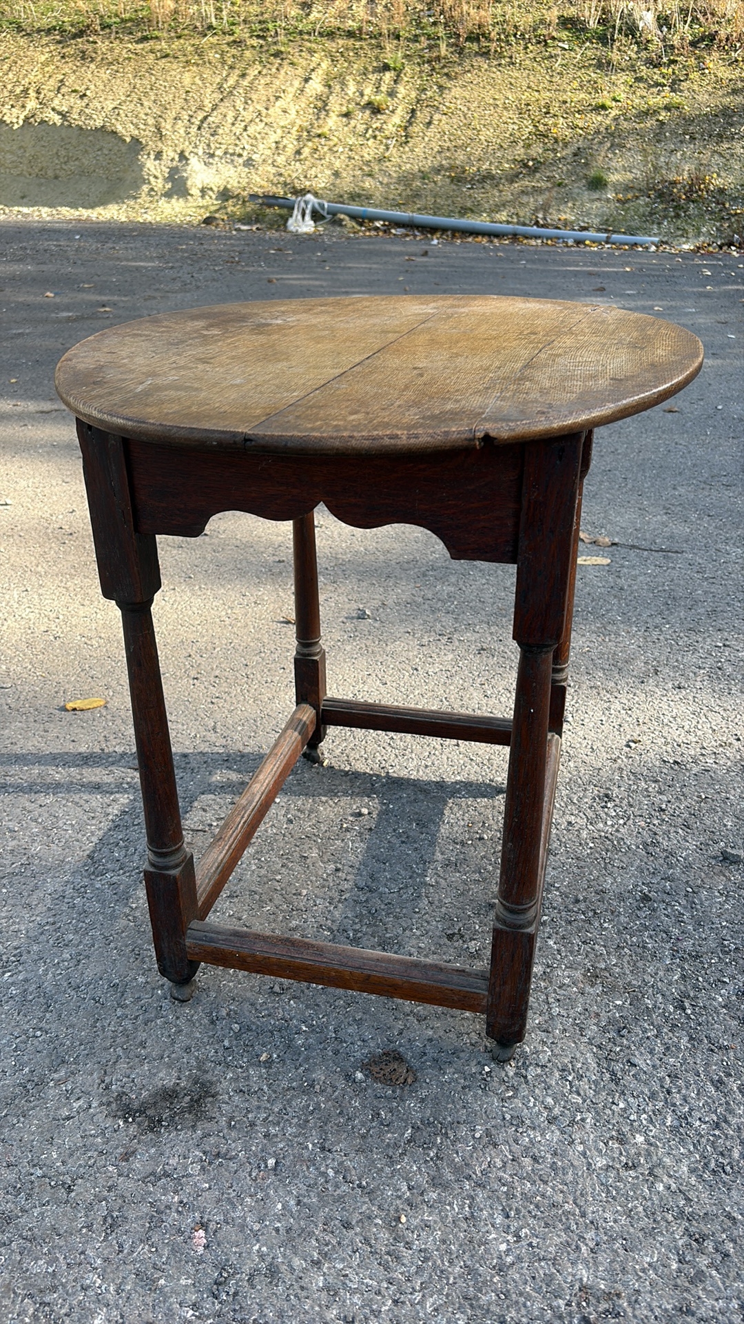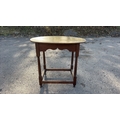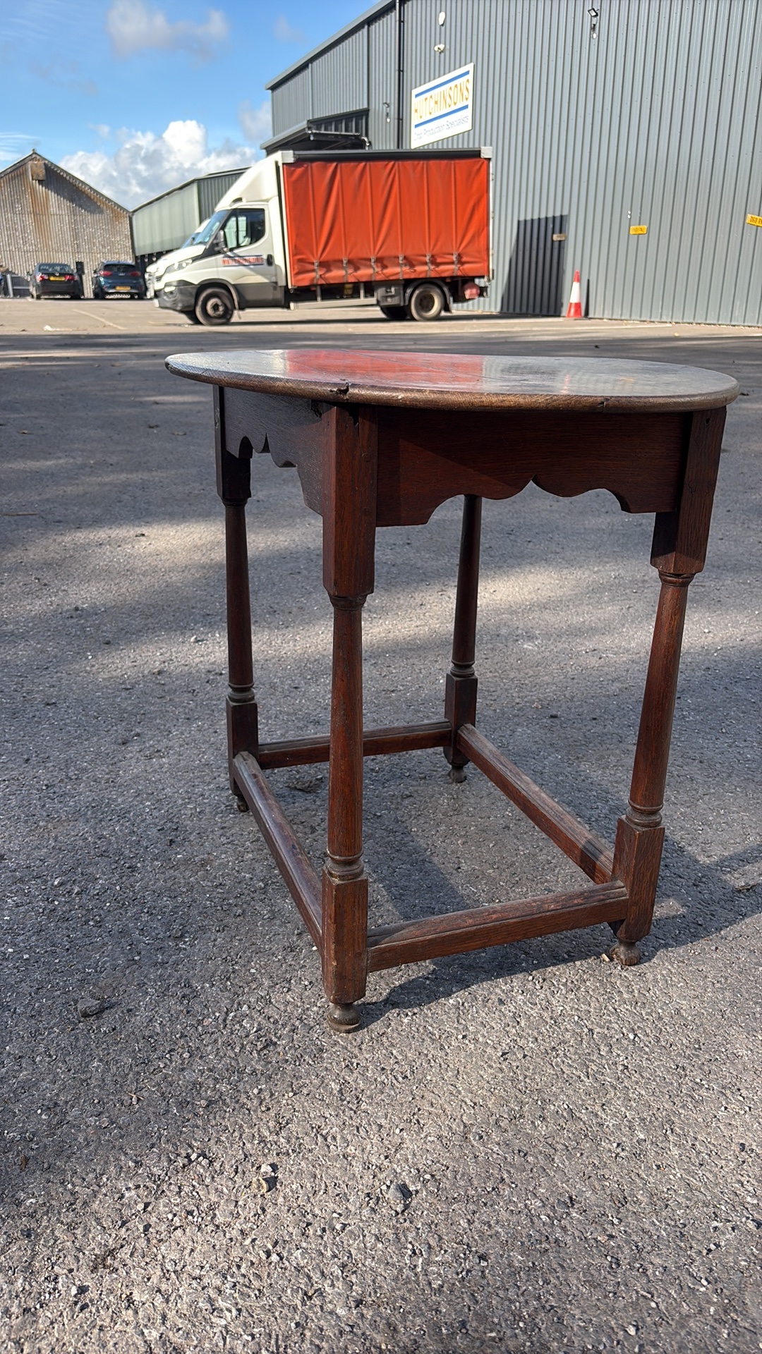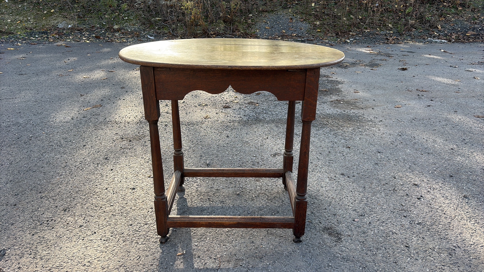 Oval oak occasional table, early 20th century, plank top above scalloped frieze, turned legs united by box stretcher, on brass castors.