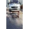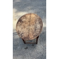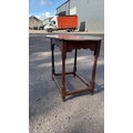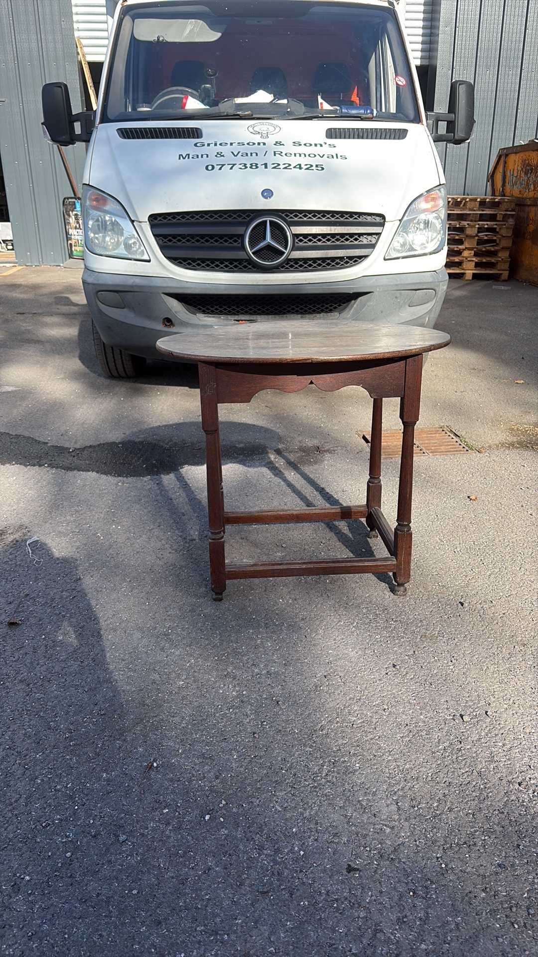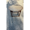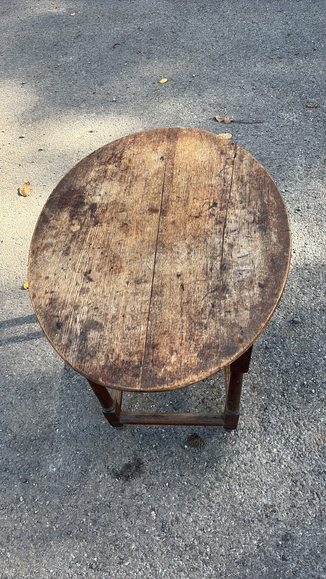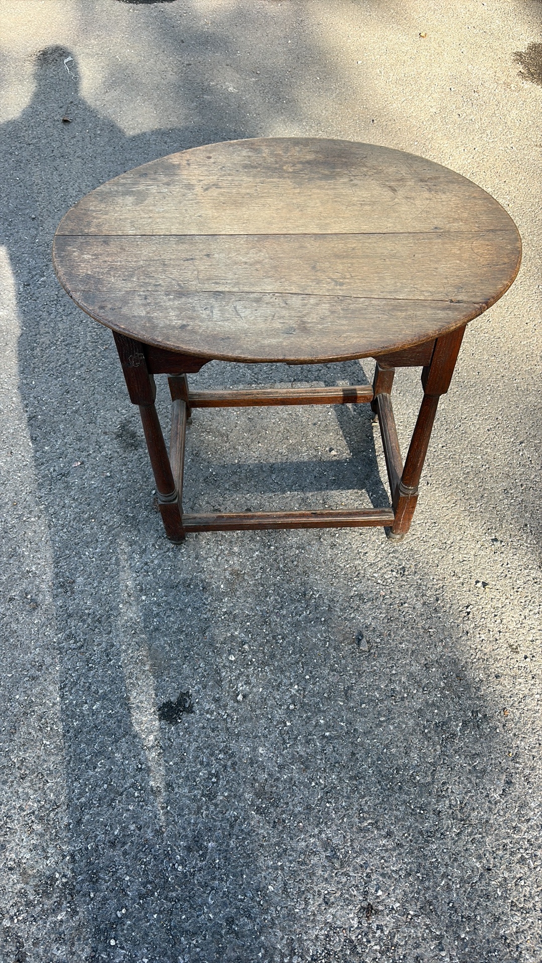 Oval oak occasional table, early 20th century, plank top above scalloped frieze, turned legs united by box stretcher, on brass castors.