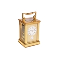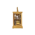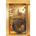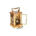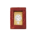 A. Dumas (?), an Anglais Riche cased Grande Sonnerie hour and a quarter repeating, alarm carriage clock, the plain gilt brass case fitted a circular enamel Roman dial with subsidiary alarm dial below, each with blued steel leaf hands within a matted gilt metal mask, the movement and case numbered,1663 and stamped monogram "AD" fitted with a chime sellection lever to the underside, 18 cm high (handle up), with red leather travel case. Right-hand lens with a slight corner chip Repeat working as expected Chiming as expected Alarm working