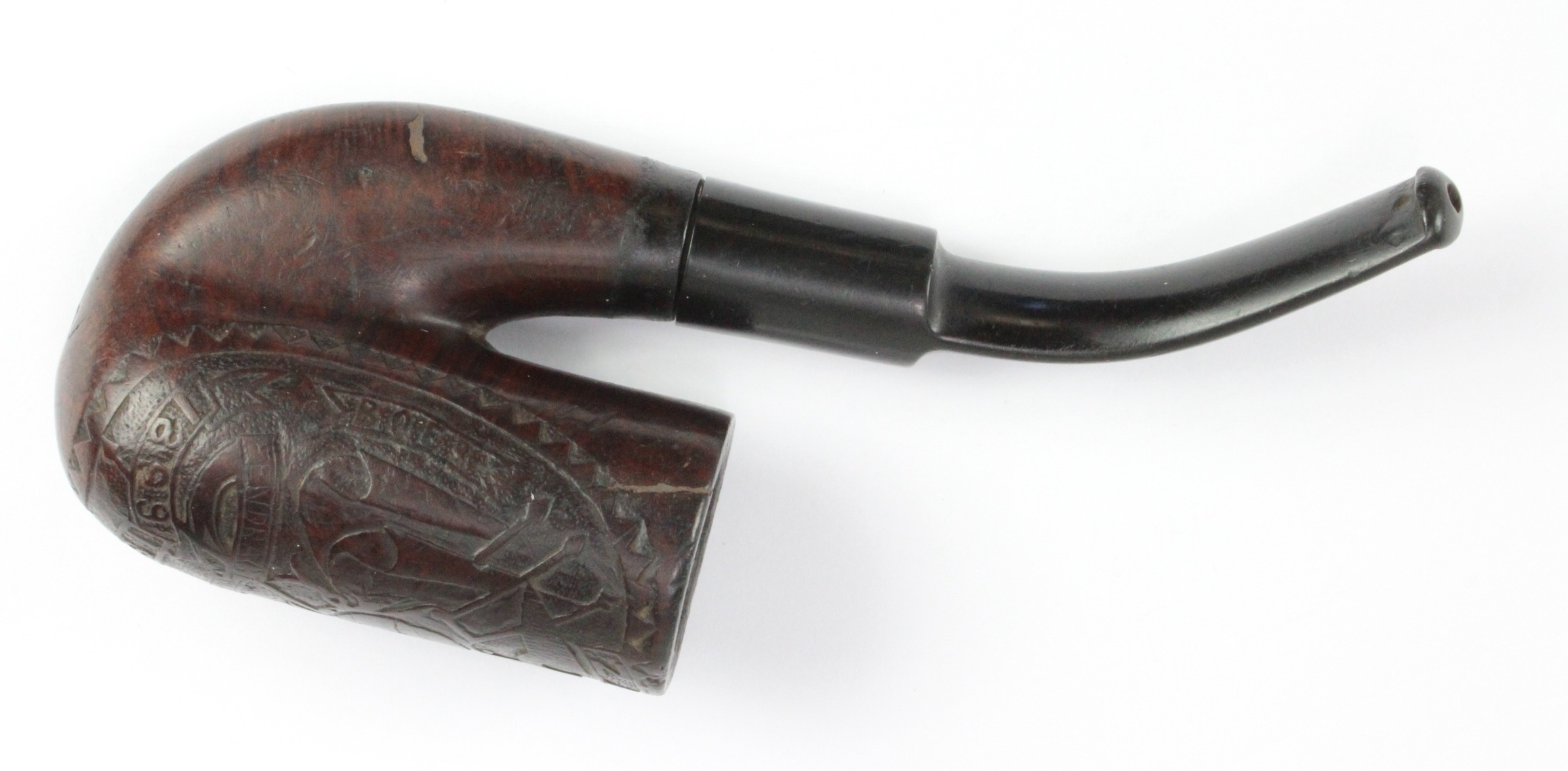 Boer prisoner-of-war art 'Oom Paul' pipe with finely detailed carving of the Zuid-Afrikaansche Republiek coat-of-arms with 'ZAR' above, 'BOER / WAR' either side, and the dates '1899 / 1900 / 1901' in a ribbon banner below.