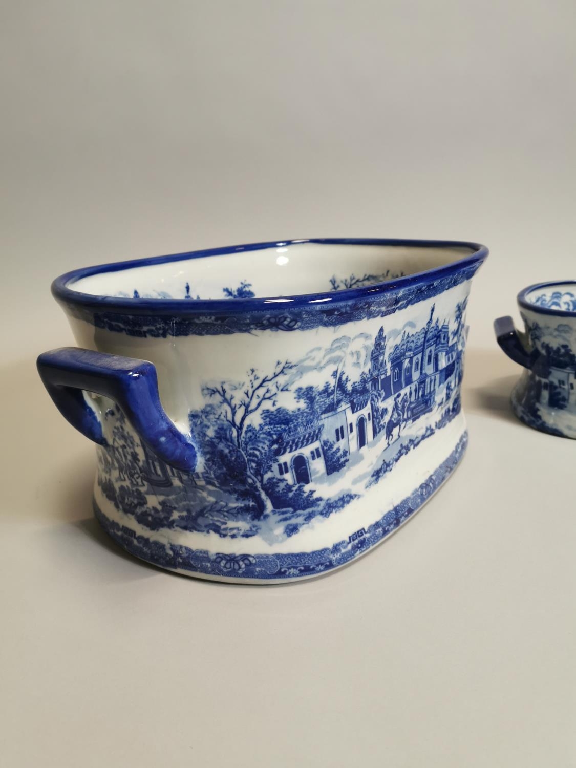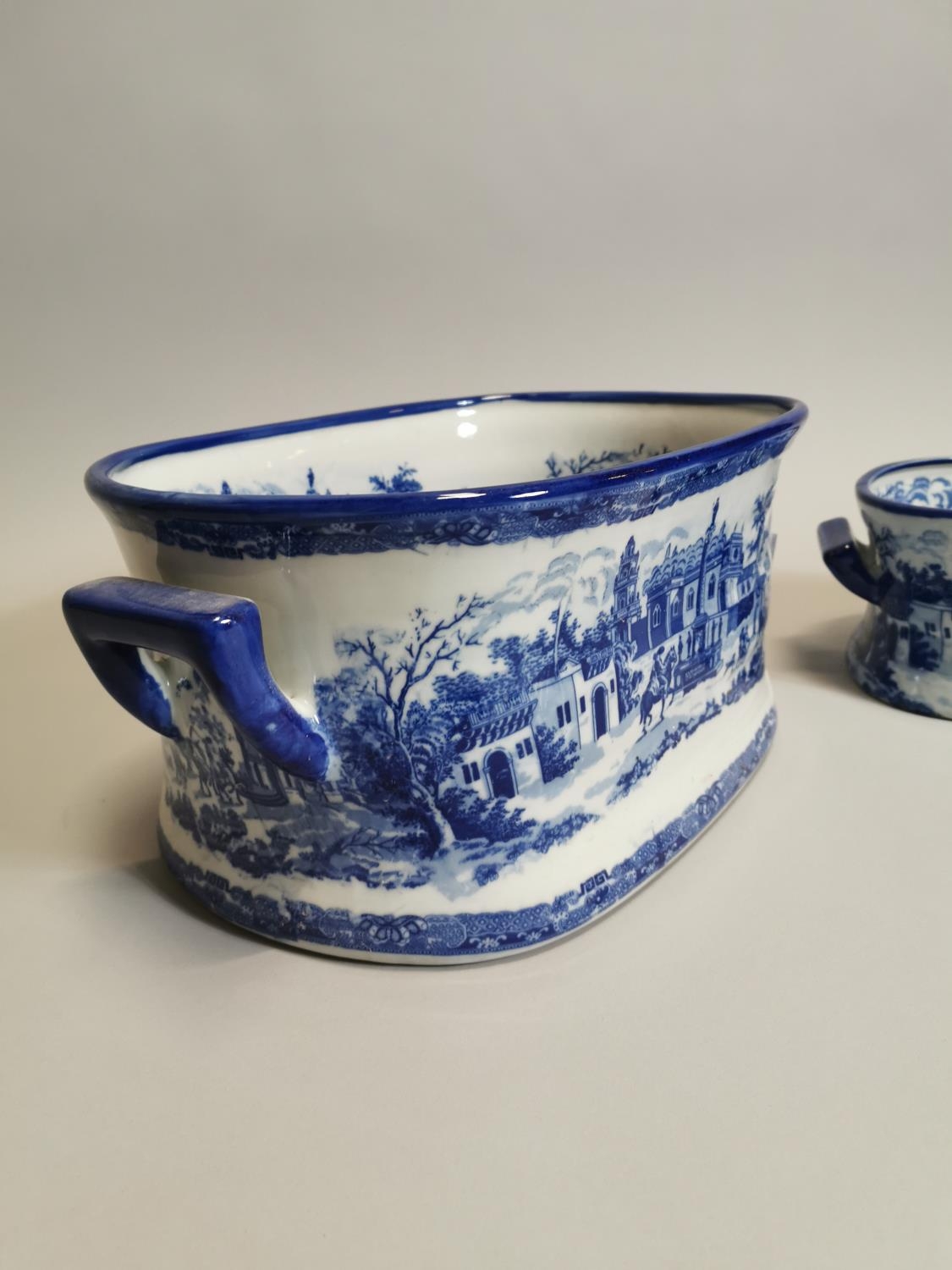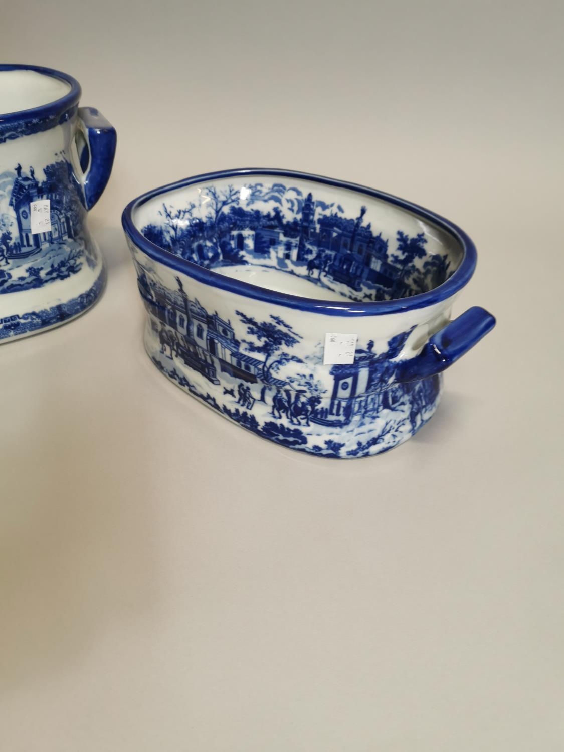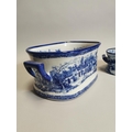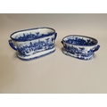 Two blue and white ceramic foot baths { 21cm H X 45cm W X 30cm D & 14cm H X 34cm W X 22cm D }.