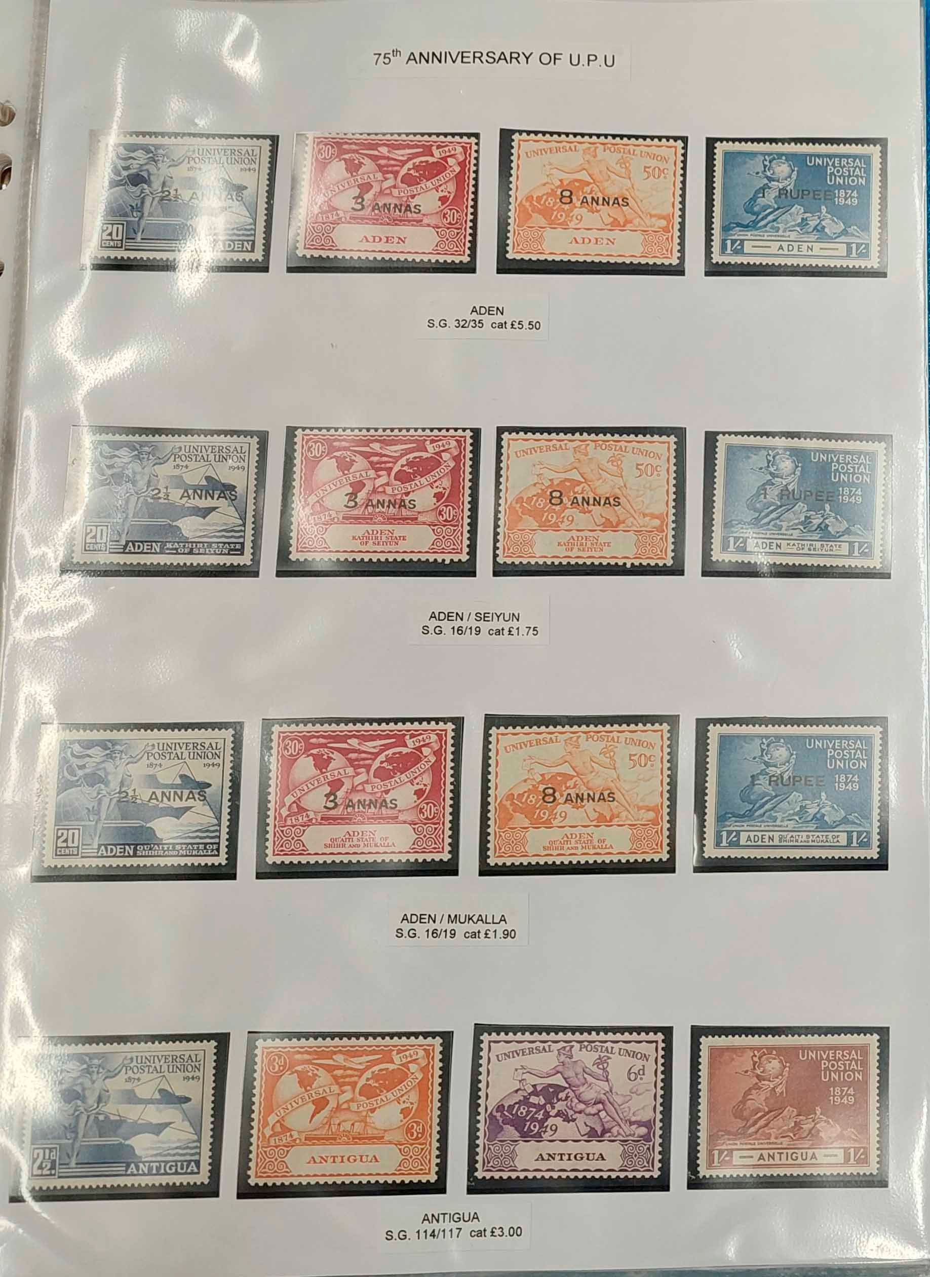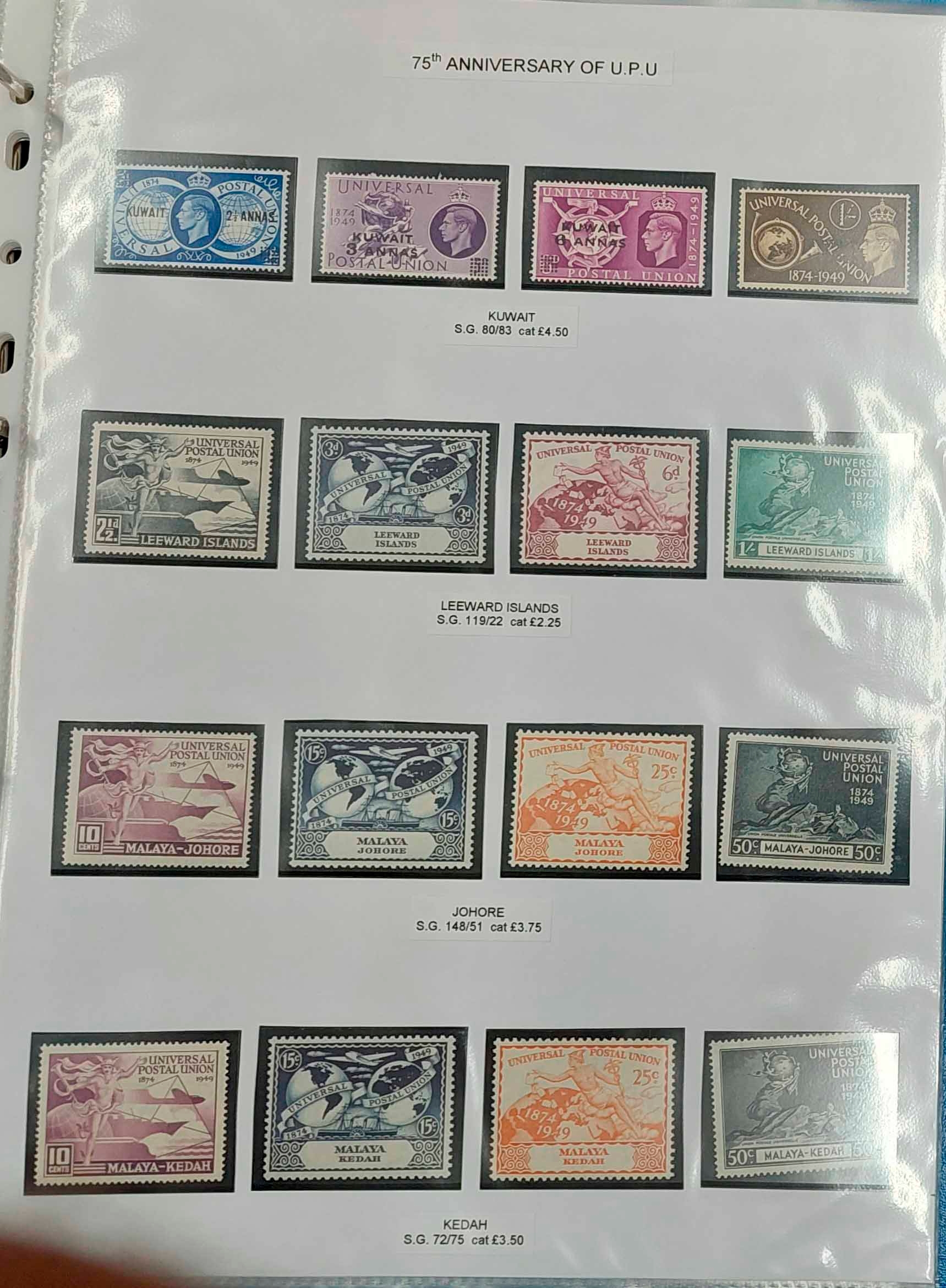 1945 VICTORY, 1949 UPU, 1965 CHURCHILL - COMPLETE MINT SETS: Binder with all 3 omnibus series in mounts on pages, identified by SG cat. no. All but one set (India Victory used) of many checked appear to be unmounted mint. Totals Victory (164), UPU (310) & Churchill (182). Total SG Cat. £850.