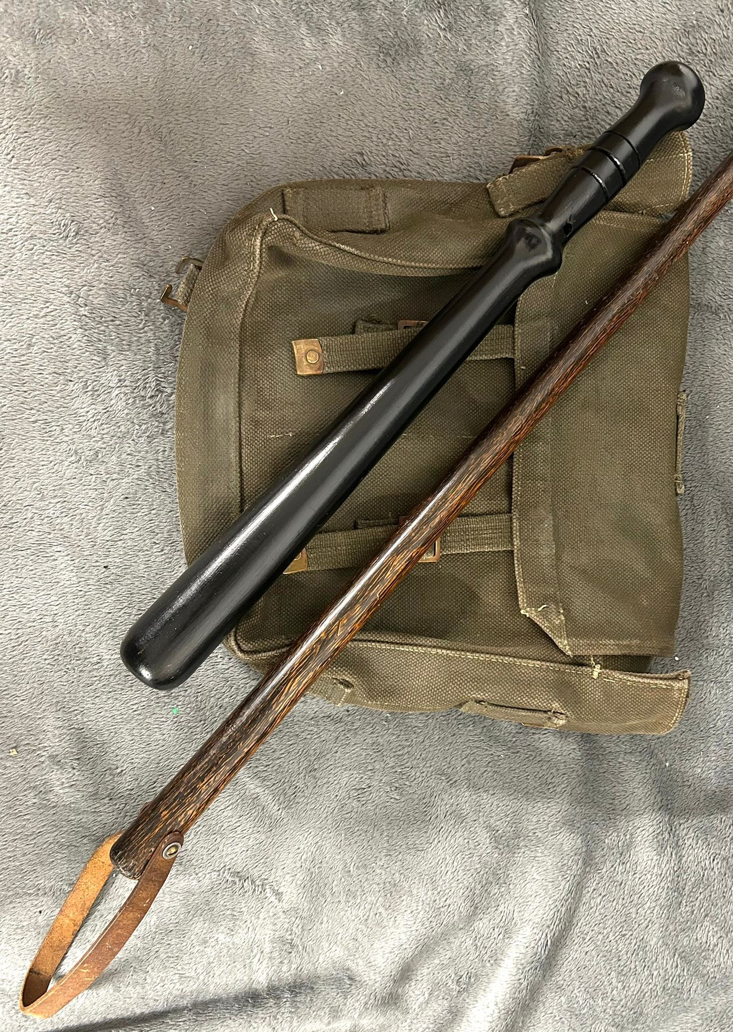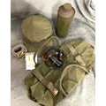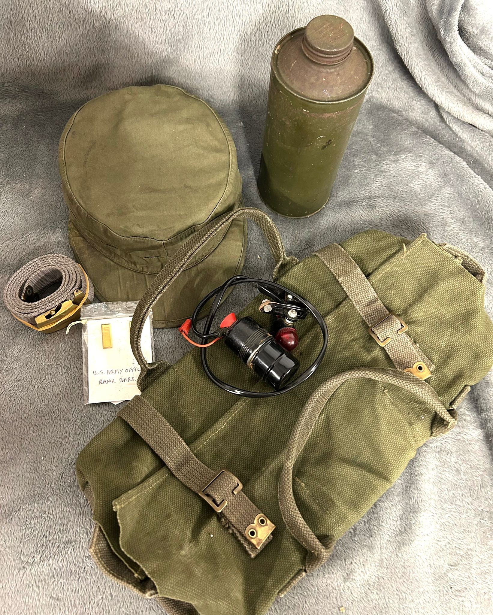 A small quantity of militaria etc., including WWII/Vietnam War US Army soft peaked cap and webbing belt, pair of US Army officers rank bars, Air Sea Rescue life jacket light, parafin "Tilley" lamp and quart paraffin can, webbing rucksack and hold-all, map pointer, black wood truncheon and 3 pistol bags.