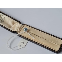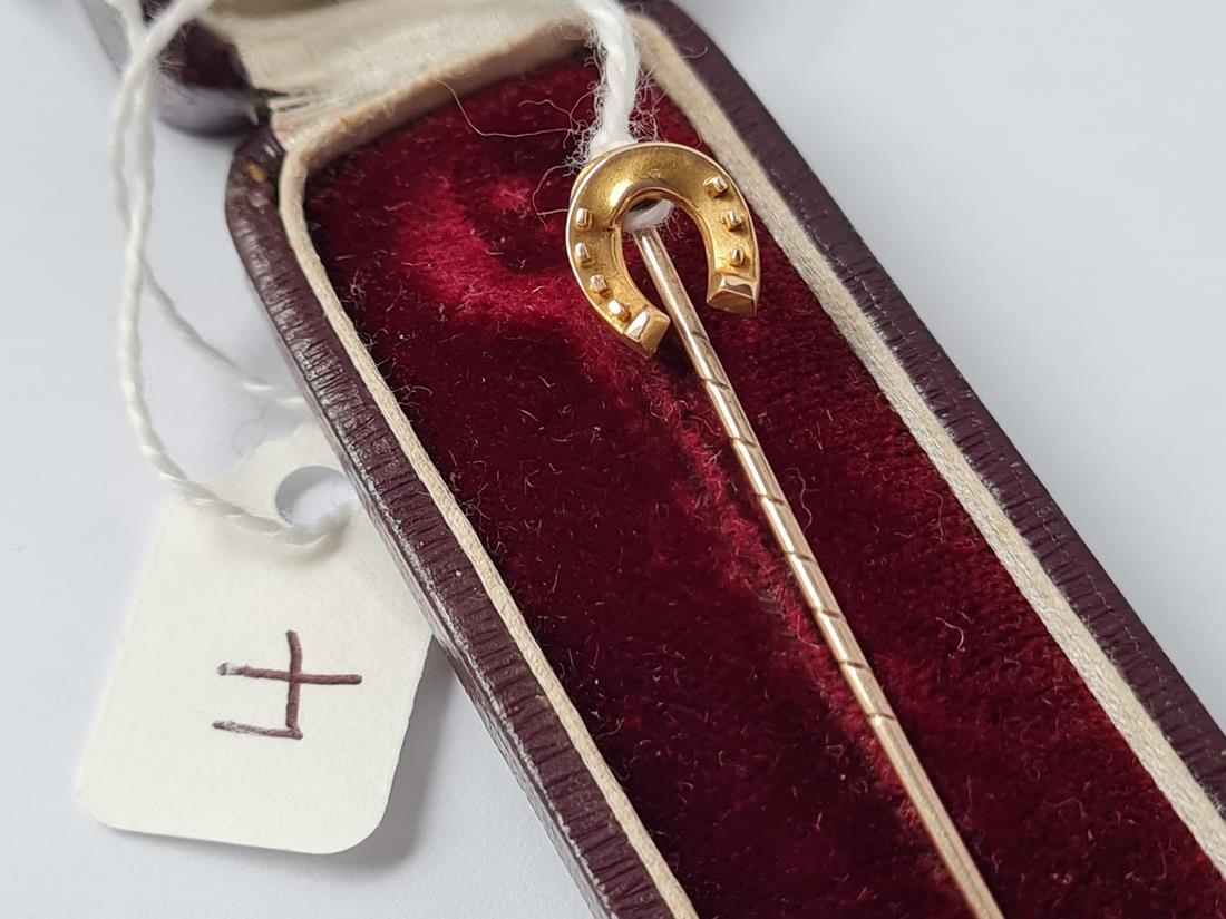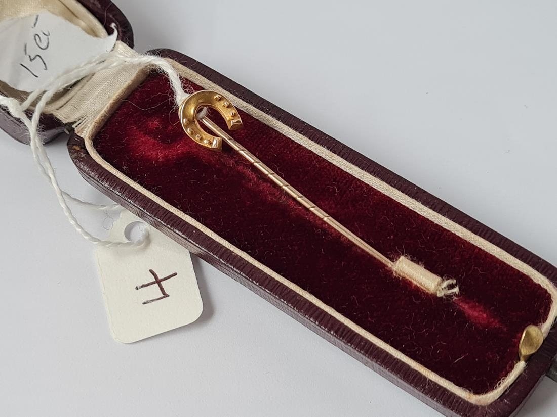 A boxed horse shoe stick pin in 15ct gold