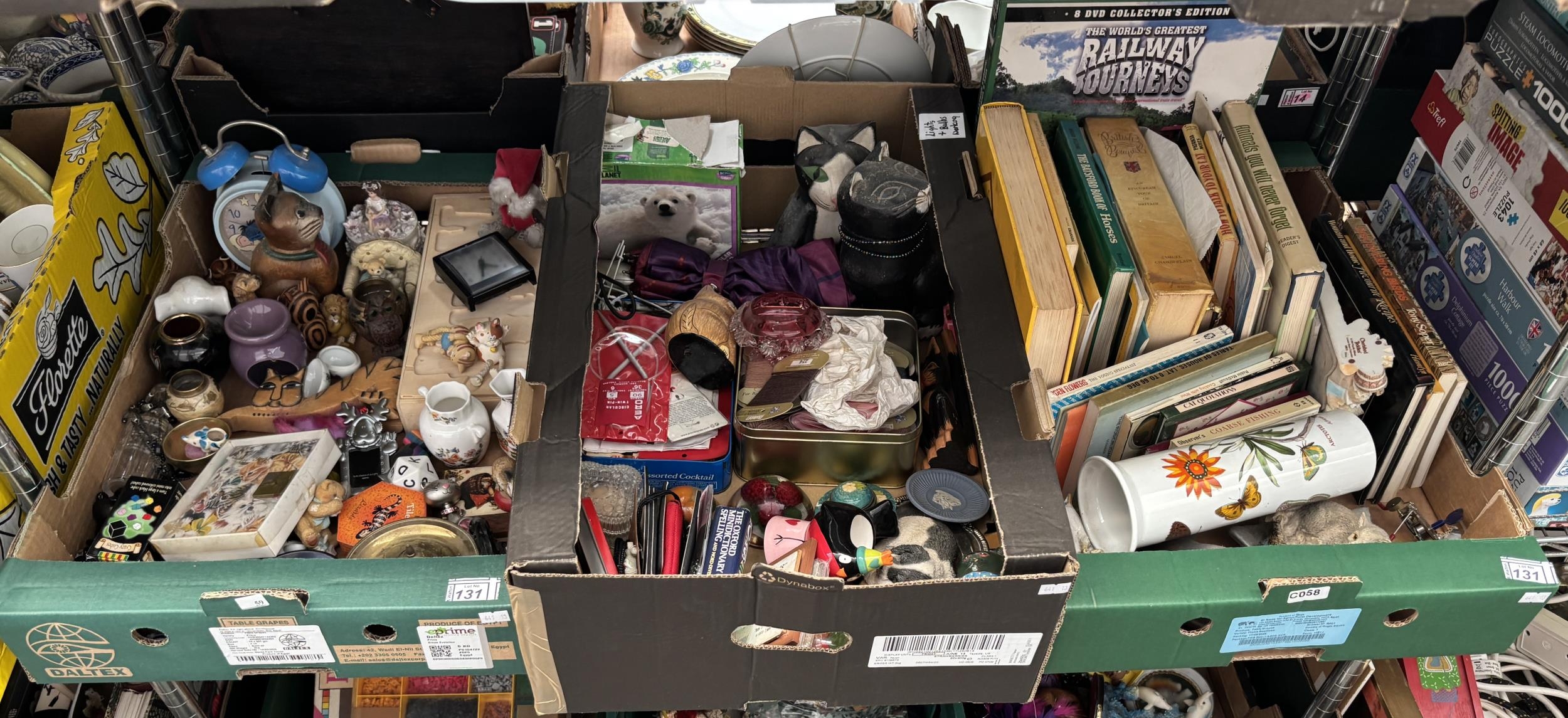 3 Boxes containing assorted ornaments, trinkets, books and a Portmeirion Botanic Garden vase