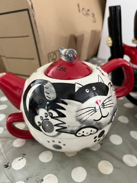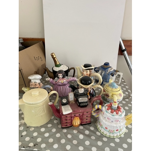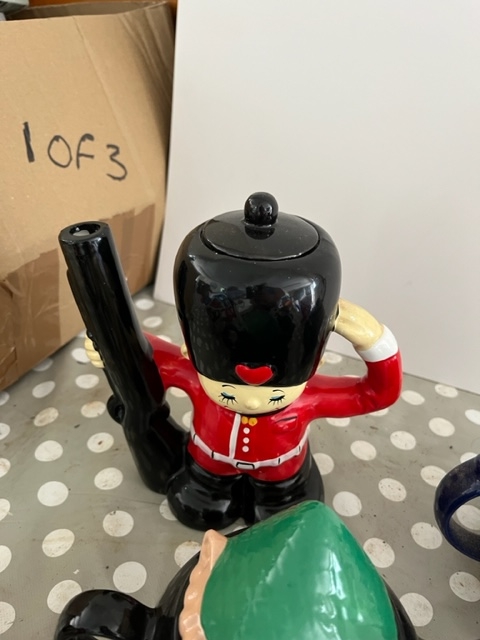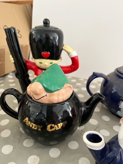 Collection of novelty teapots, including Andy Capp and a Telephone Box