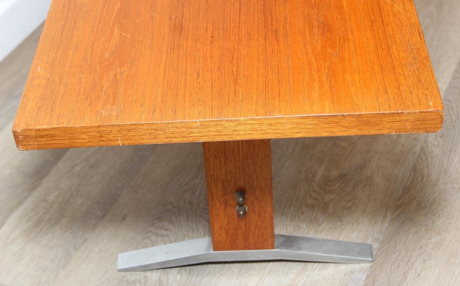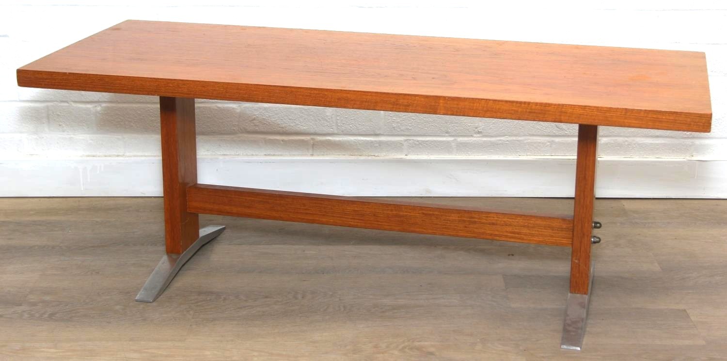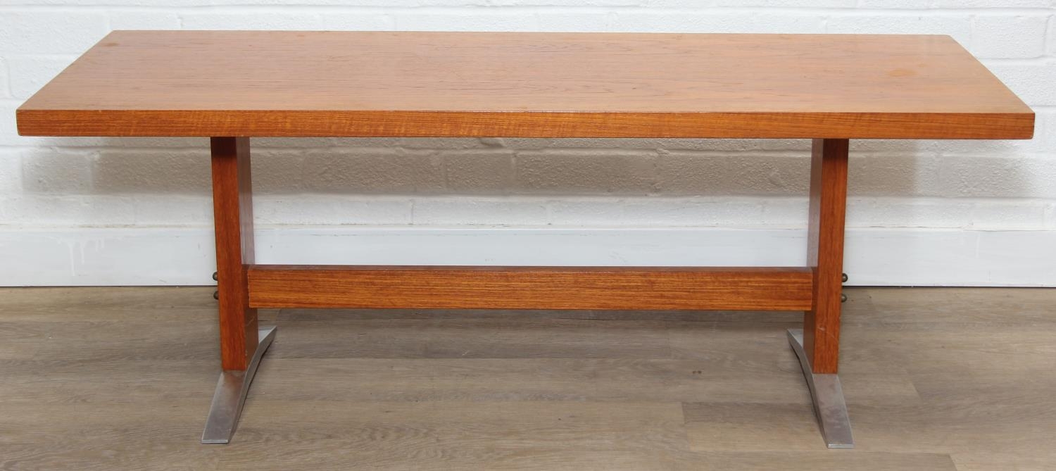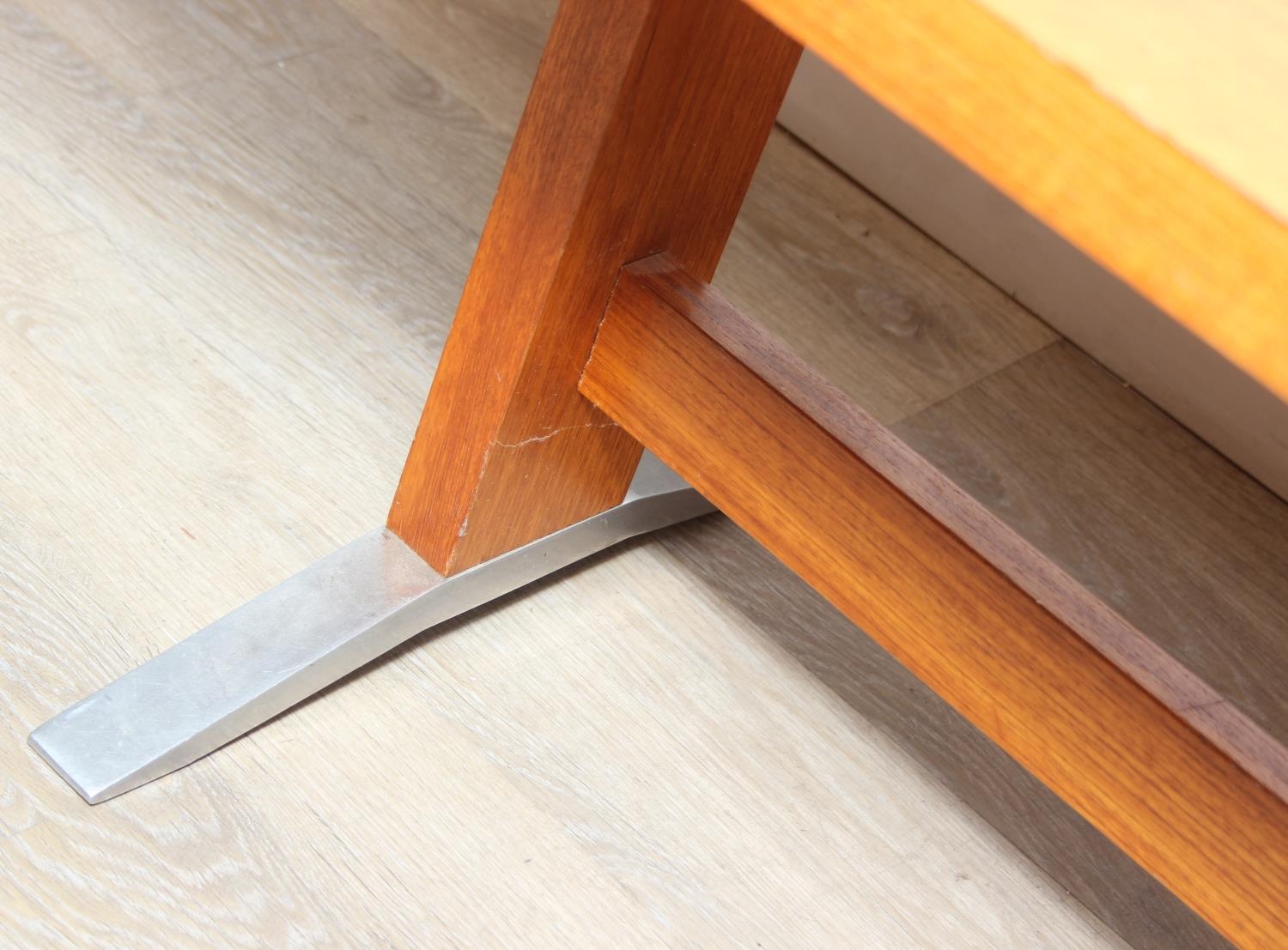 A retro Dutch low side table with metal feet, marked under, 120cm x 49cm x 45cm