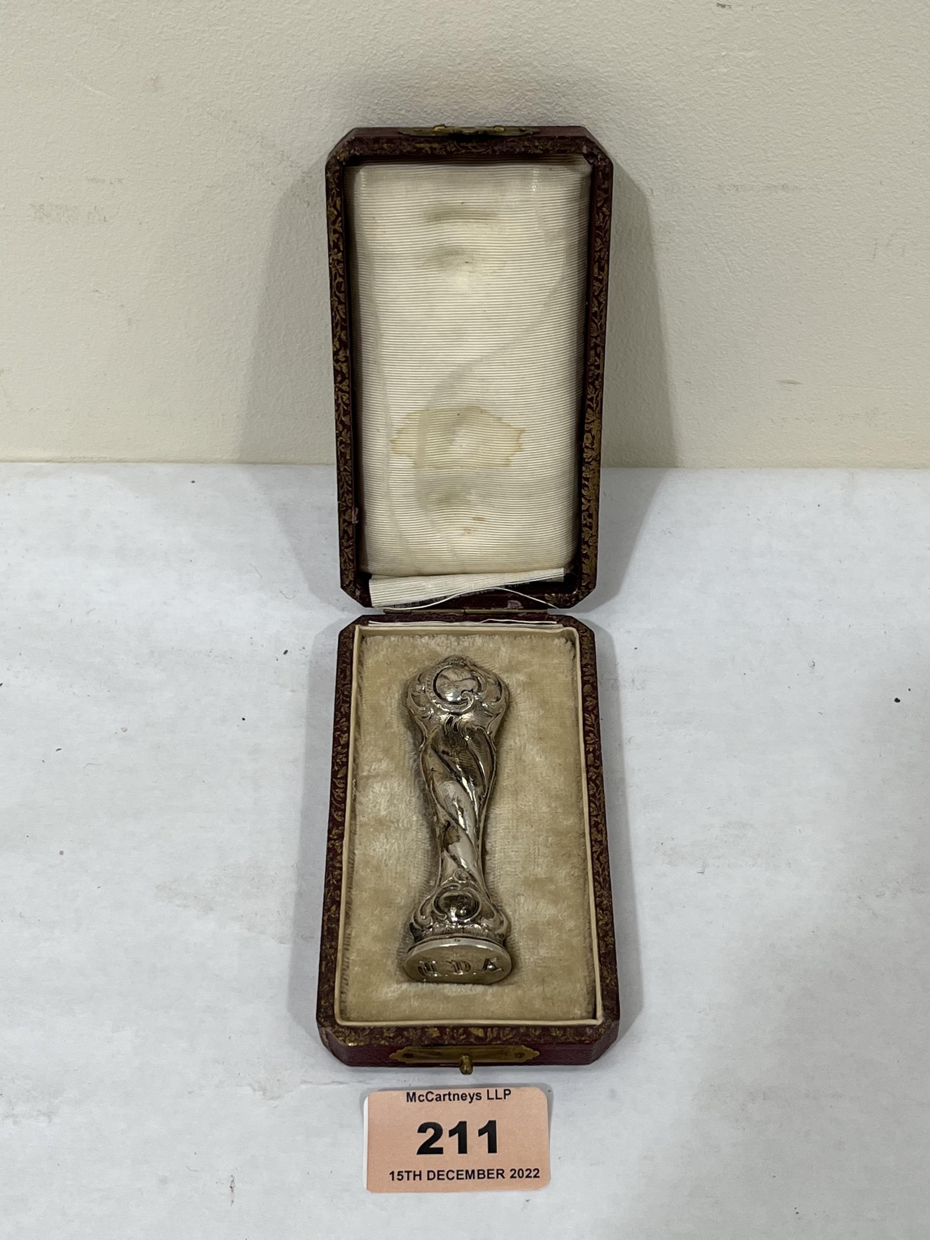 A 19th century silver desk seal in Morocco case. 3¼' high