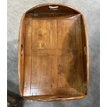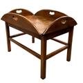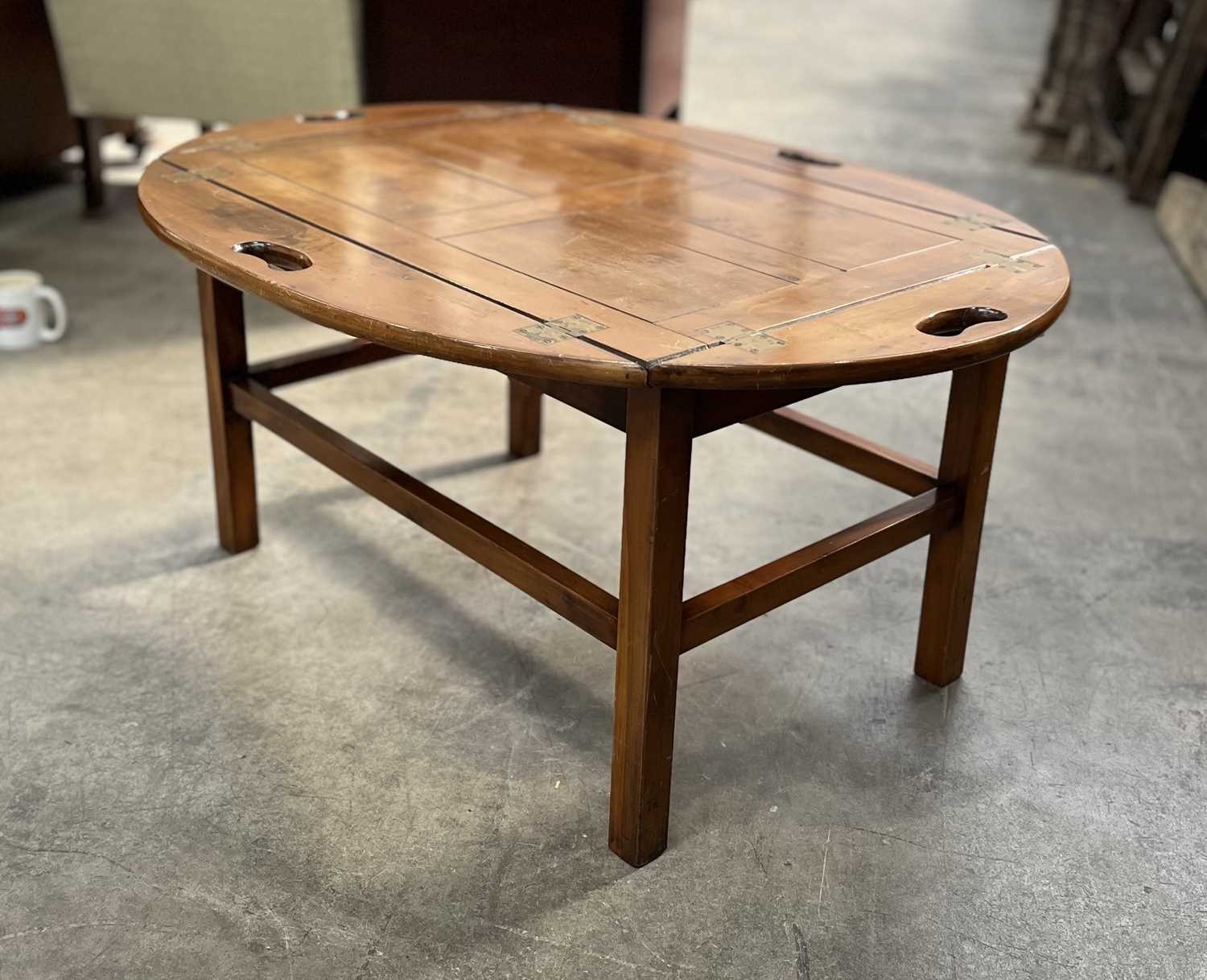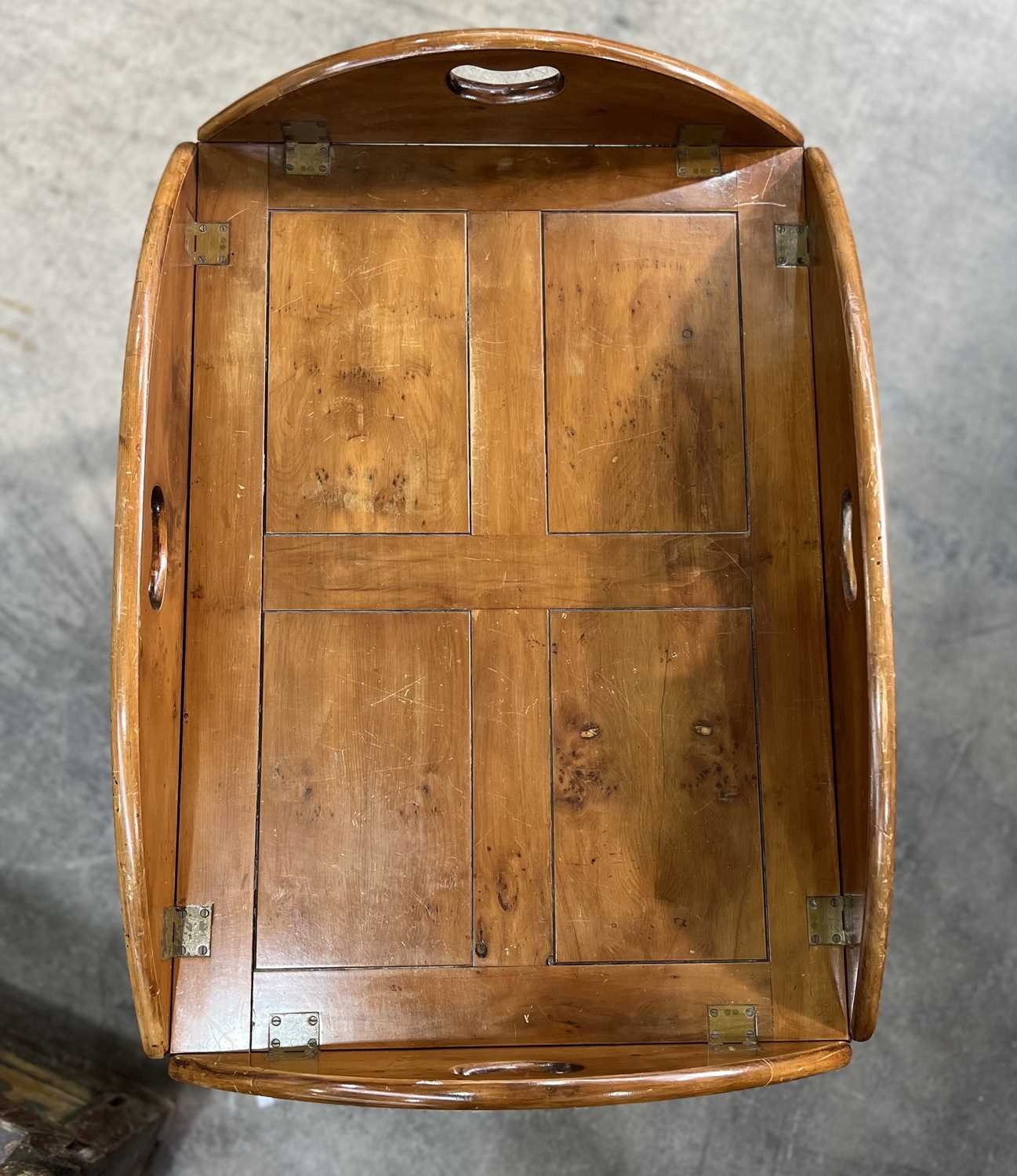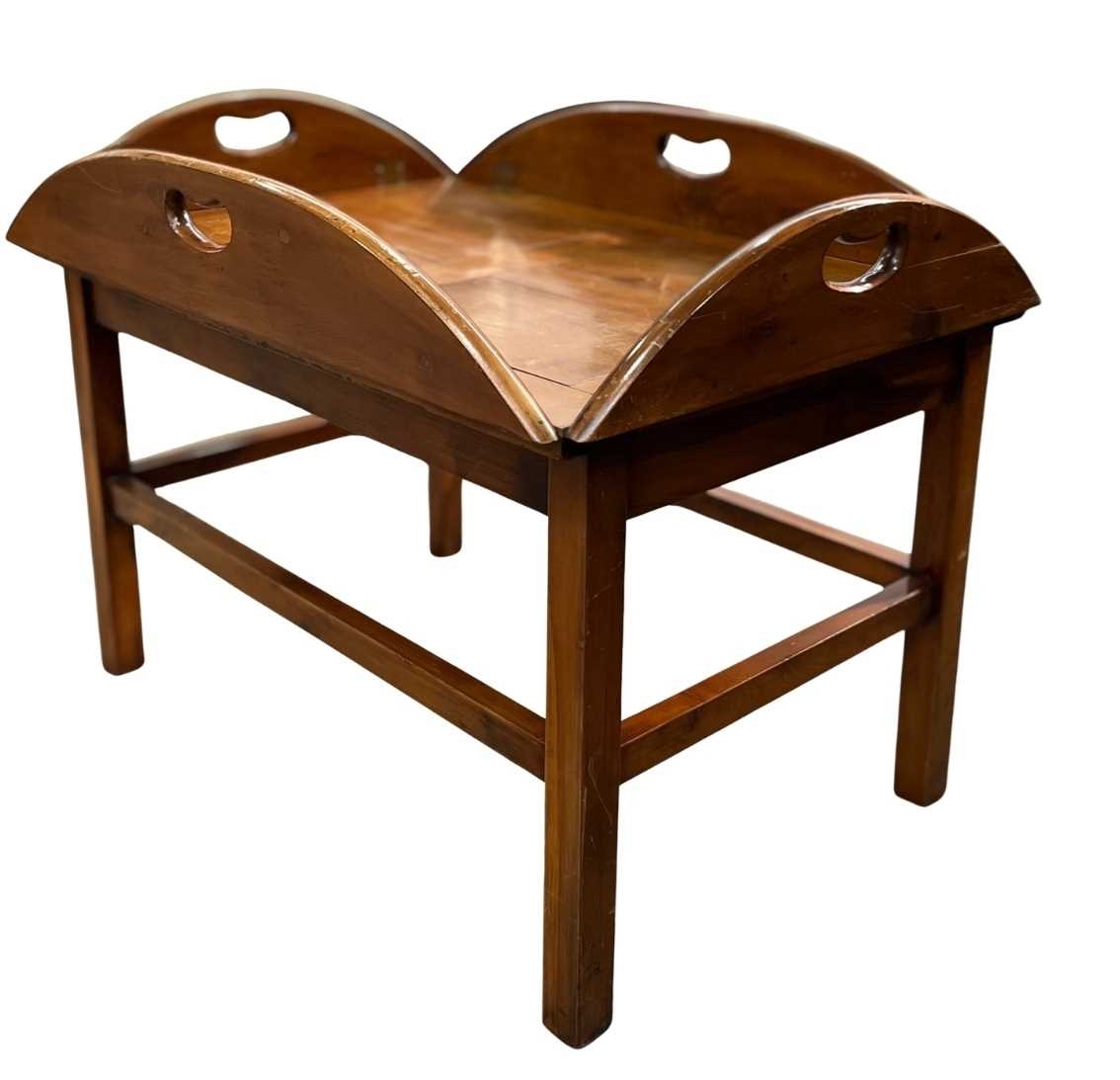 A traditional yew wood butler's tray top coffee table on a stand, 20th Century, of Georgian design, 58cm high, 80cm wide, 57cm deep (closed) (1)
