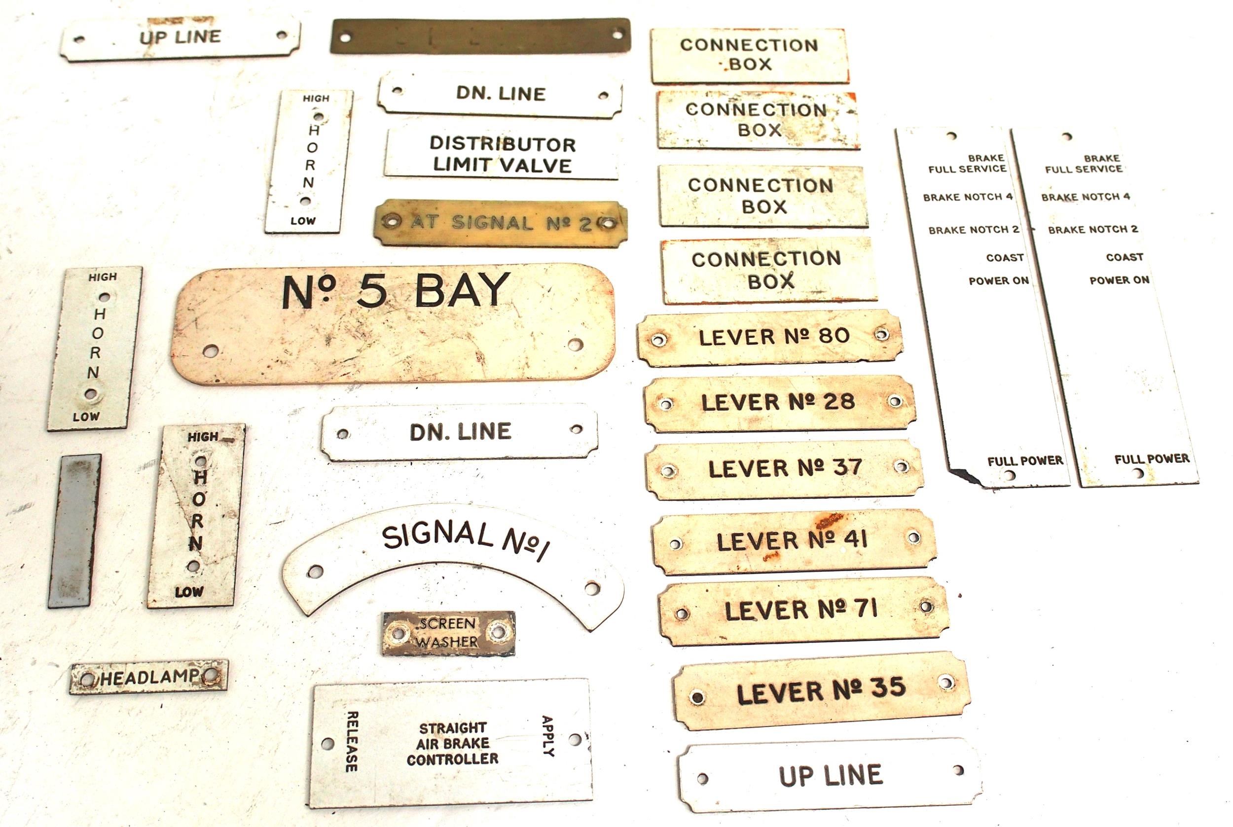 Quantity of mainly BR(LMR) signal box instrument plates including one worn brass "UP LINE" also locomotive control consul traffolite plates. (D3) (Dispatch by Mailboxes/Collect from Banbury Depot)