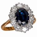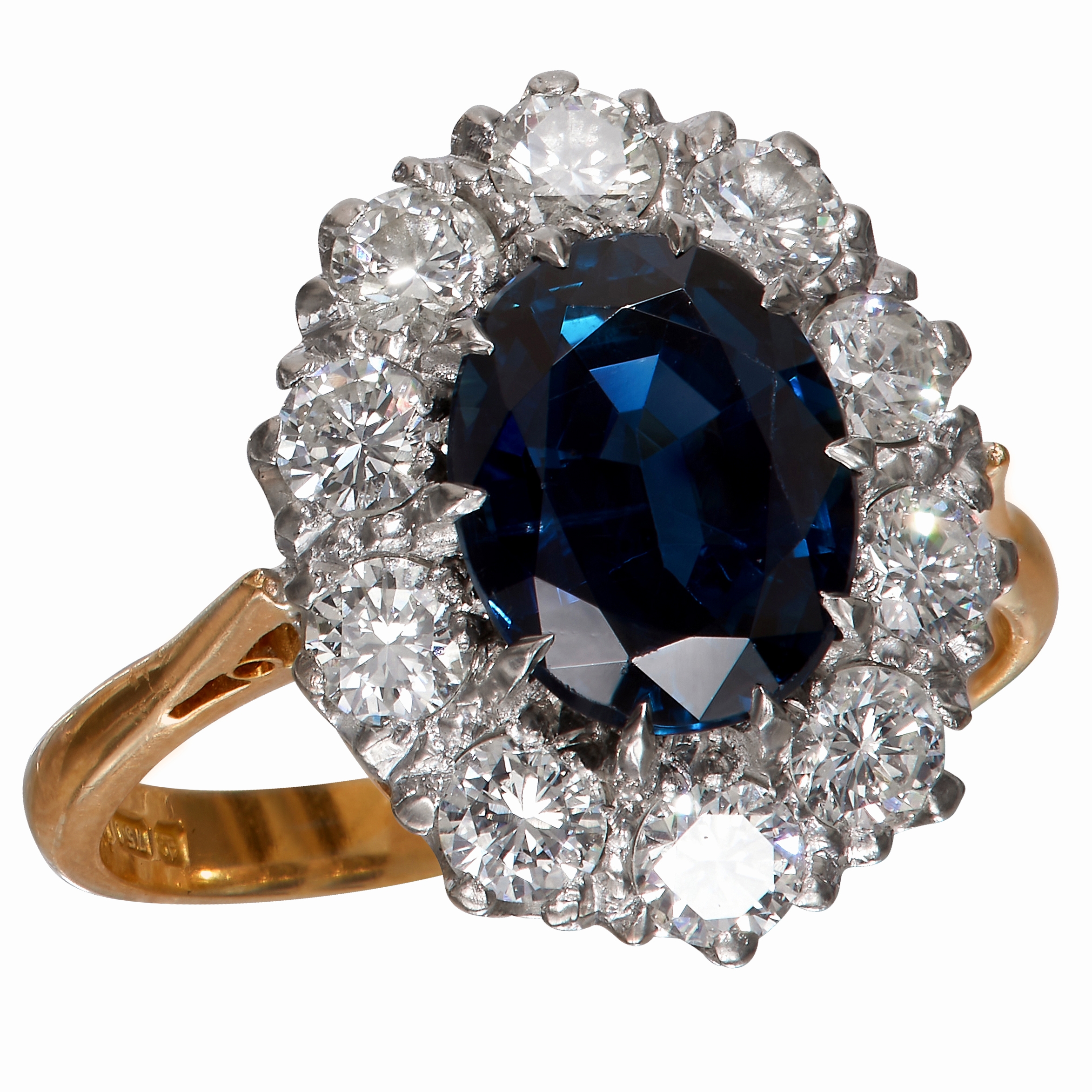 SAPPHIRE AND DIAMOND CLUSTER RING, in 18 ct. gold. Sapphire approx. 2.14 ct. bright and lively diamonds totalling approx. 1.10 ct. Size O. 5.8 grams.