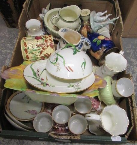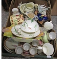 BOX OF CERAMICS INCLUDING CUPS, CANDLE HOLDER ETC