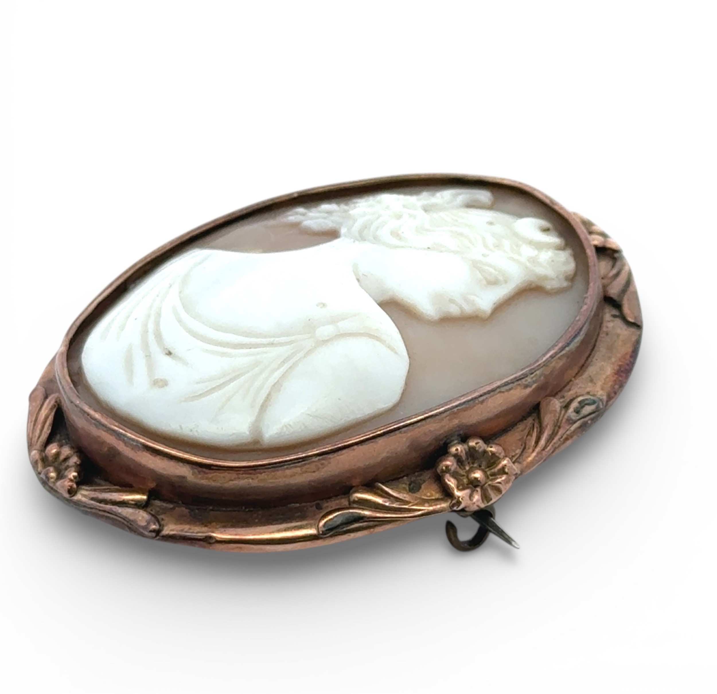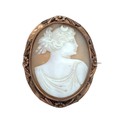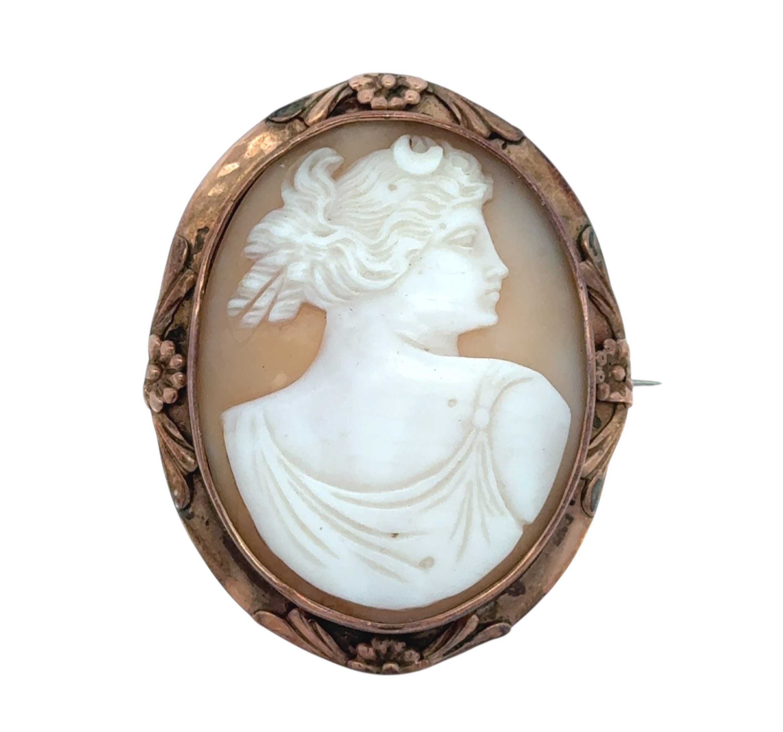 A yellow metal cameo brooch, depicting the goddess Diana. Length 57mm, steel pin. 17.62g
