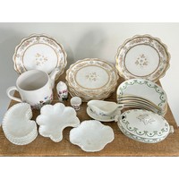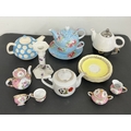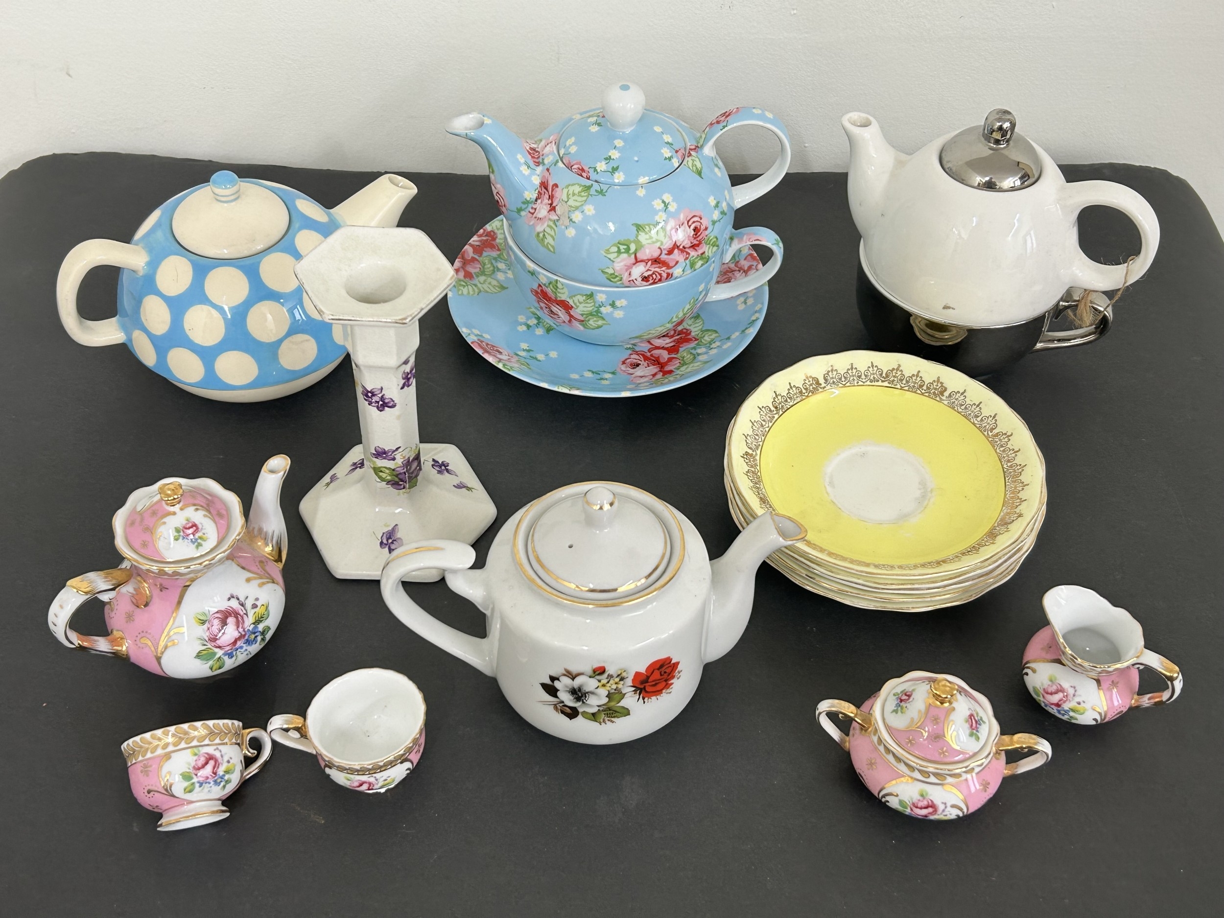 Various teapots, tea cups and saucers, candlestick etc