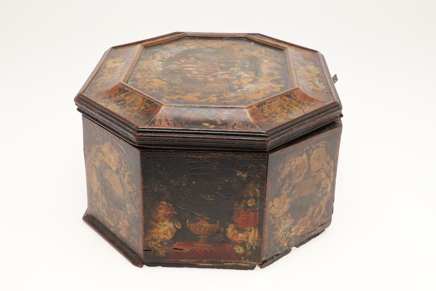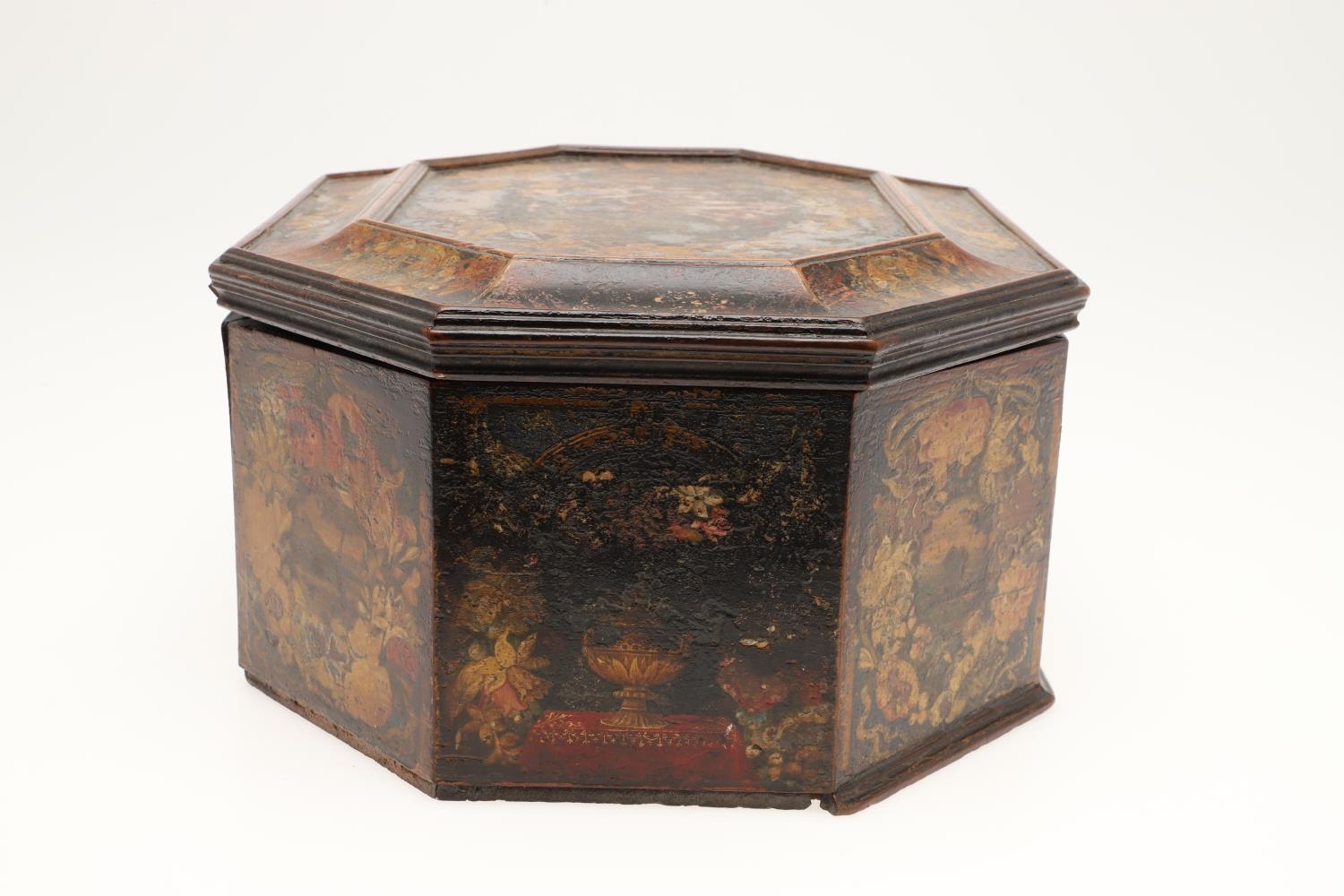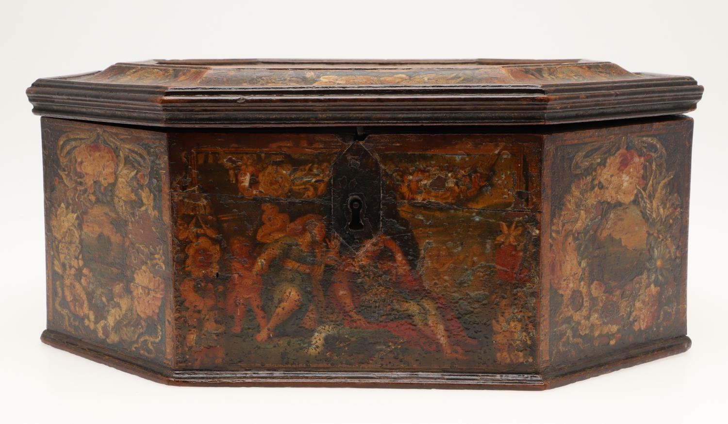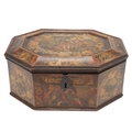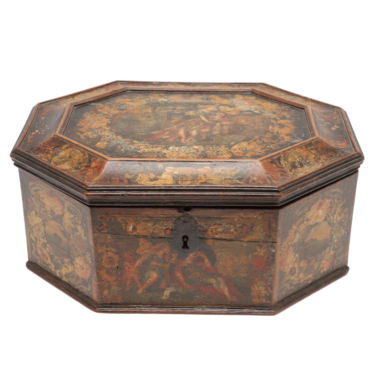 A CONTINENTAL 18TH CENTURY OCTAGONAL PAINTED 'MARRIAGE' BOX. the hinged lid and sides decorated with scenes of a young couple and cupids, within borders of flowers and love motifs, height 15cm, width 35cm, depth 26cm.