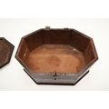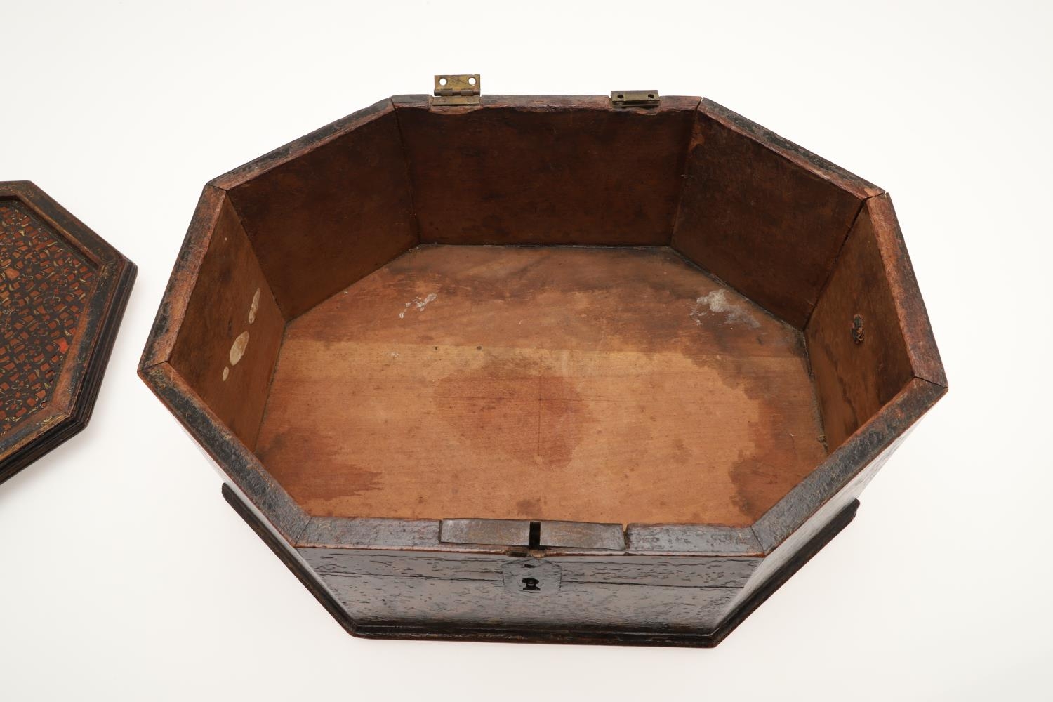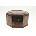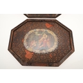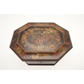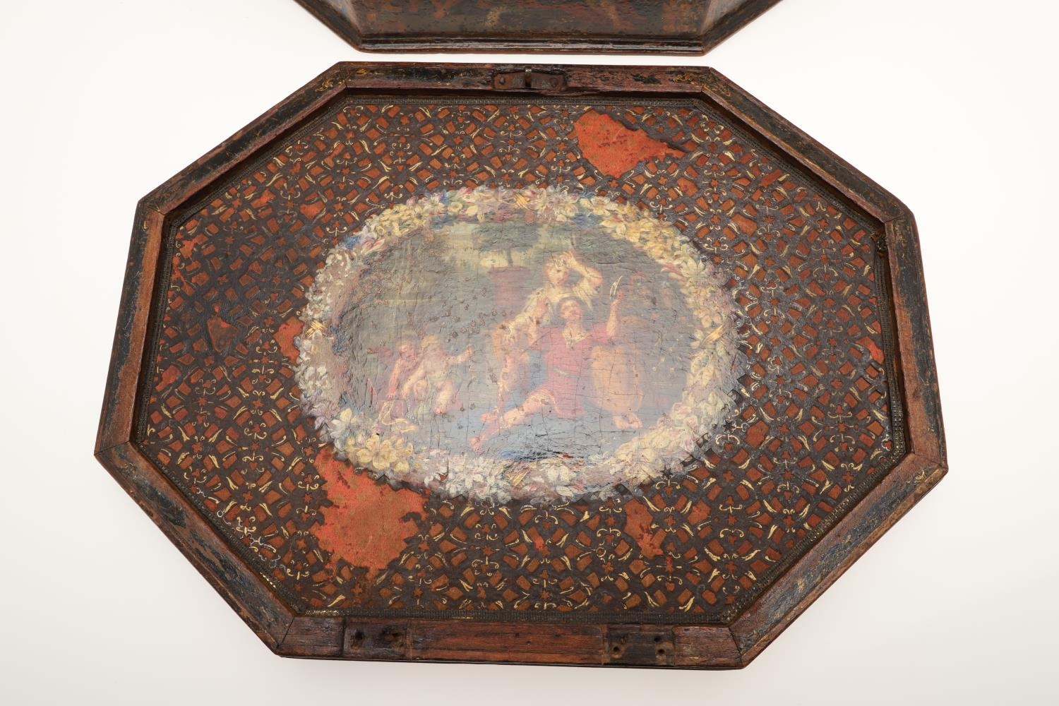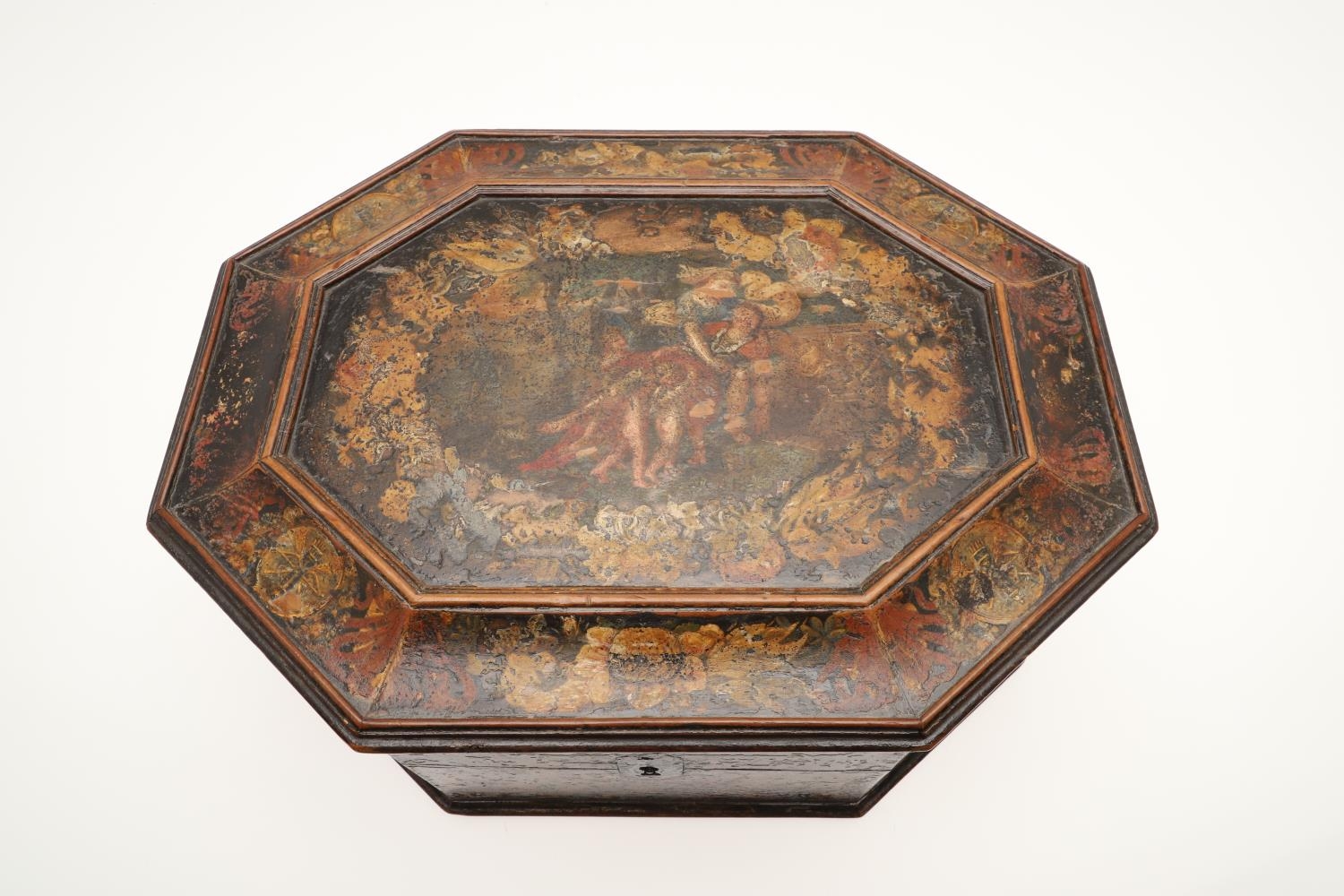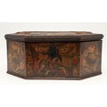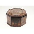 A CONTINENTAL 18TH CENTURY OCTAGONAL PAINTED 'MARRIAGE' BOX. the hinged lid and sides decorated with scenes of a young couple and cupids, within borders of flowers and love motifs, height 15cm, width 35cm, depth 26cm.
