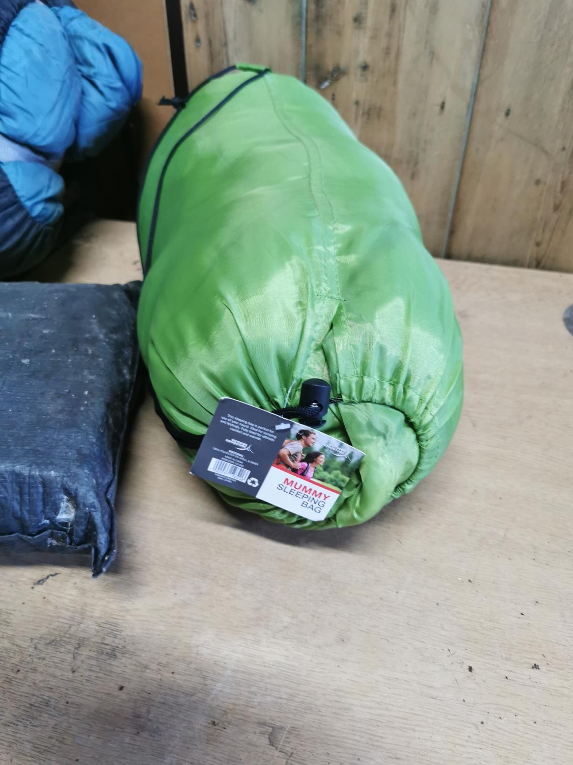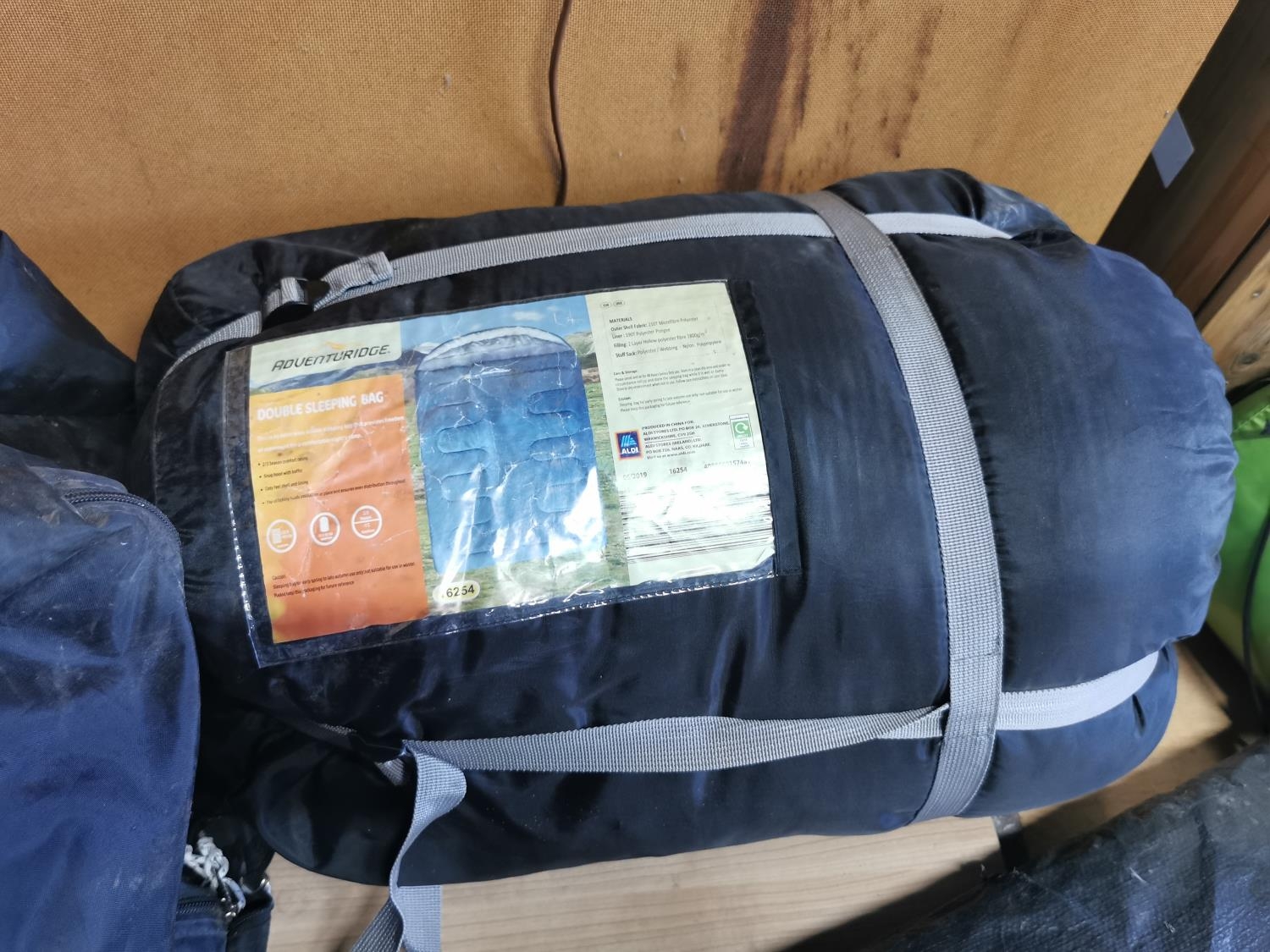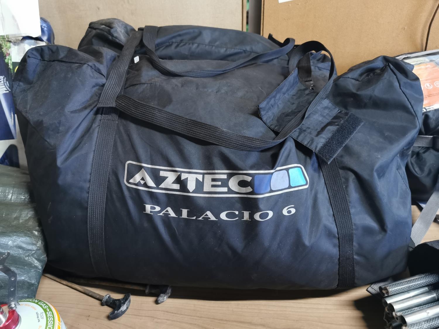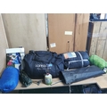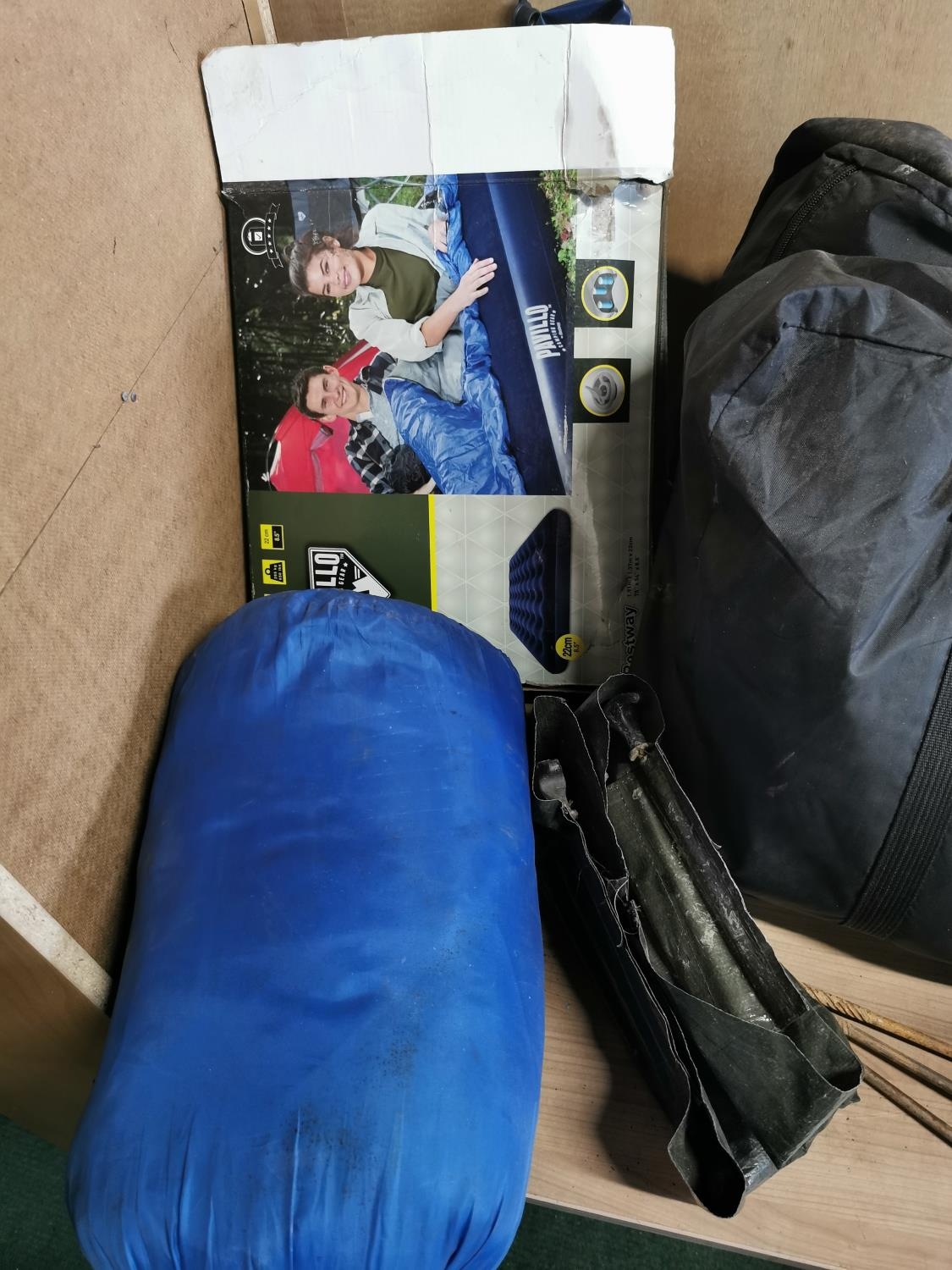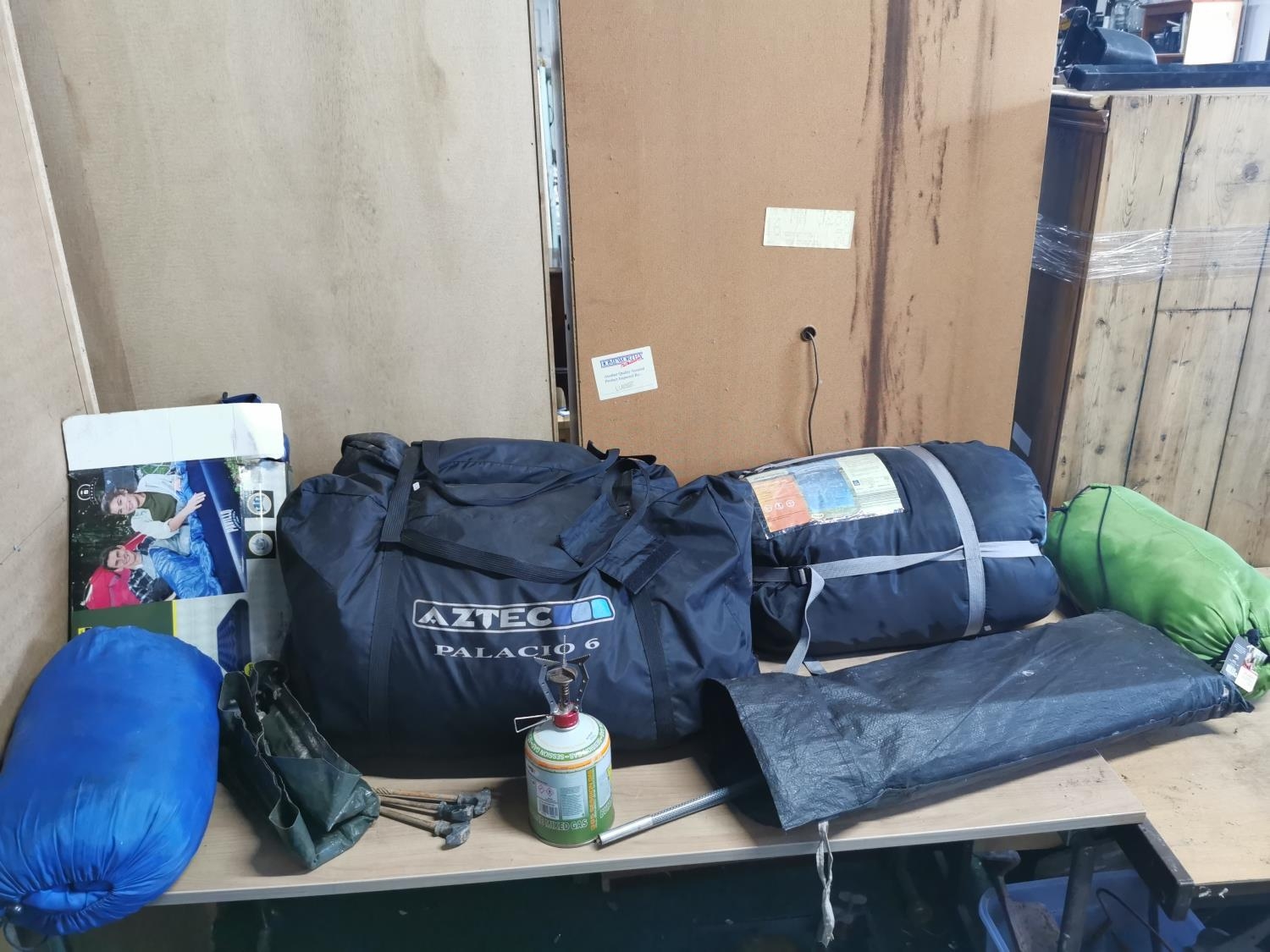 Job lot of camping equo plaacio 6 man tent, boxed air bed, three sleeping bags, new and unused camping gas stove etc