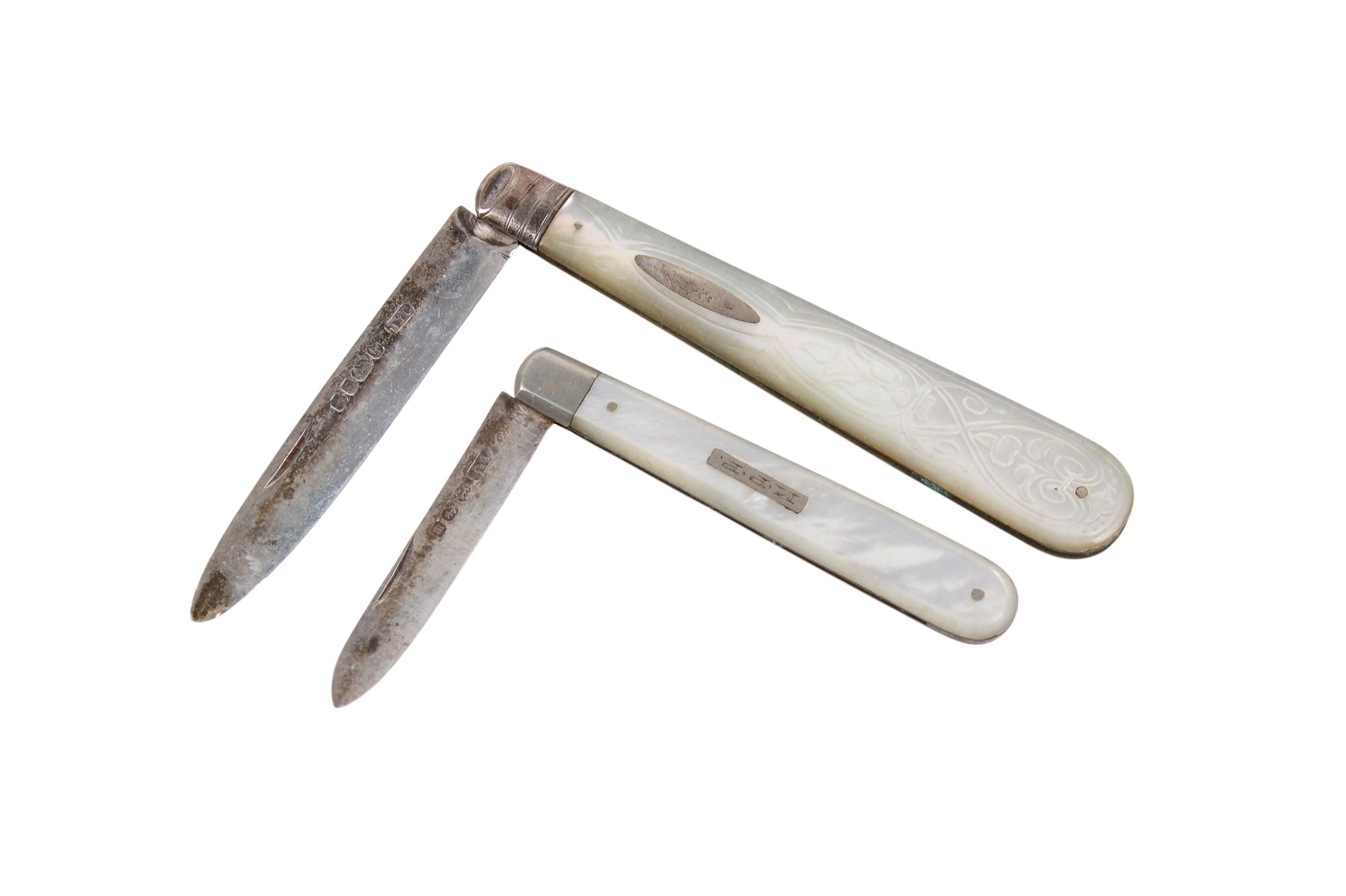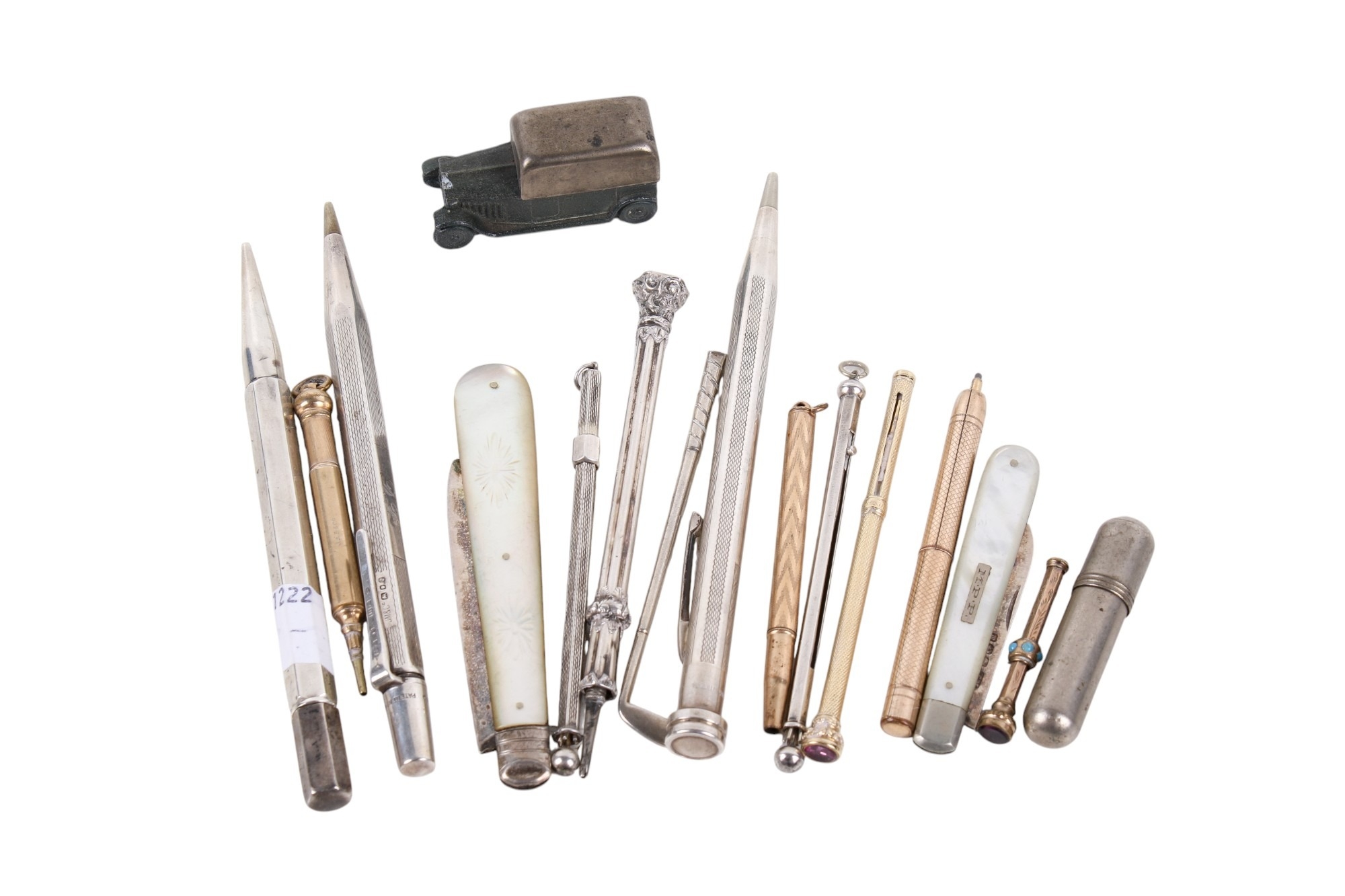 An assortment of Victorian and later silver and white metal collectables, comprising two fruit knives with mother-of-pearl handles and silver blades, eight propelling pencils, a diecast pencil sharpener modelled as a truck and three silver cased pens