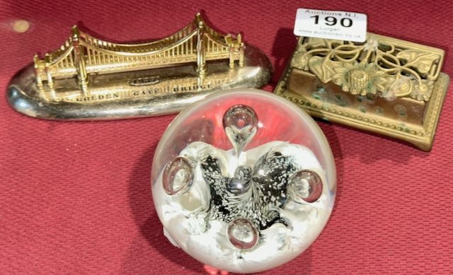 3pc Collectibles Incl Caithness Glass paperweight, Brass Trinket Box & Model Golden gate Bridge