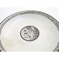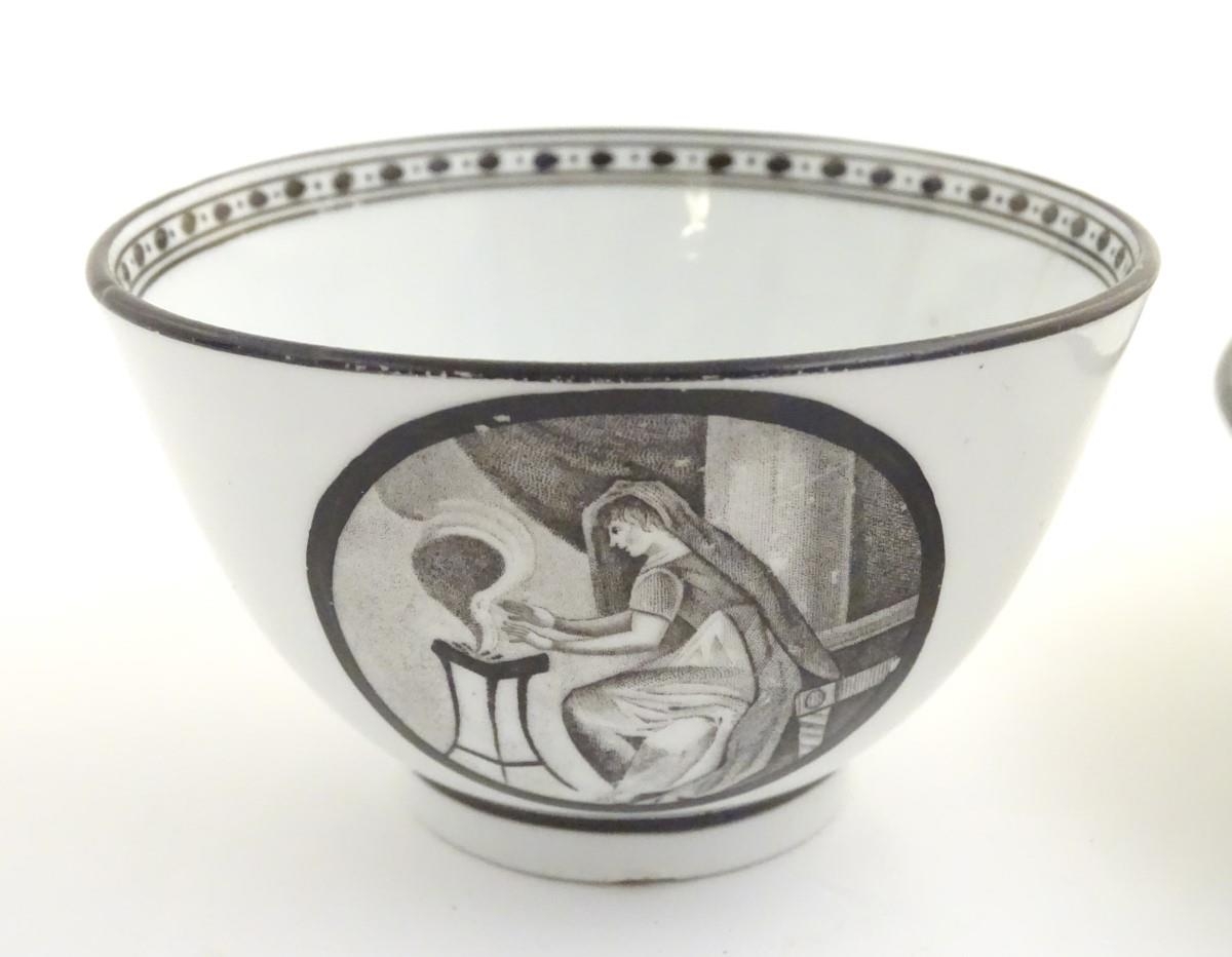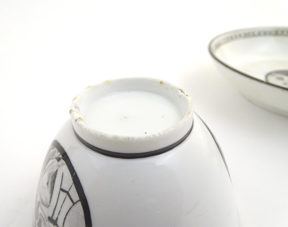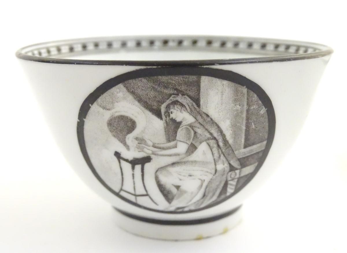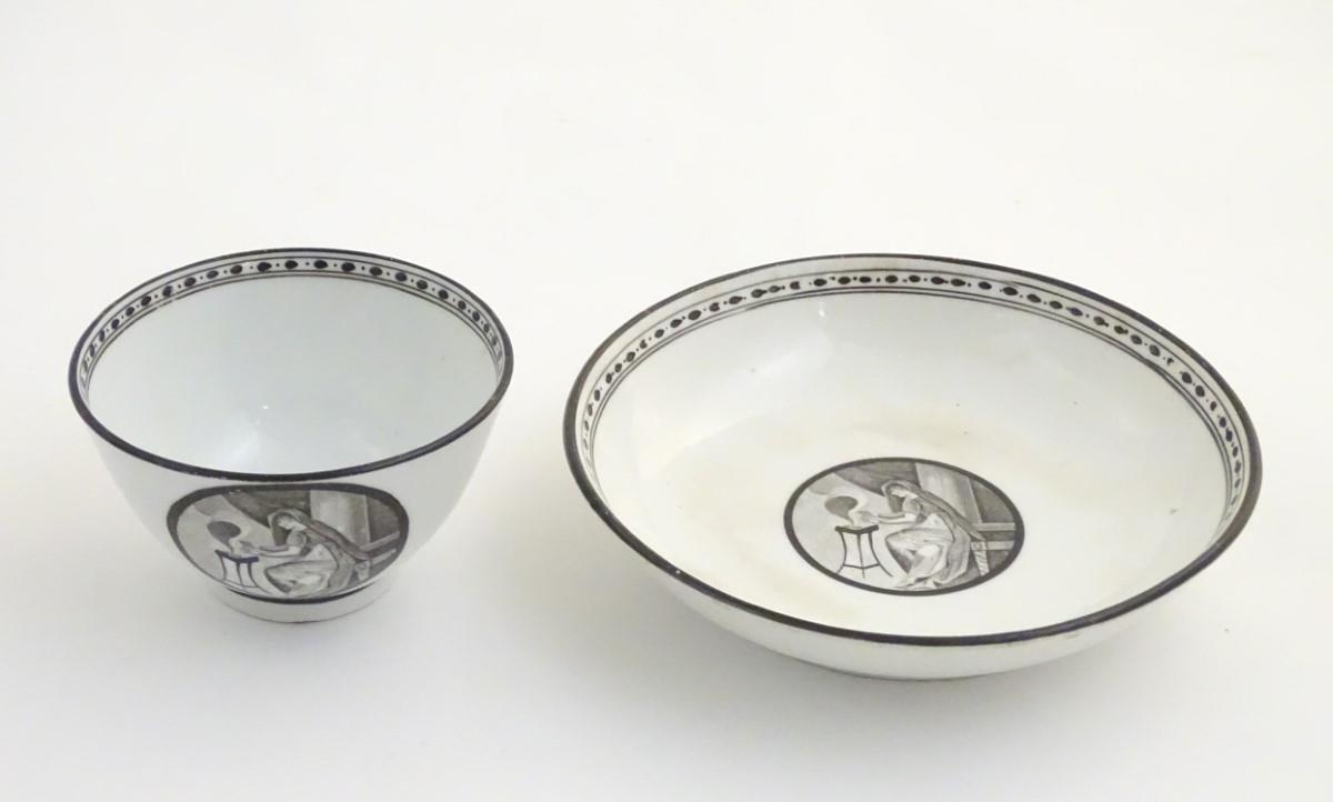 A 19thC tea bowl and saucer, decorated with monochrome roundels depicting a seated man warming by a fire, with a banded border. Saucer approx. 5 1/2'' diameter.