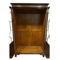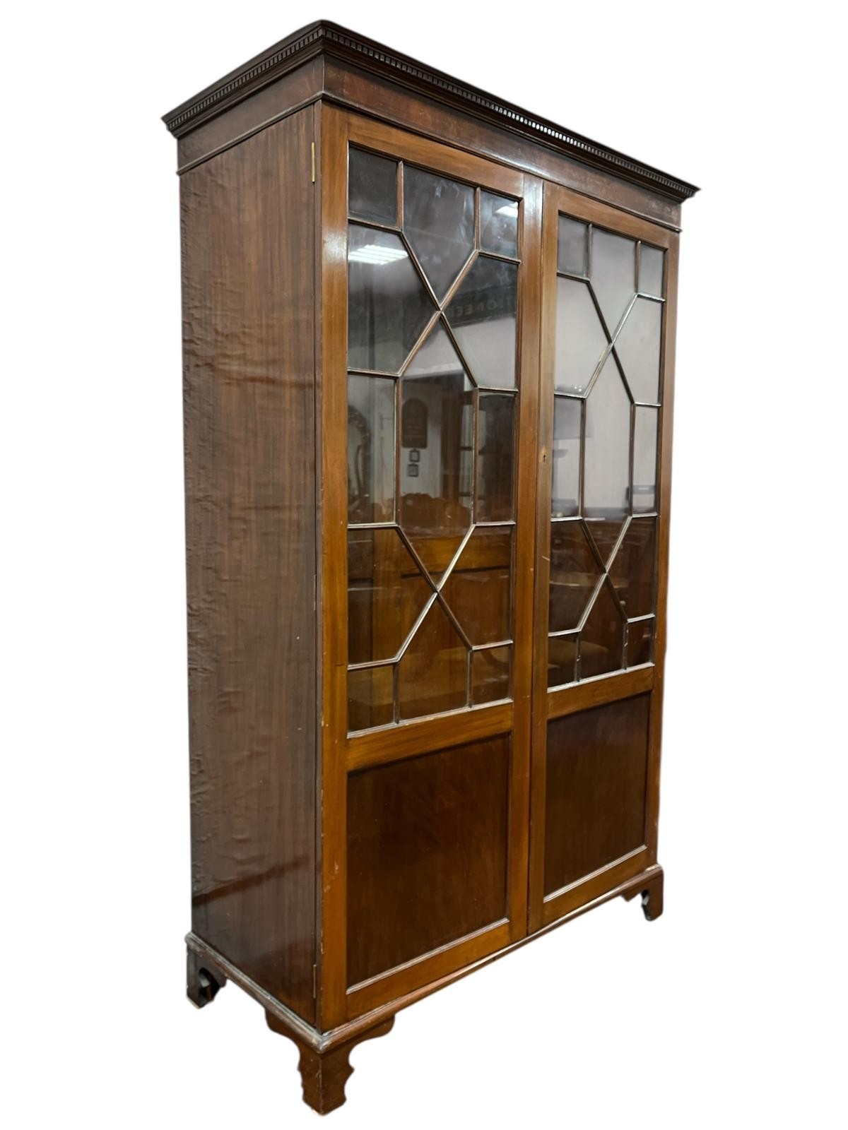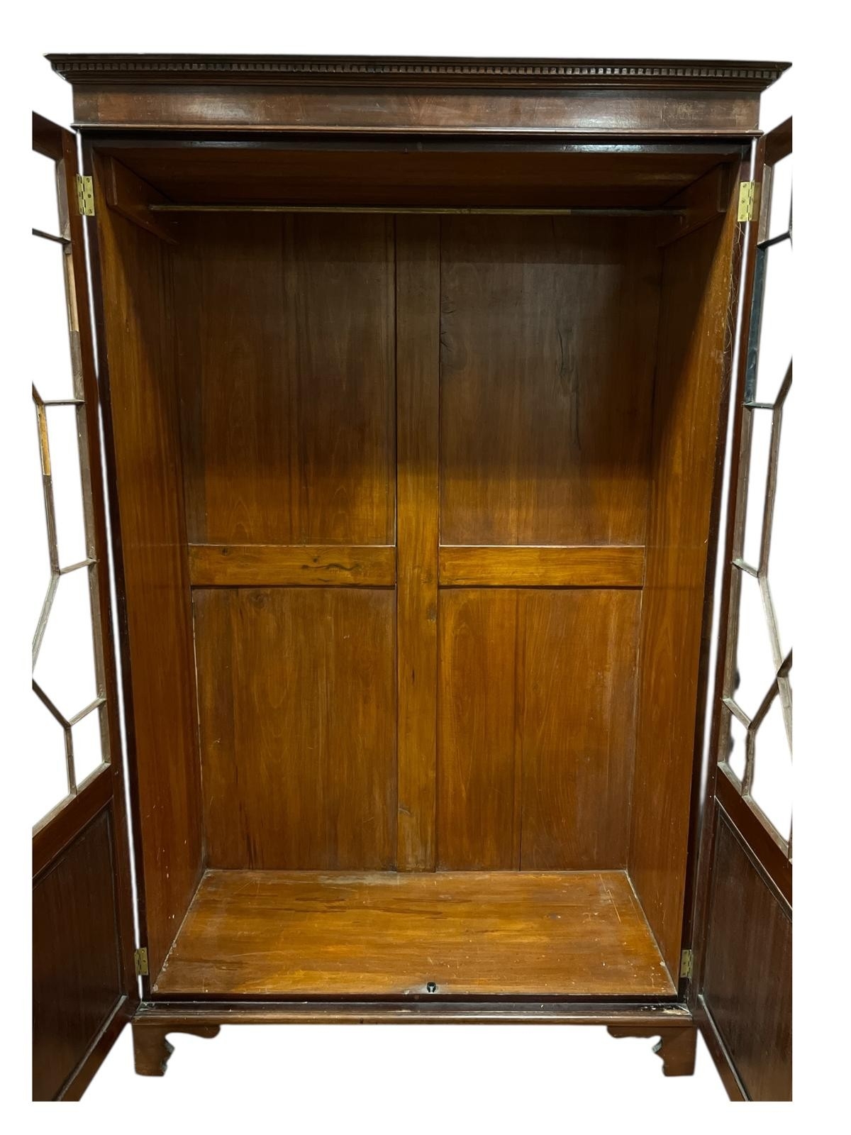 A VINTAGE MAHOGANY DIAMOND DOOR WARDROBE the dentil moulded cornice above a pair of astragal glazed doors containing a hanging rail on shaped bracket feet 93cm (h) x 121cm (w) x 55cm (d)