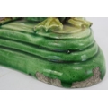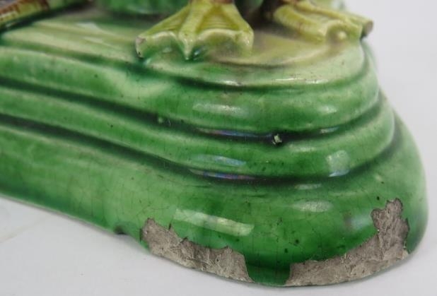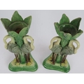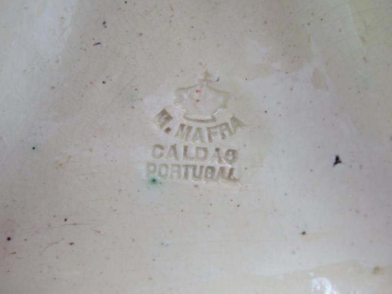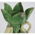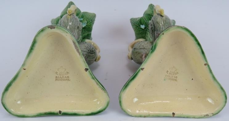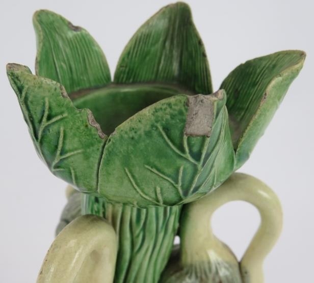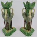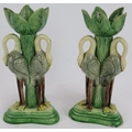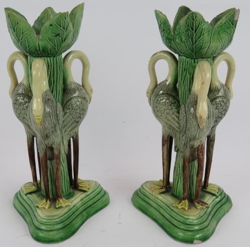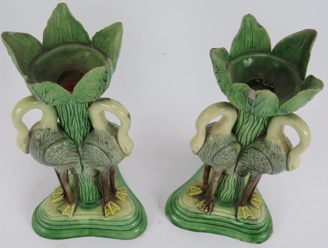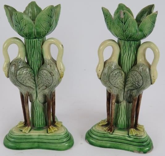 A pair of 19th Century Portuguese Majolica stork candlesticks, by Manuel Mafra. Both bear incised marks to base. Height: 23.5cm.