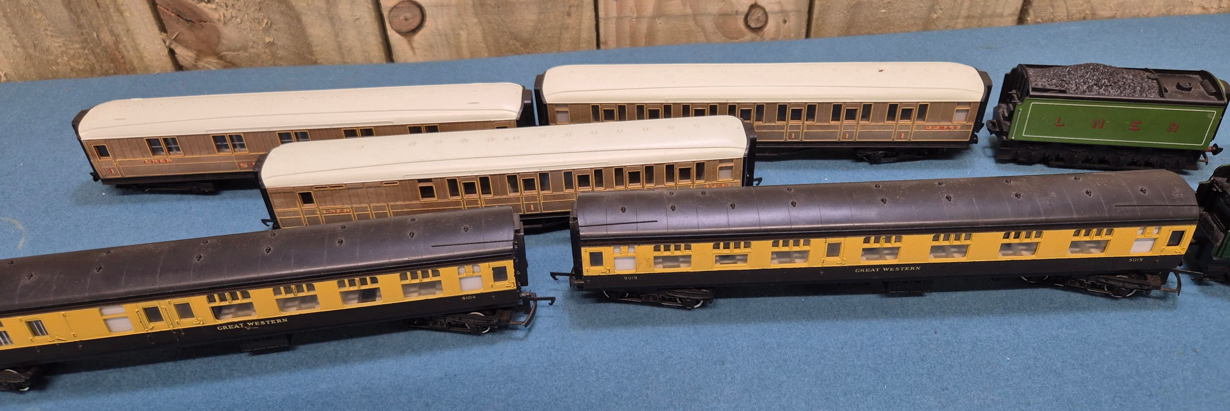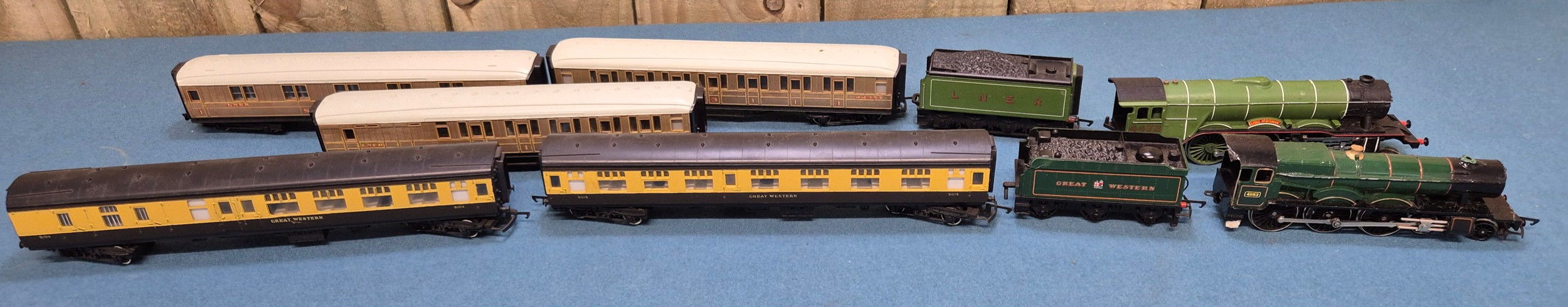 Tray of Hornby Loco's, tenders and carriages; Flying Scotsman and Great Western.