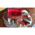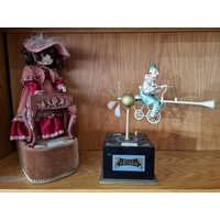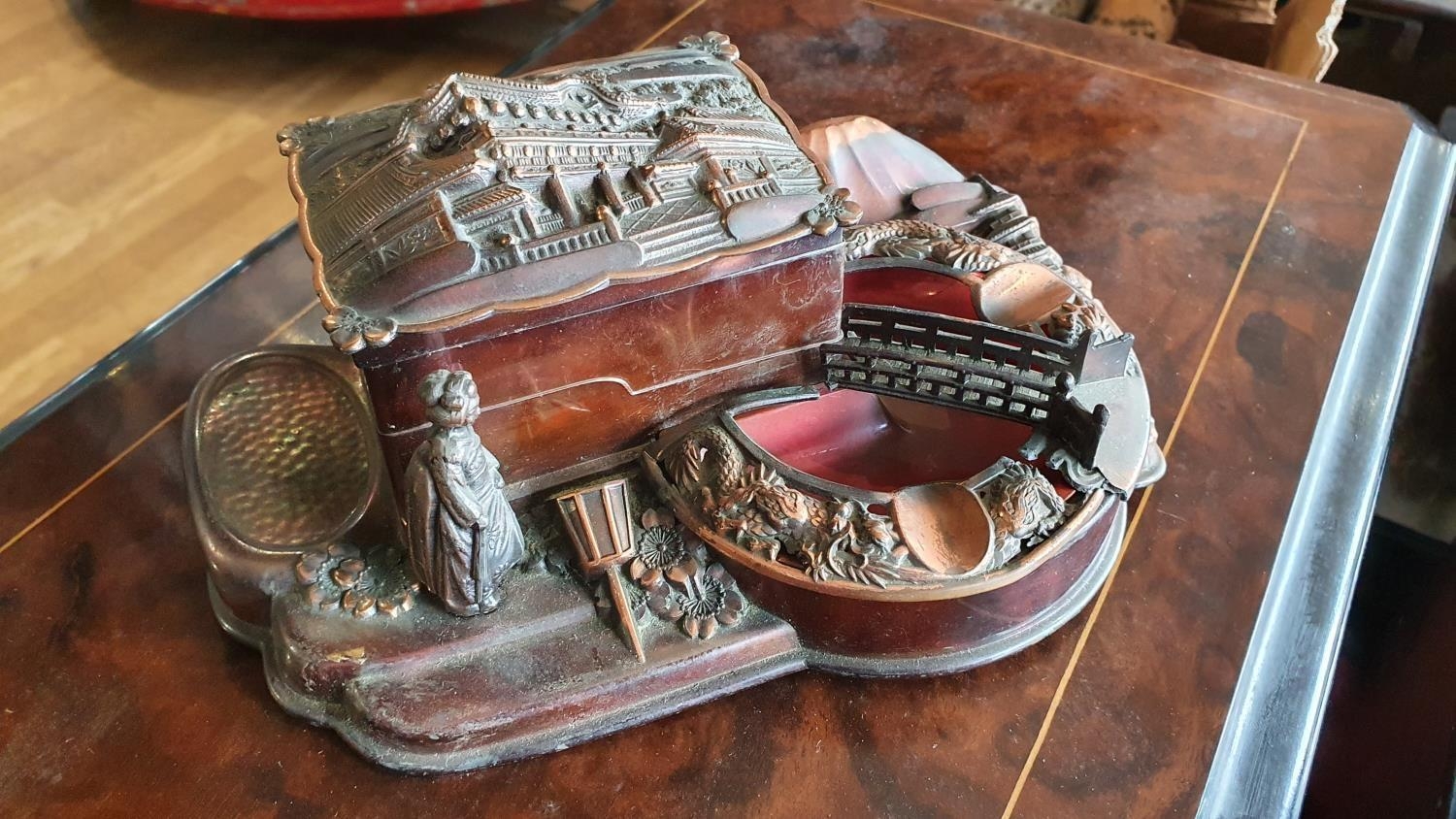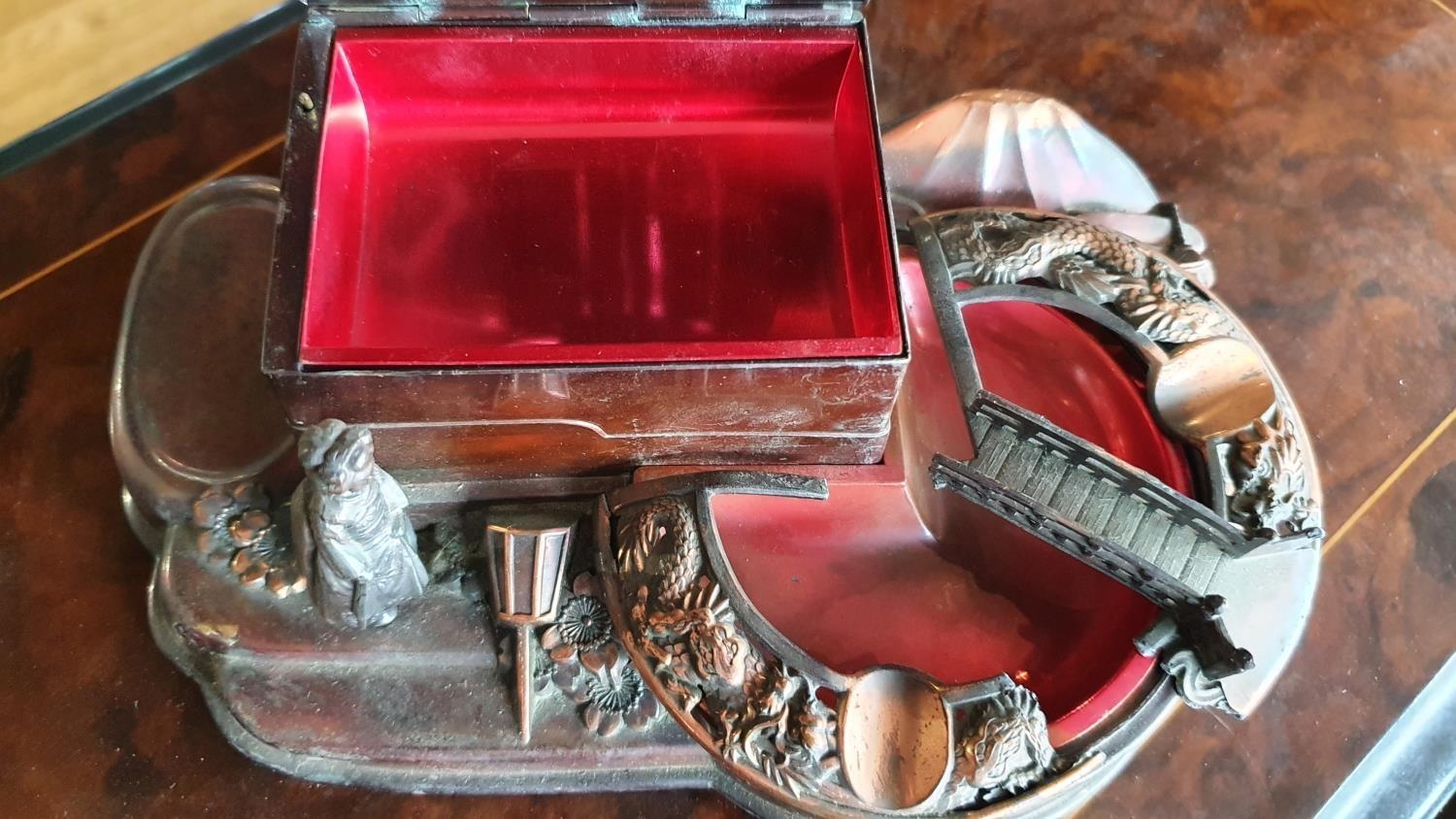 A Japanese metal musical box/smokers companion, in the form of a pagoda cigarette box and an ashtray (A/F), the movement by Pigeon, 19 x 12 x 9 cm, working as at 17/04/21.