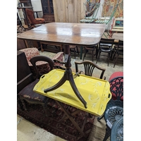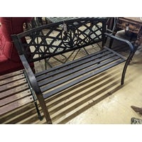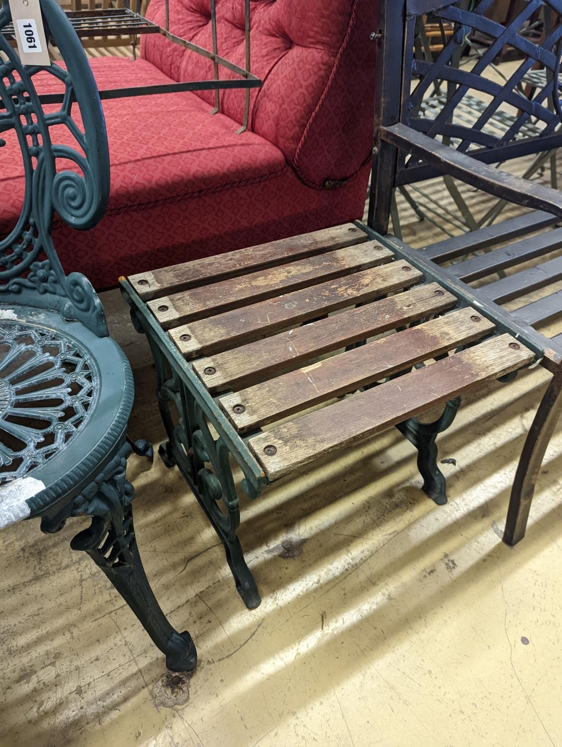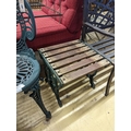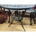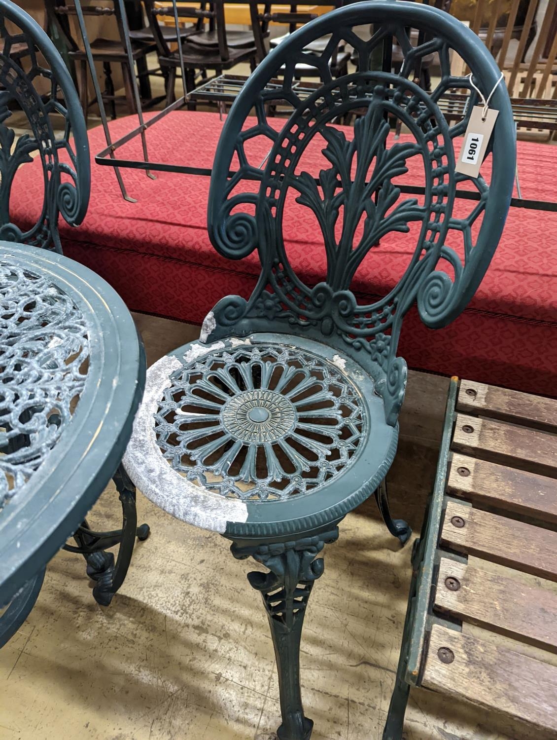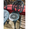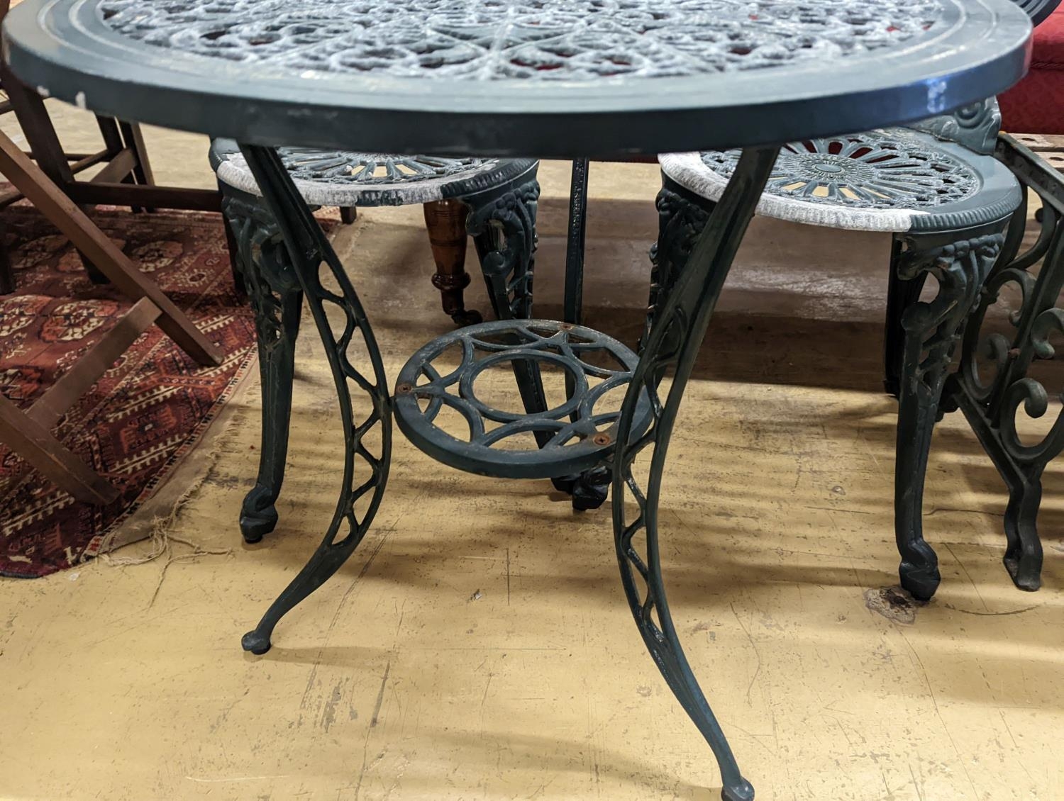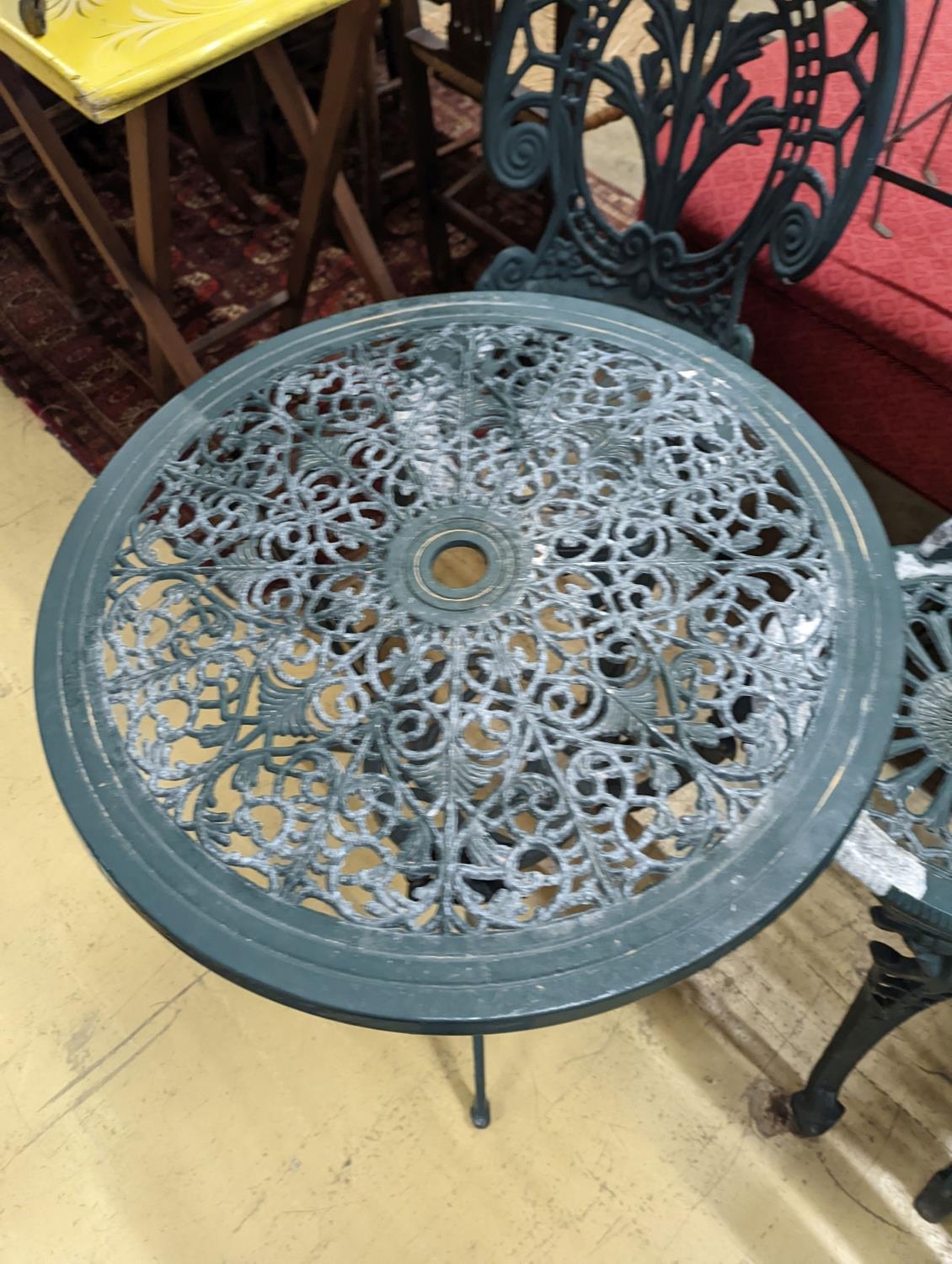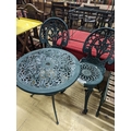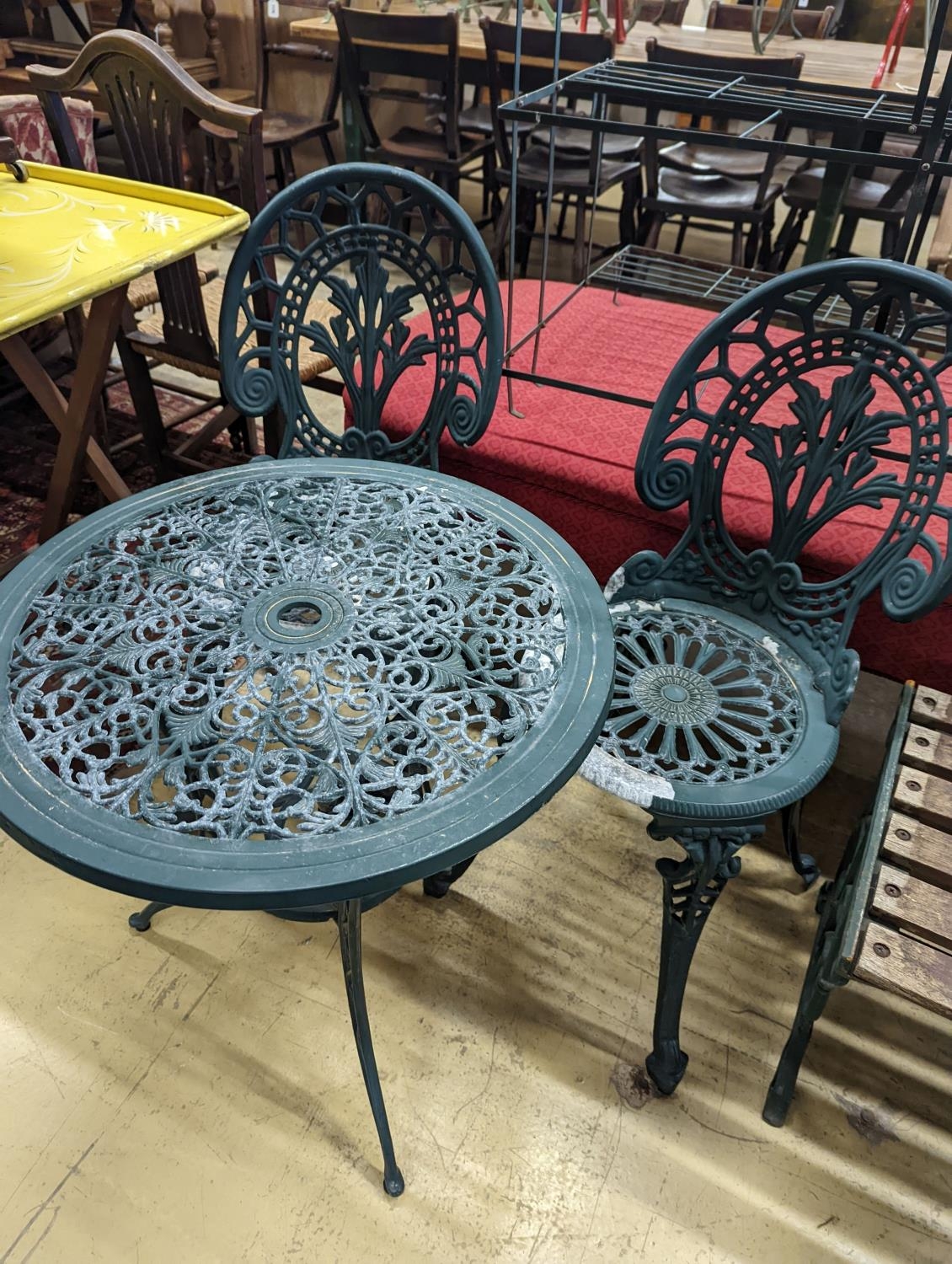 A circular painted aluminium garden table, diameter 60cm, height 62cm together with two chairs