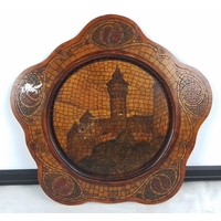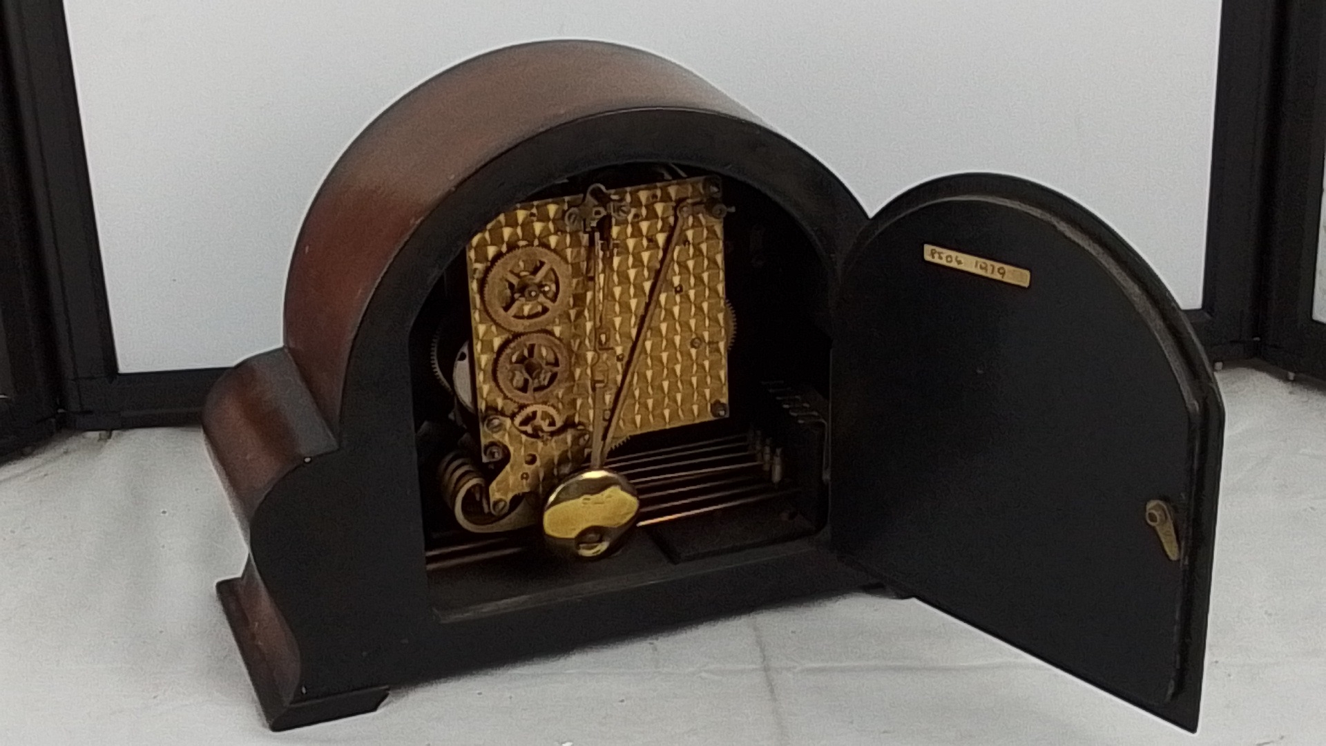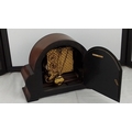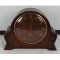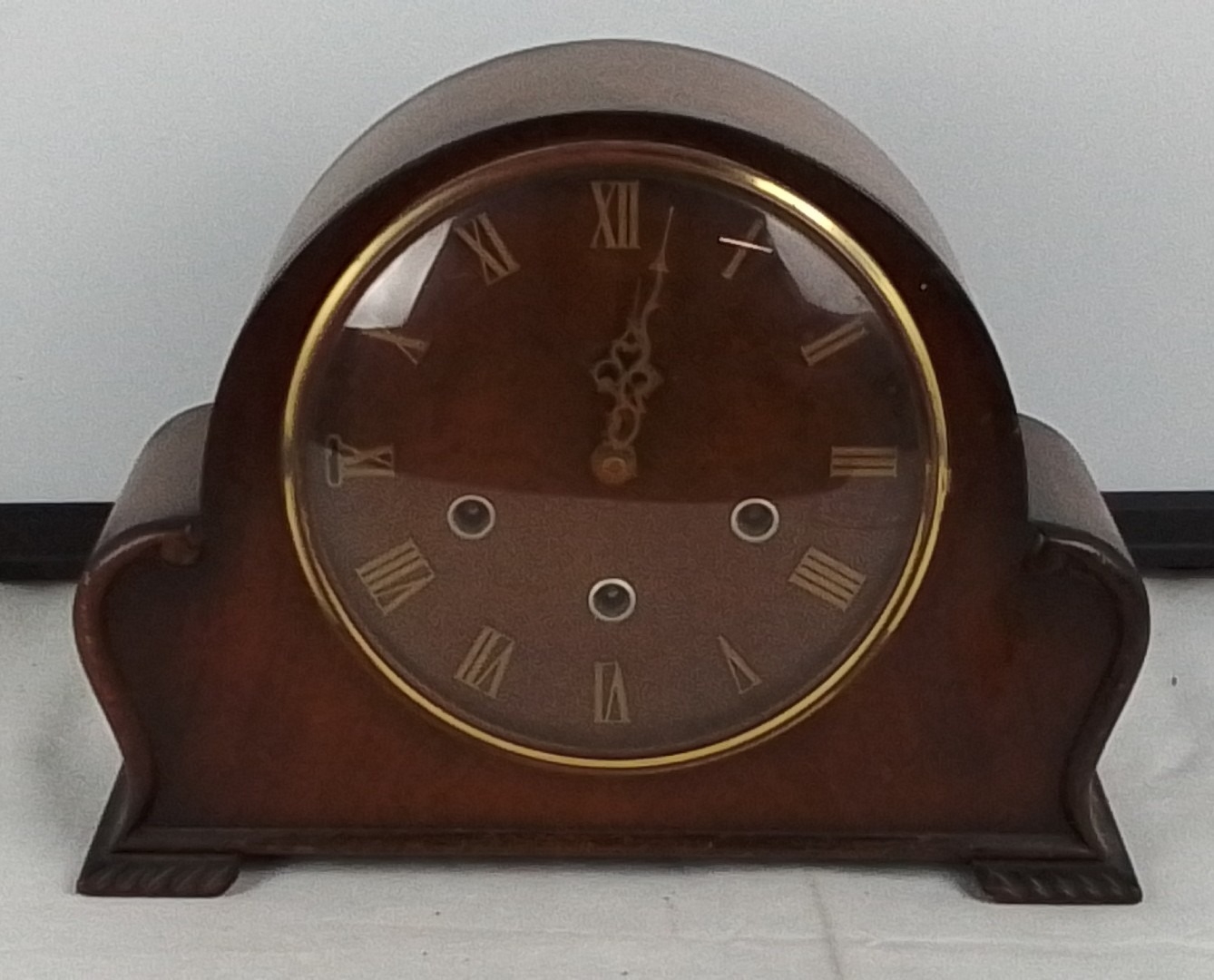 A vintage domed mantel clock with arched case, Roman numeral dial, and three winding arbors, fitted with a brass eight-day movement and gong strike, with hinged rear door.