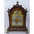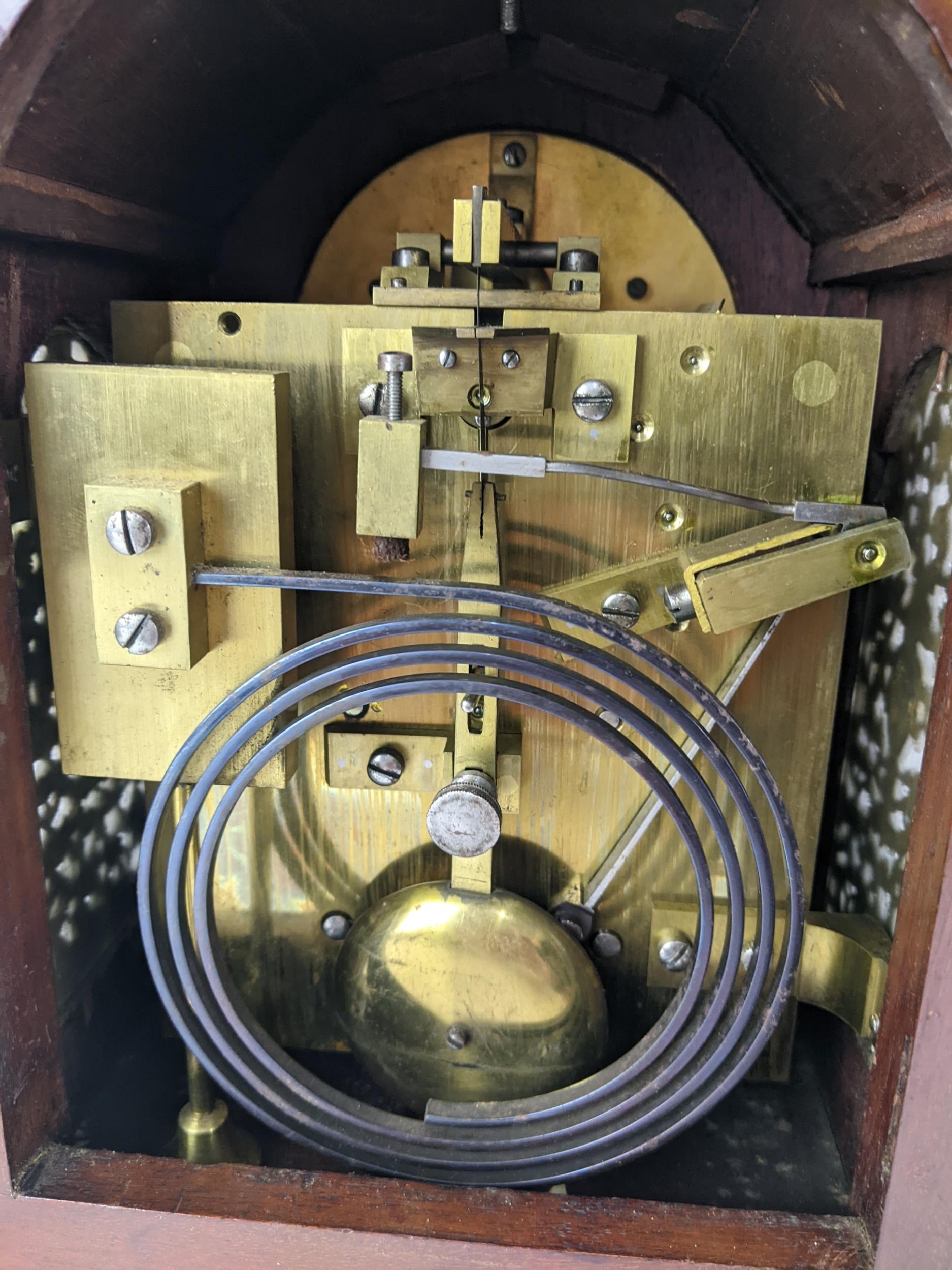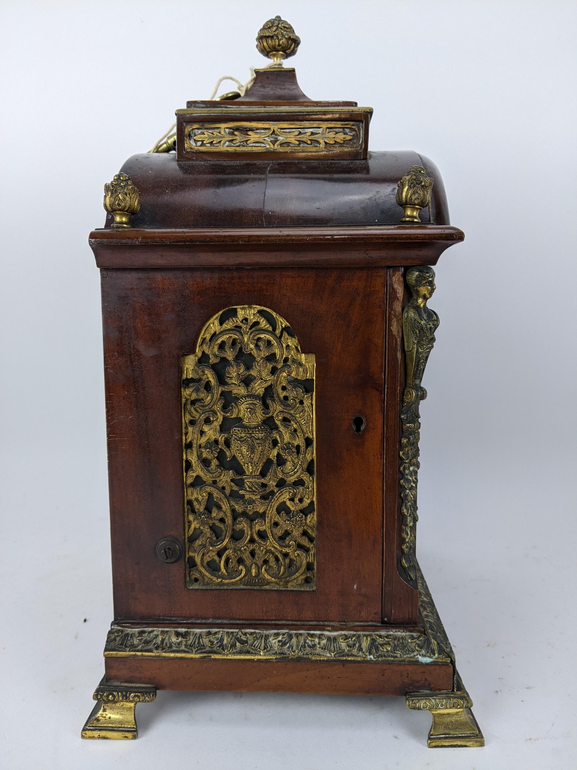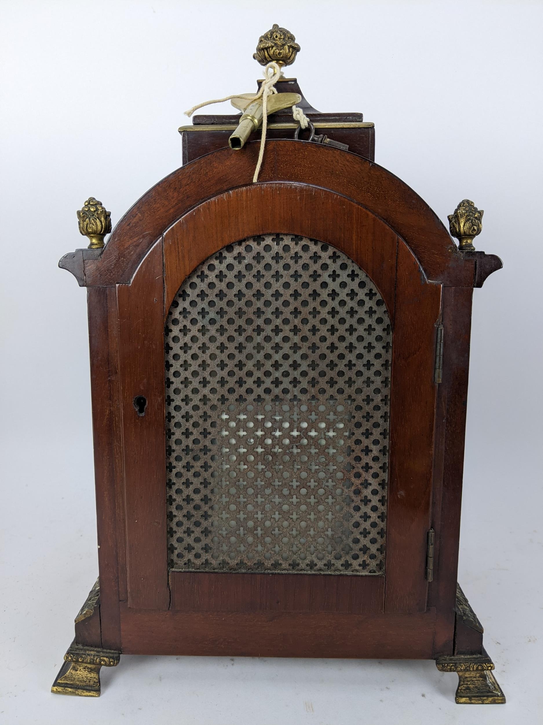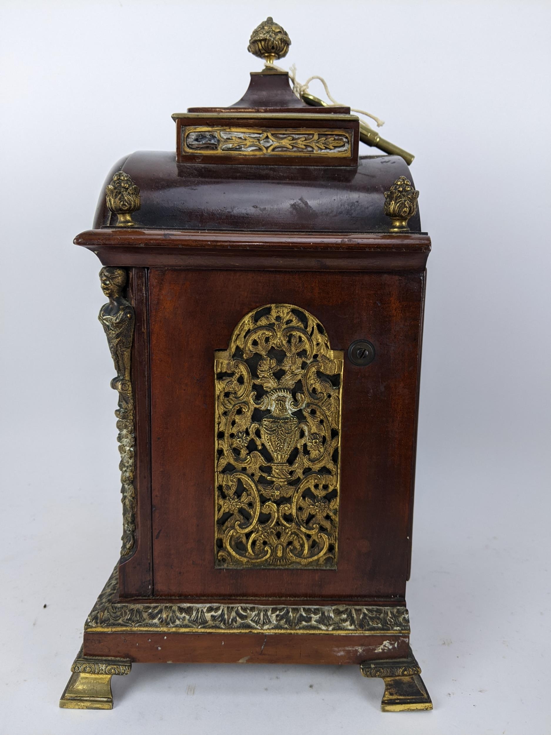 A late 19th/early 20th century mahogany bracket clock, the case having basket of flowers finials, gilt metal mounts and pierced grilles to sides and back, the arched top dial have a matted centre, silvered chapter ring, slow/fast regulating dial and an ornate gilt metal pierced surround, the 8 day double chain fusee movement striking on a single gong, 36cm high x 23.5cm wide