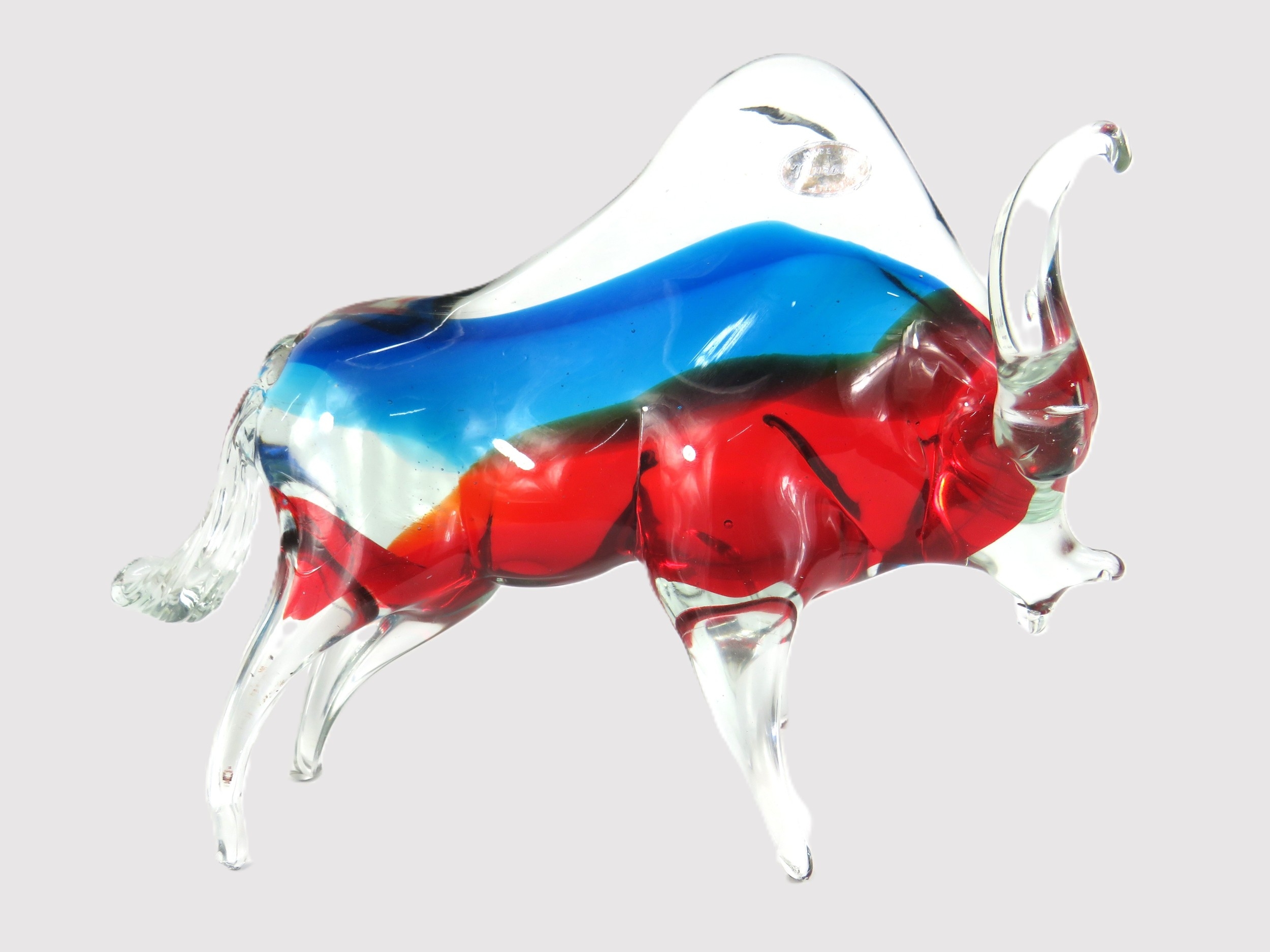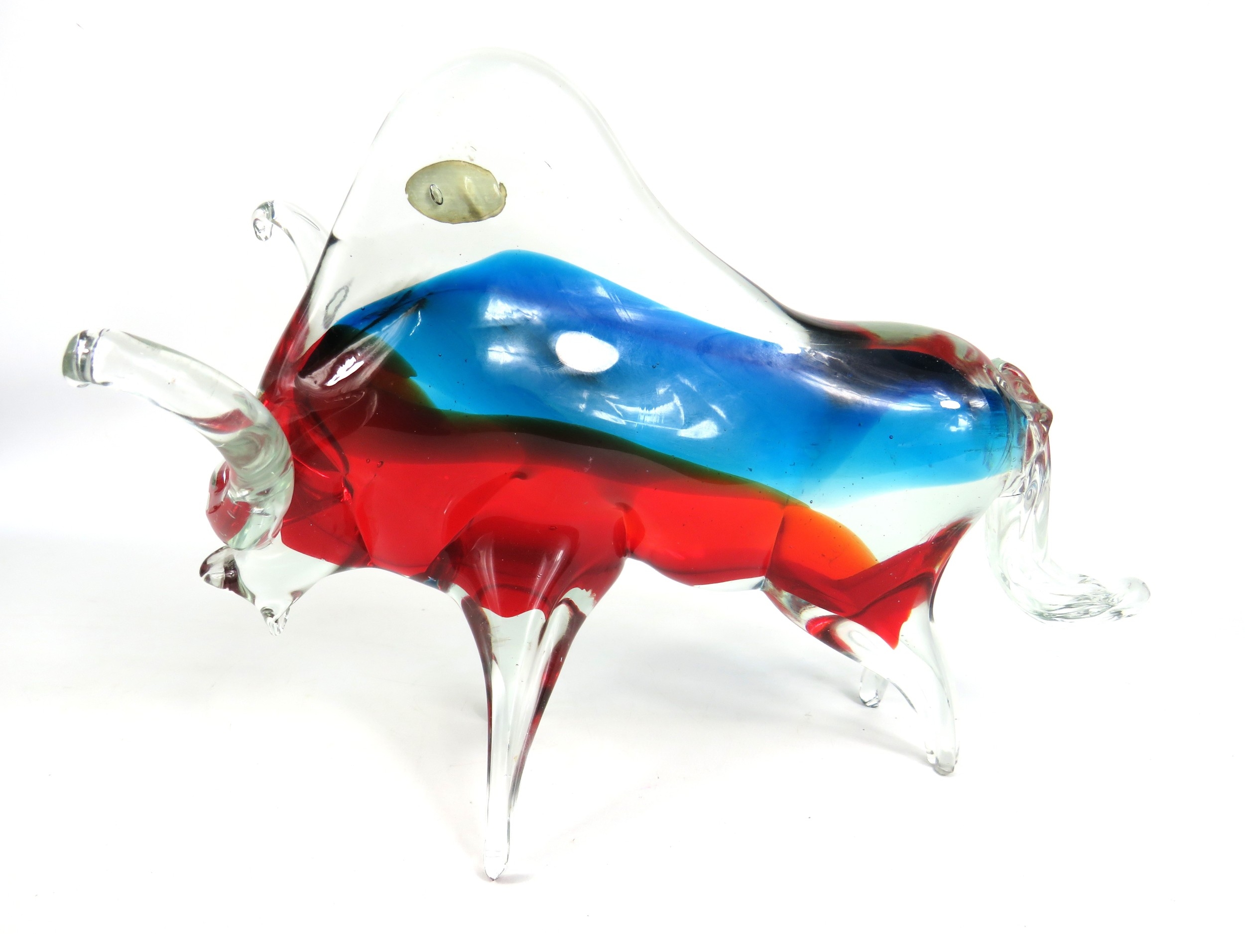 Murano glass bull figurine in red and blue tones - 21cm tall