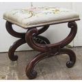 A late Regency period X framed centre stool in mahogany with hand worked tapestry top, 45cm square