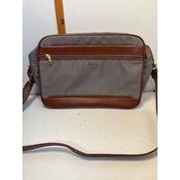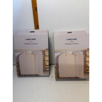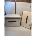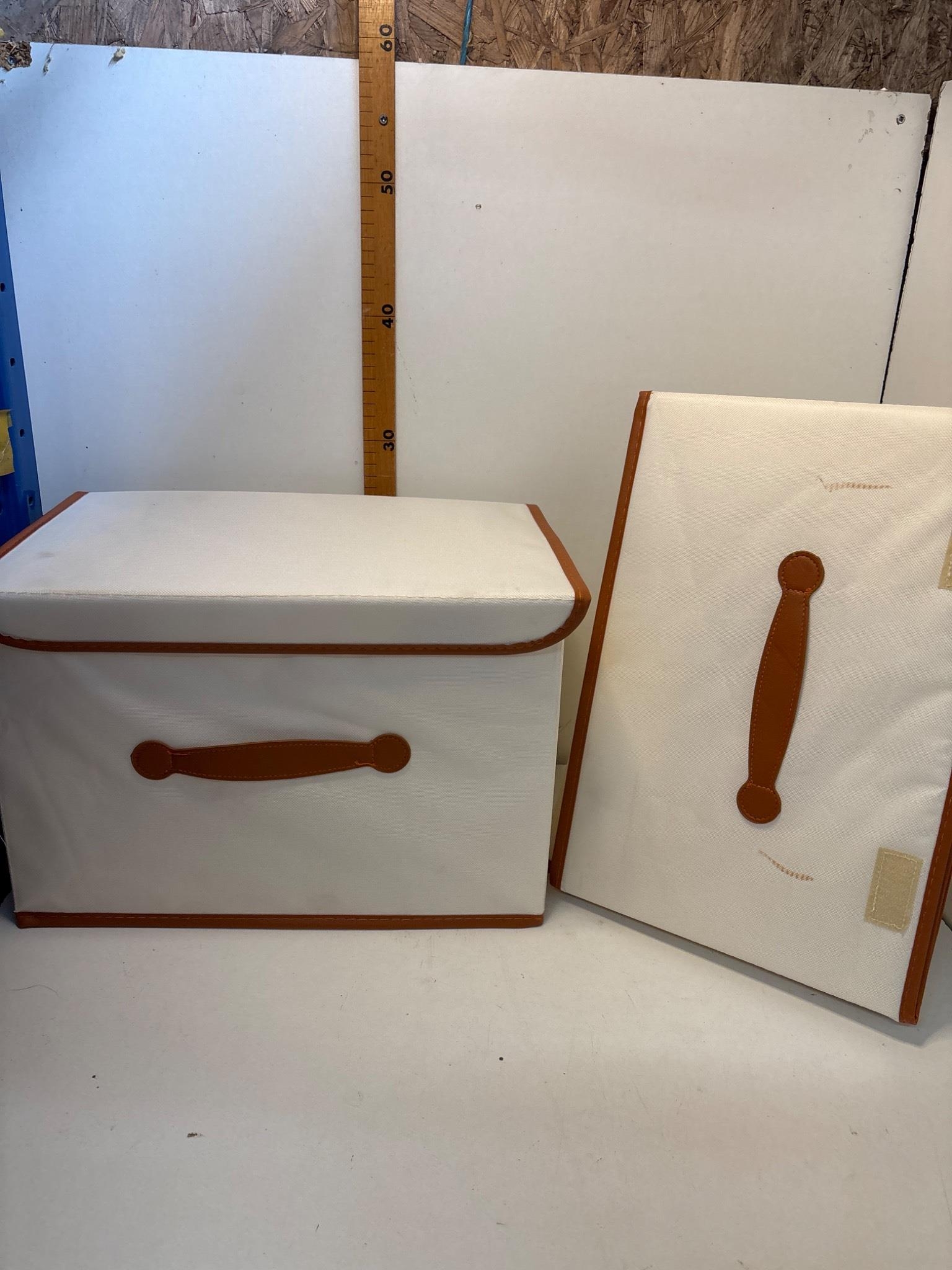 Two foldable storage boxes with lids, featuring a durable white fabric design accented by brown handles and edges. Collapsible for convenience.