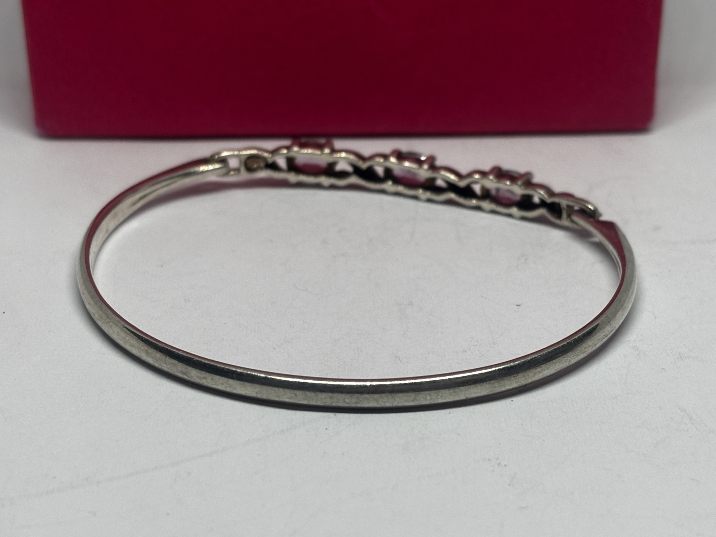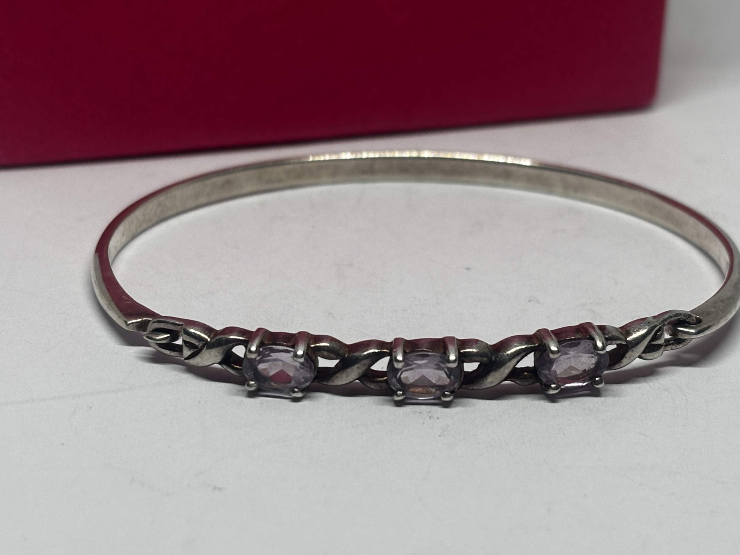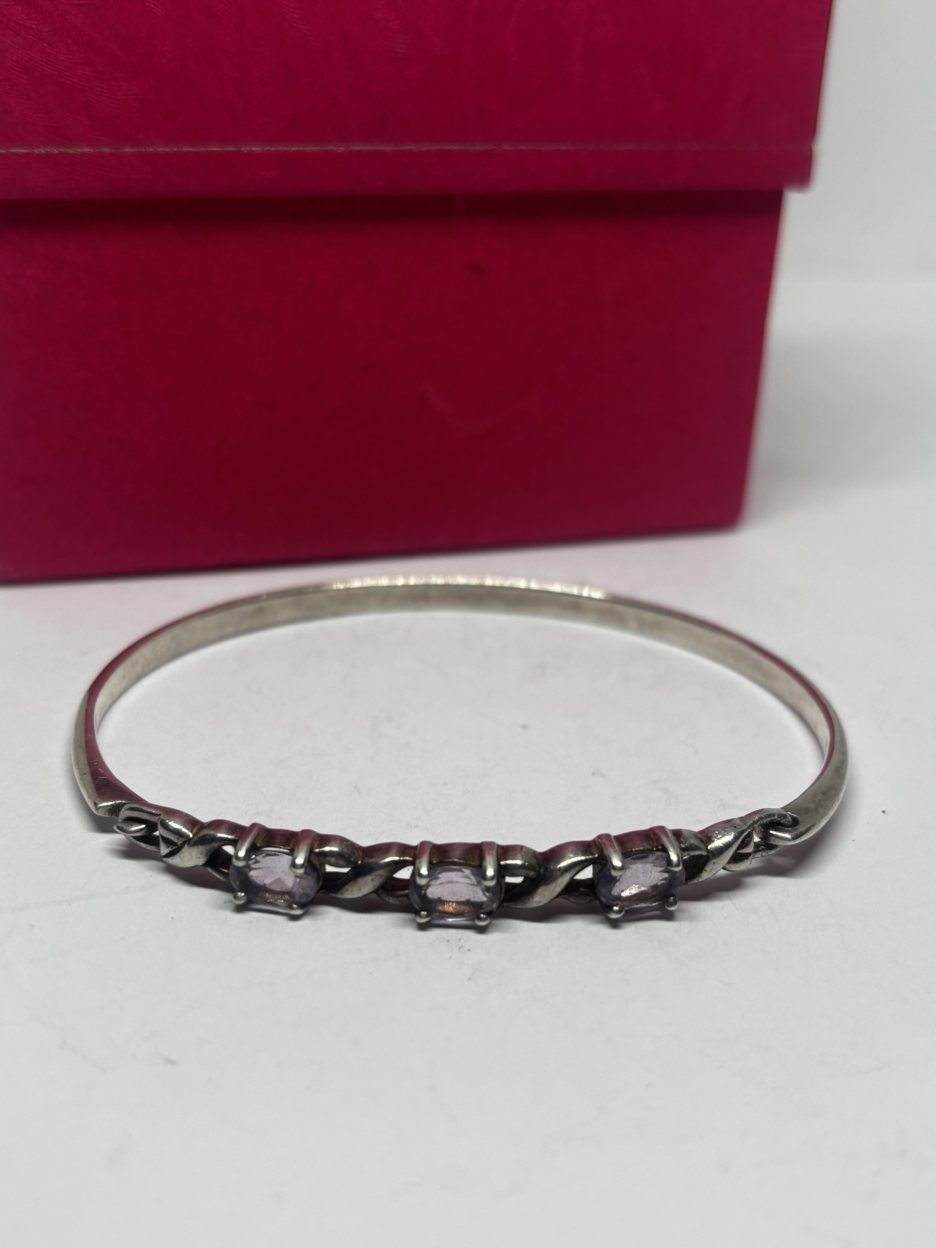AN AMETHYST BANGLE GROSS WEIGHT 12.01 GRAMS IN A PRESENTATION BOX