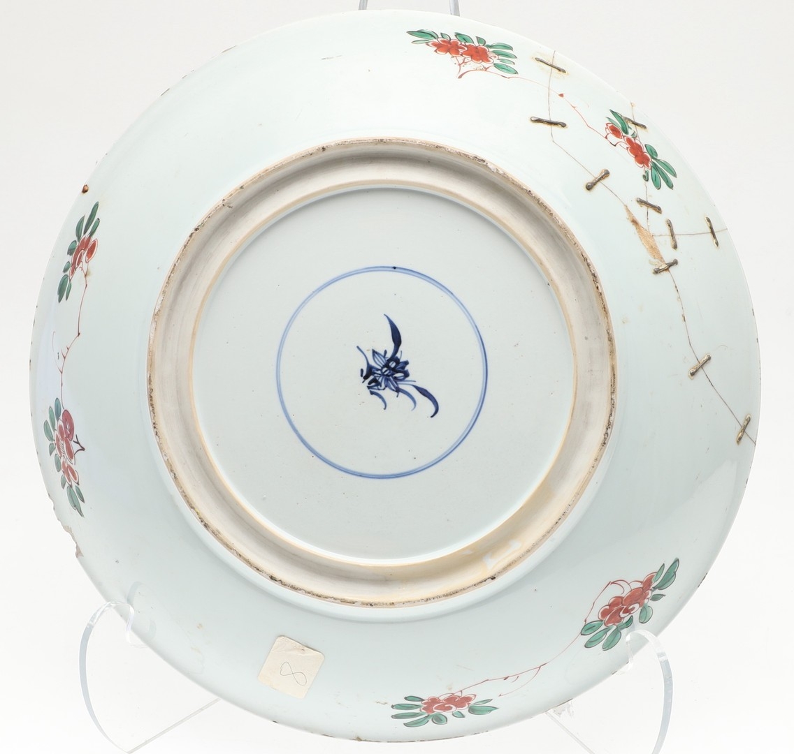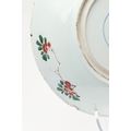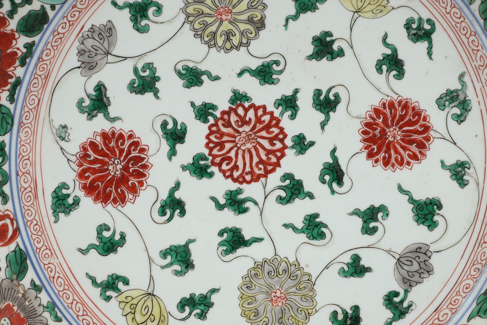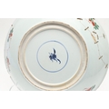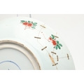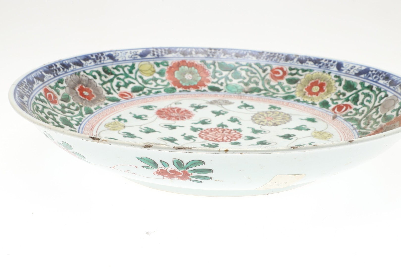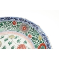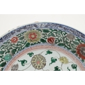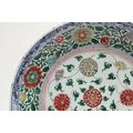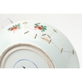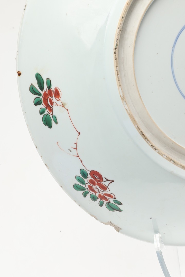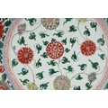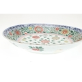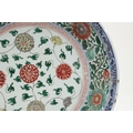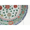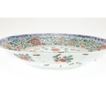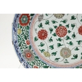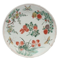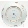 LARGE CHINESE FAMILLE VERTE DISH. Kangxi period (1662-1722), the large shallow dish painted with a variey of flowers and foliage, the rim with further blue and white flowers and with further decoration to the reverse. With a painted mark within a double circle to the base, damages. 38cms diameter.
