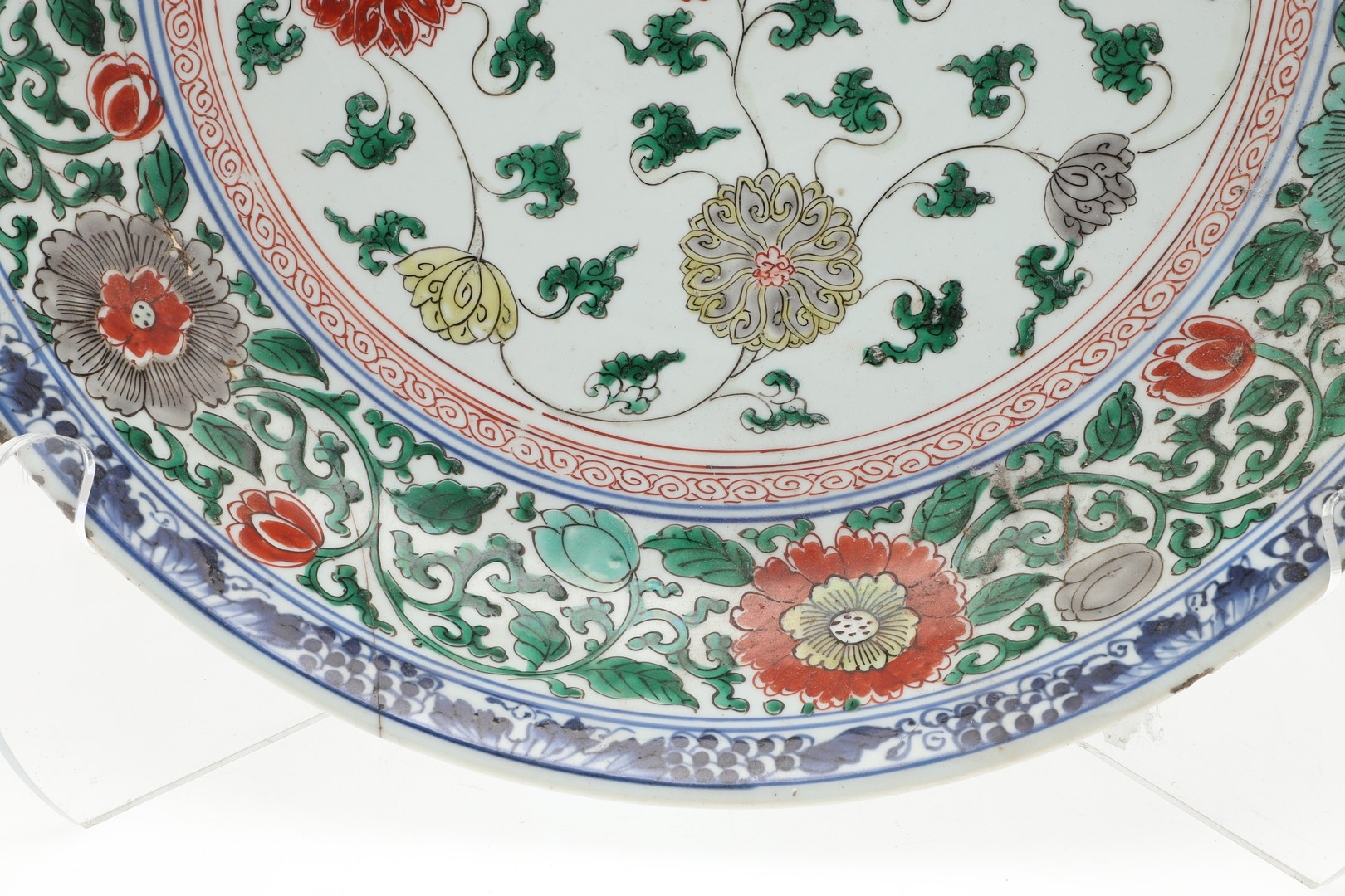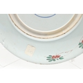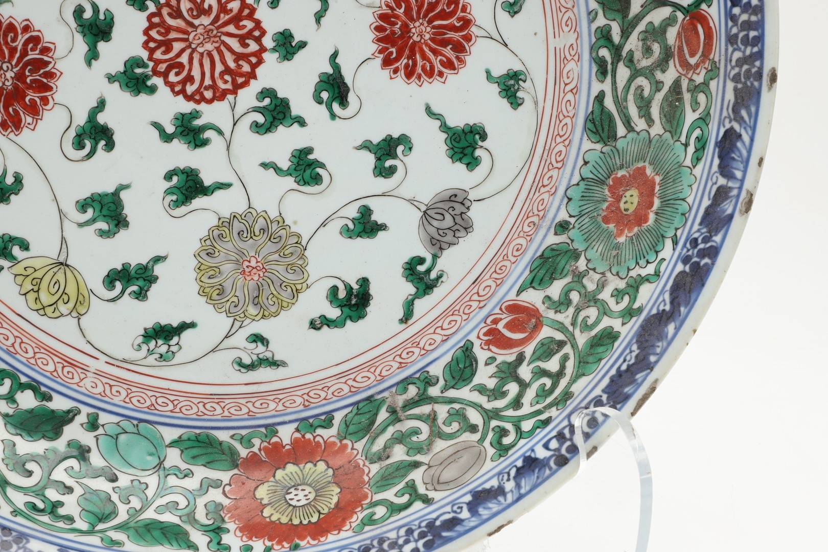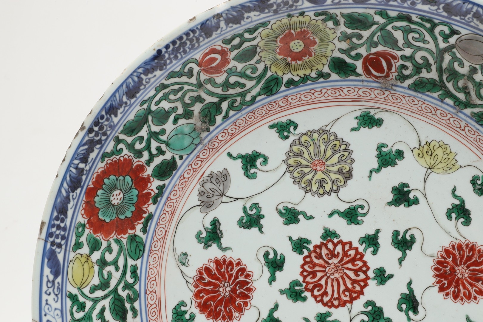 LARGE CHINESE FAMILLE VERTE DISH. Kangxi period (1662-1722), the large shallow dish painted with a variey of flowers and foliage, the rim with further blue and white flowers and with further decoration to the reverse. With a painted mark within a double circle to the base, damages. 38cms diameter.