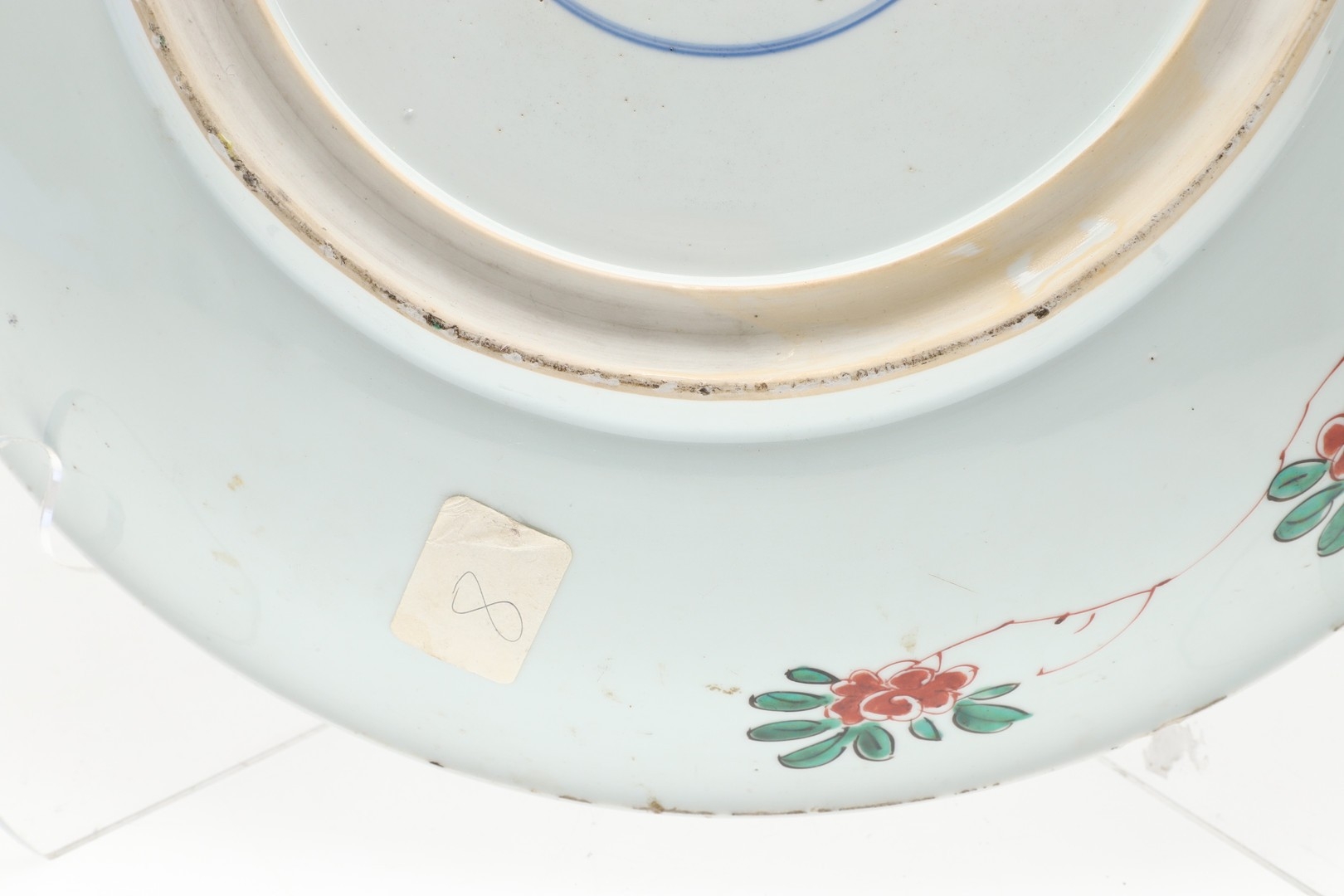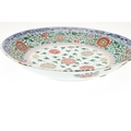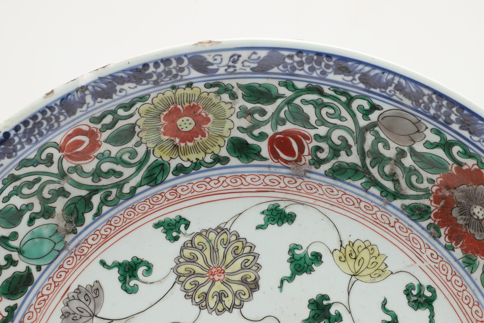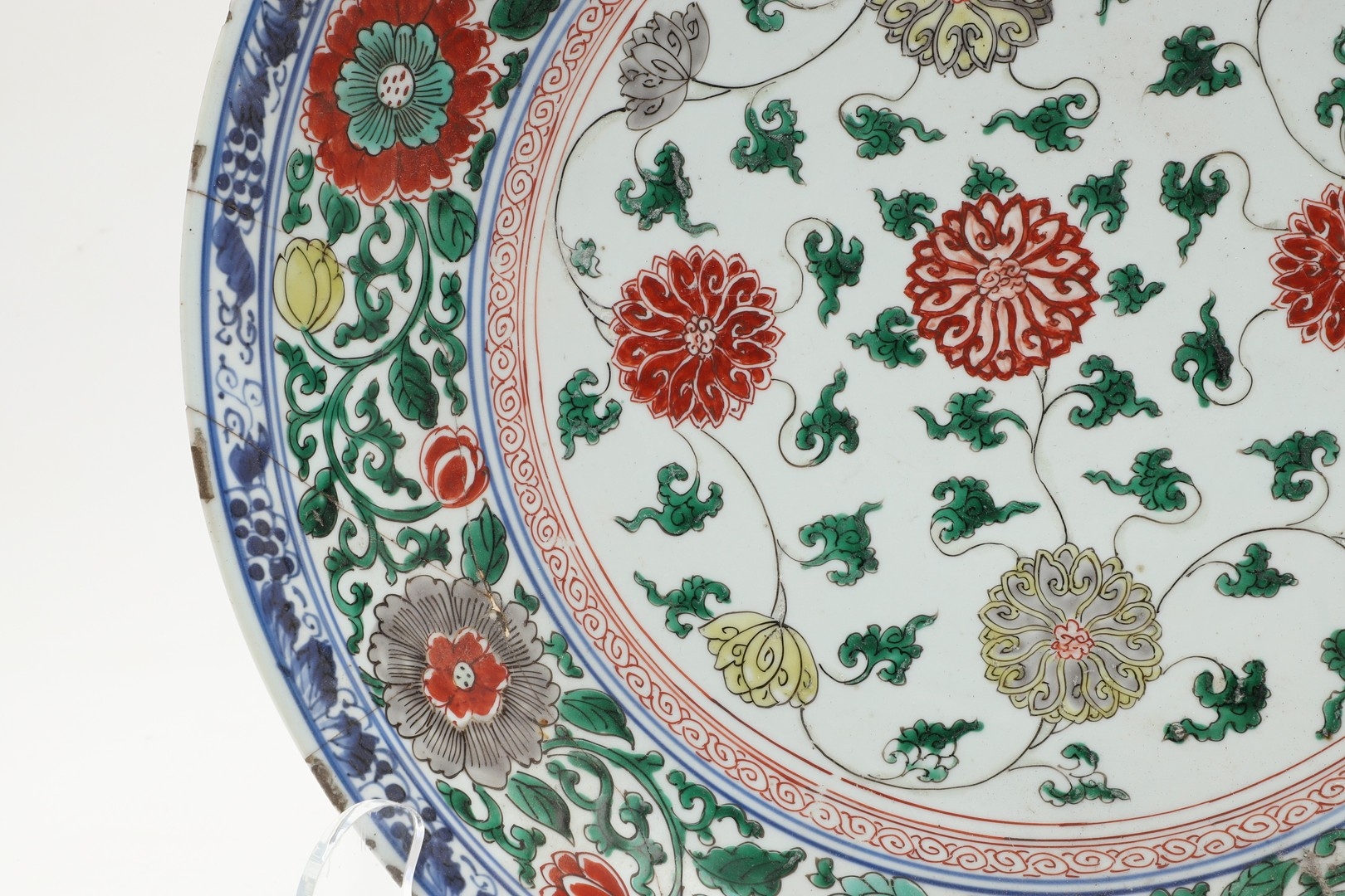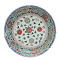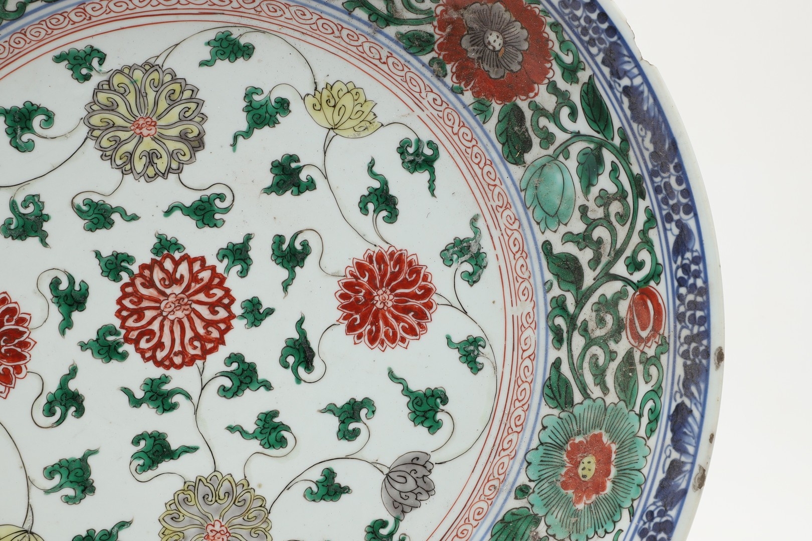 LARGE CHINESE FAMILLE VERTE DISH. Kangxi period (1662-1722), the large shallow dish painted with a variey of flowers and foliage, the rim with further blue and white flowers and with further decoration to the reverse. With a painted mark within a double circle to the base, damages. 38cms diameter.