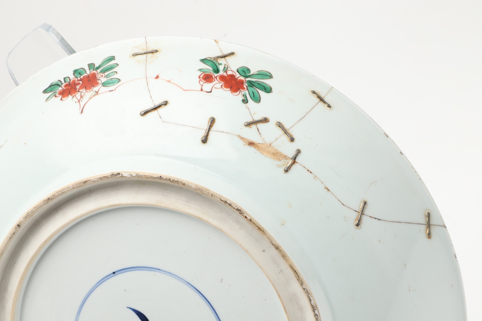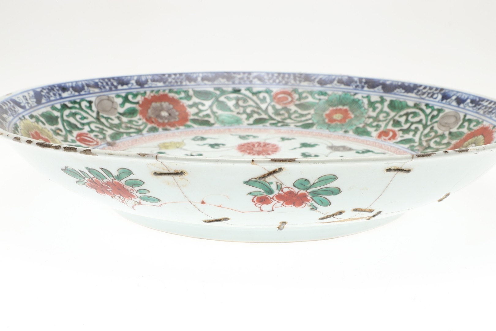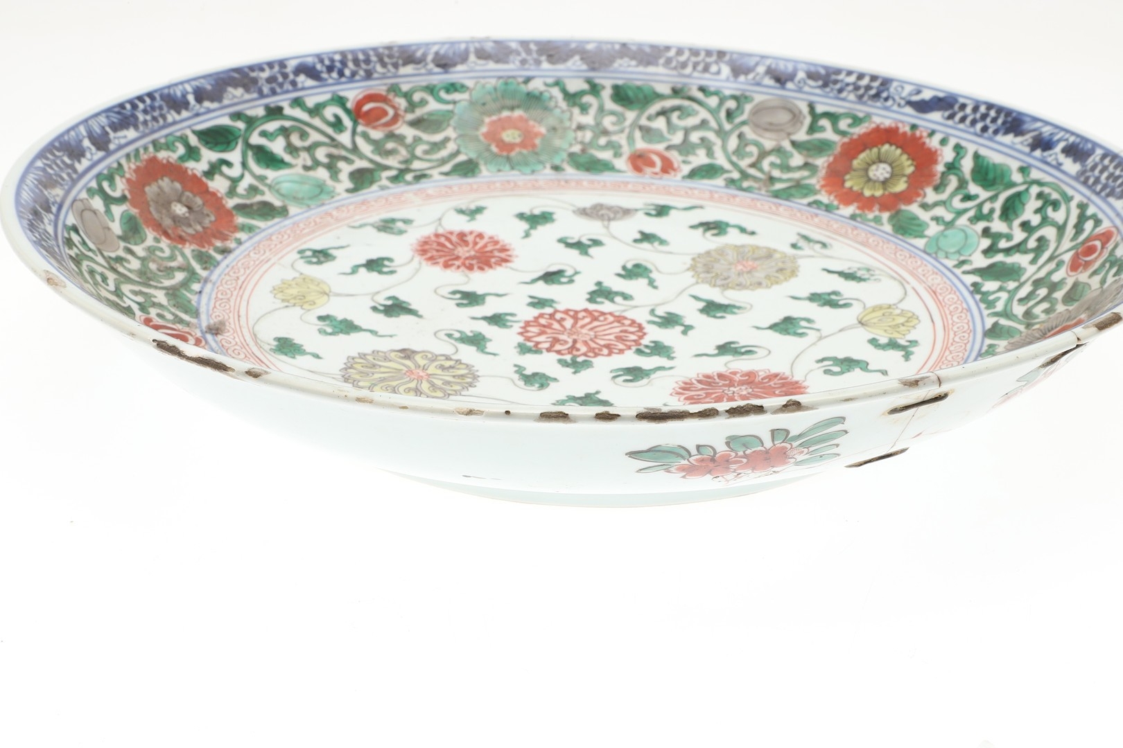A large section of the bowl has been broken and repaired including rivets, various chips and fritting to the rim, small chips to the footrim.