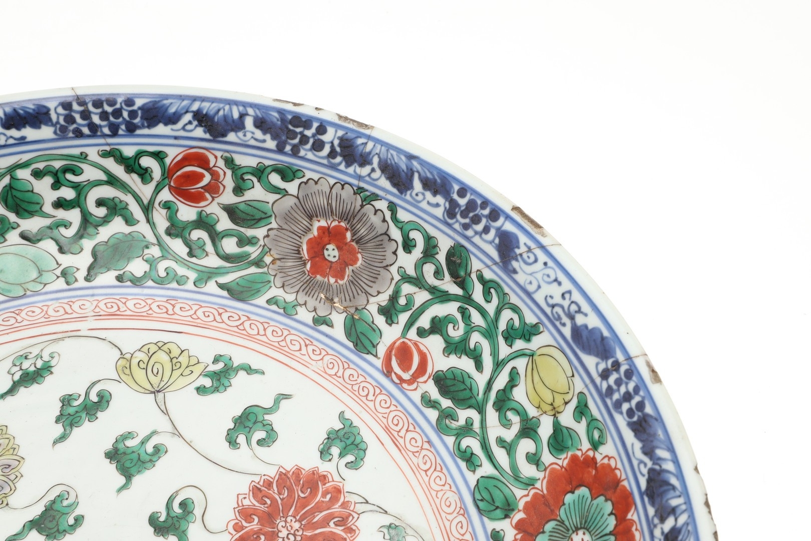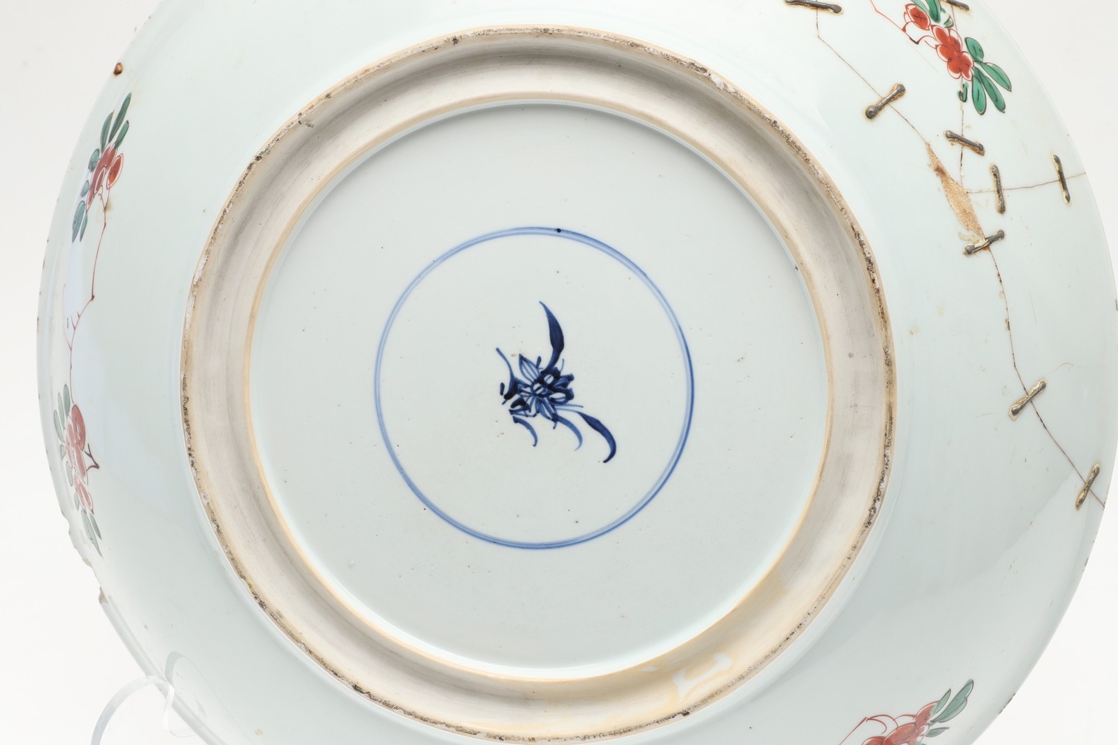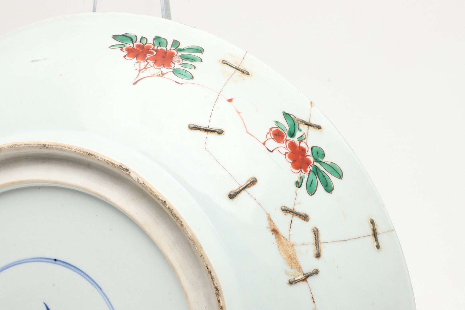 A large section of the bowl has been broken and repaired including rivets, various chips and fritting to the rim, small chips to the footrim.