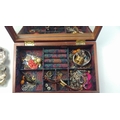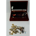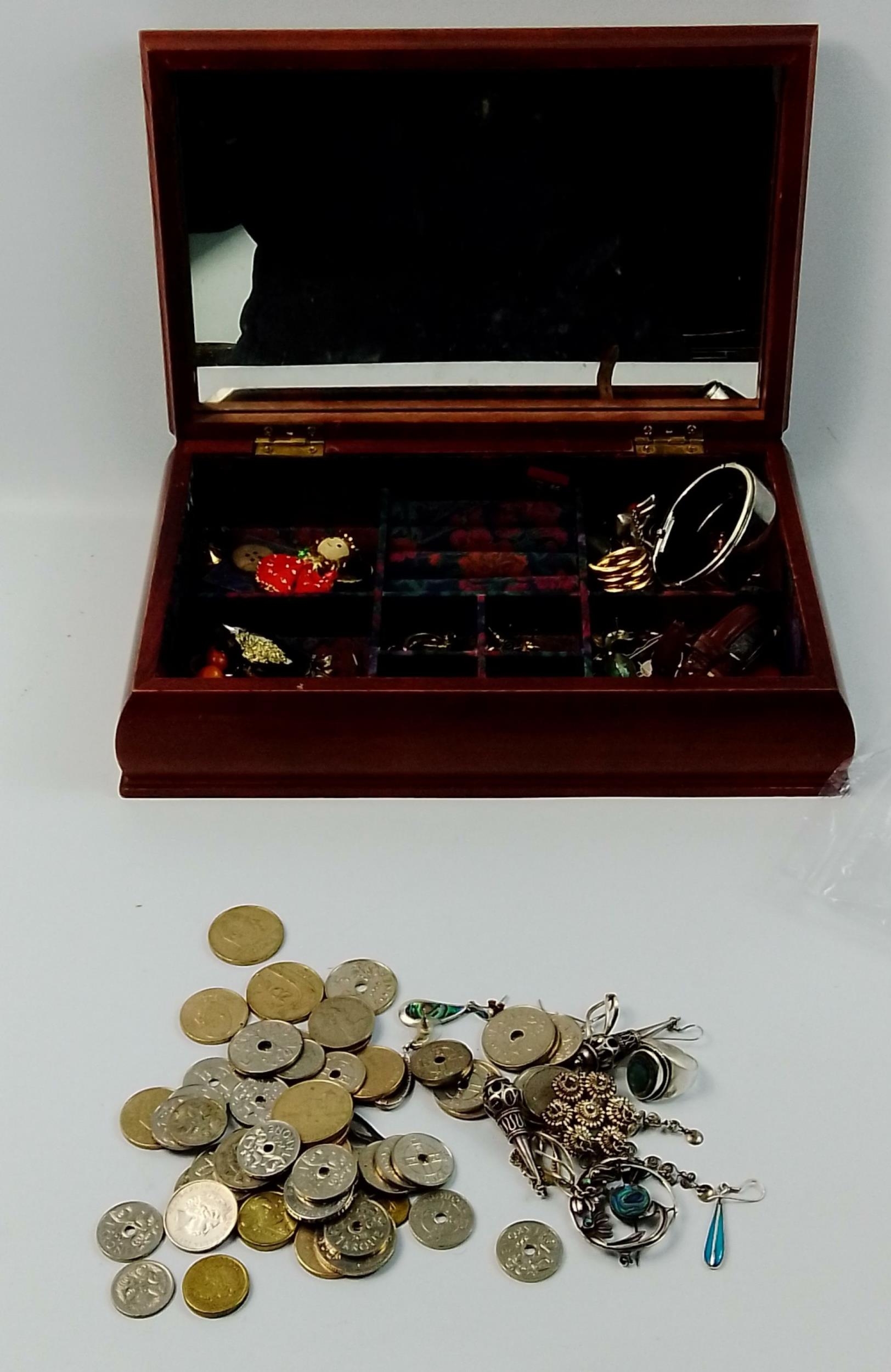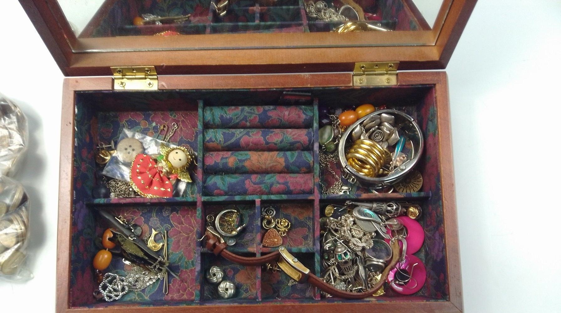 A wooden jewellery box with padded fabric lid and mirrored interior (28x18x8cm approx)with contents to include 925 stamped jewellery (gross weight 52.5g approx), costume jewellery, obsolete European coins etc