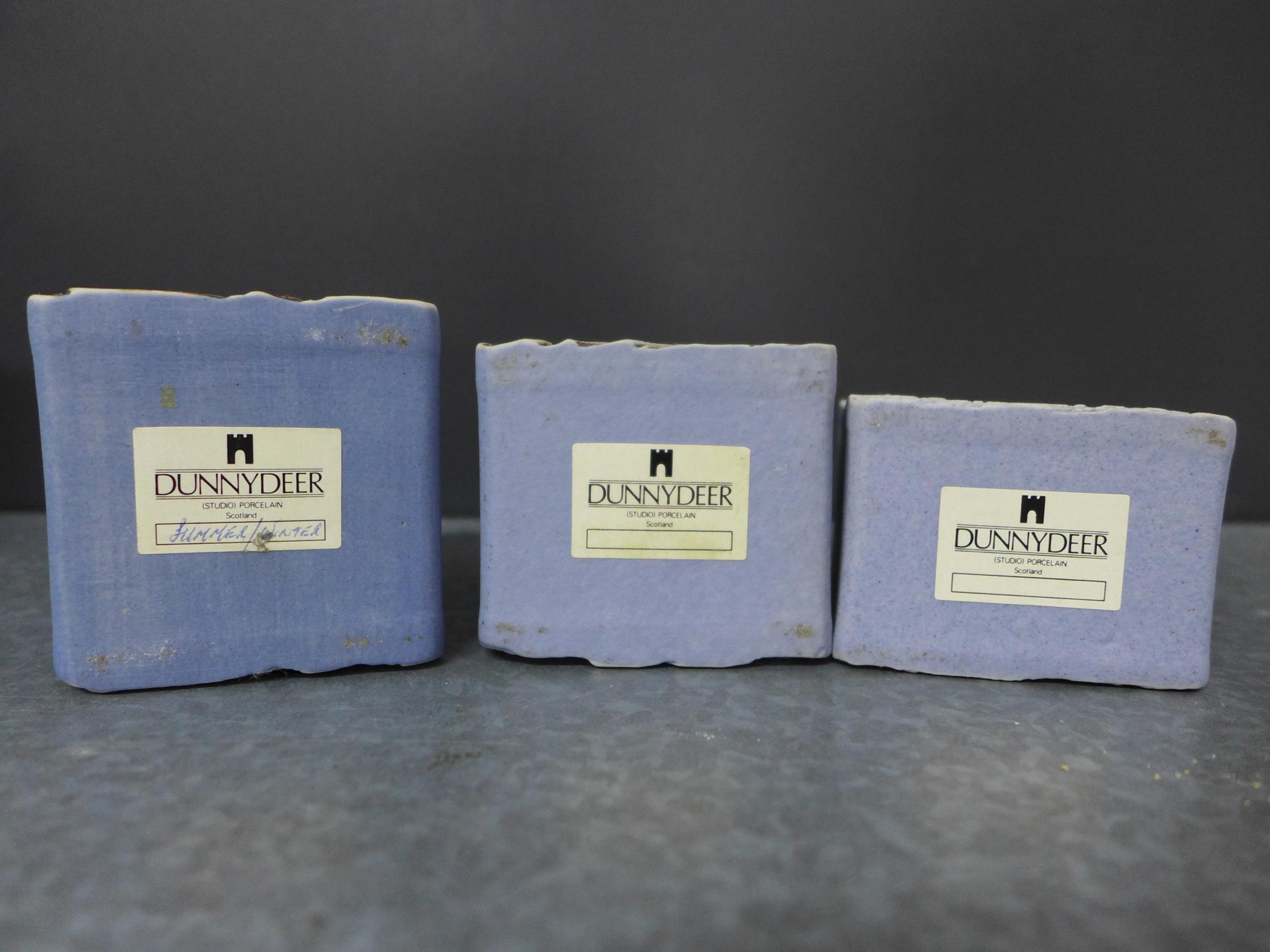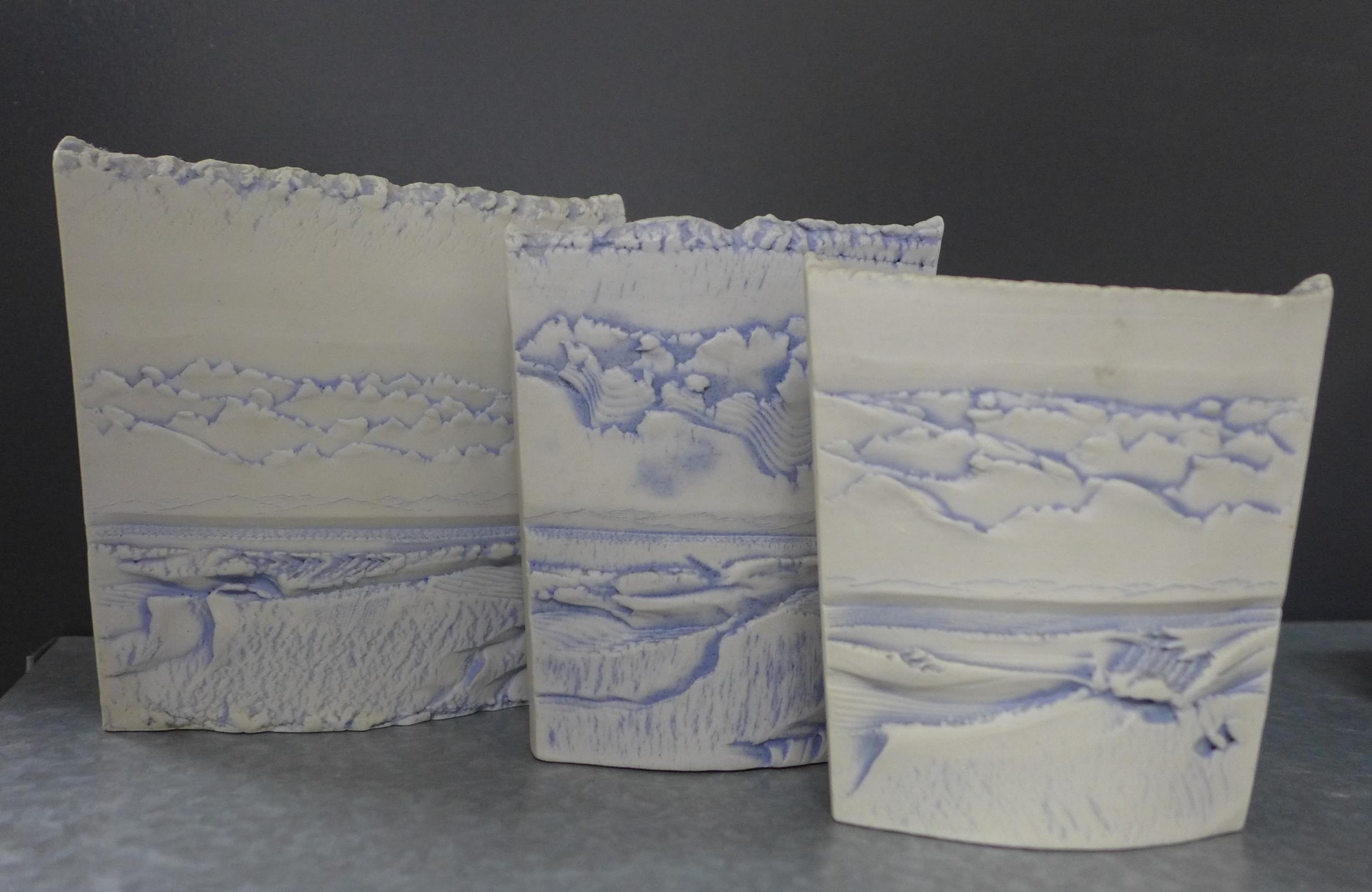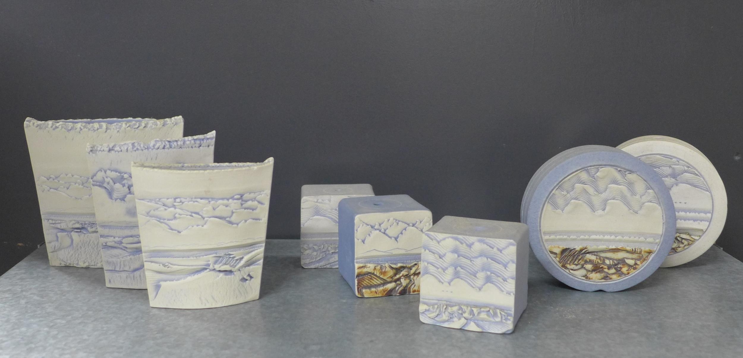 Duncan Hood Dunnydeer studio pottery landscape and sea textured vases, tallest 12cm, together with two circular and three square taper candle holders (8)