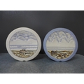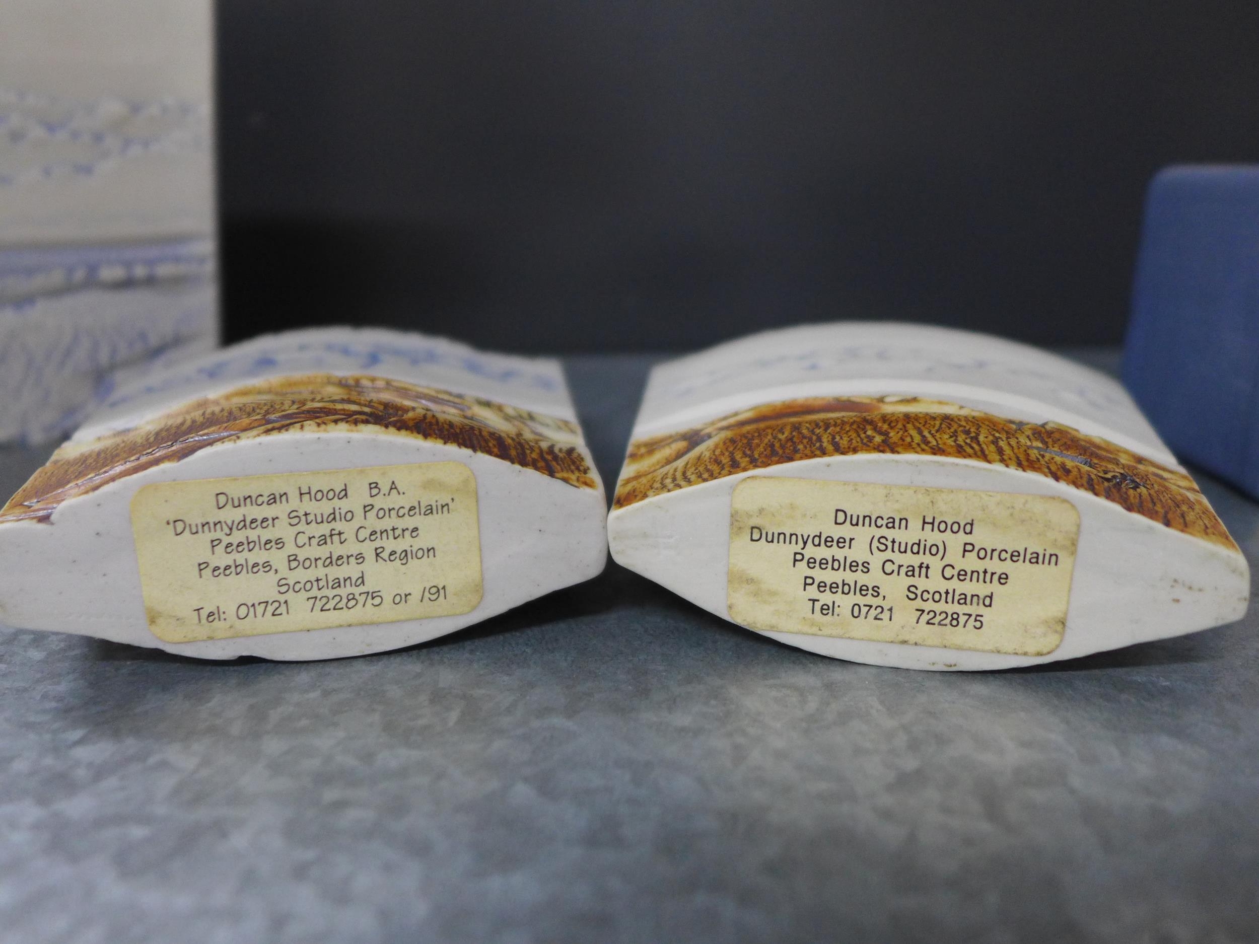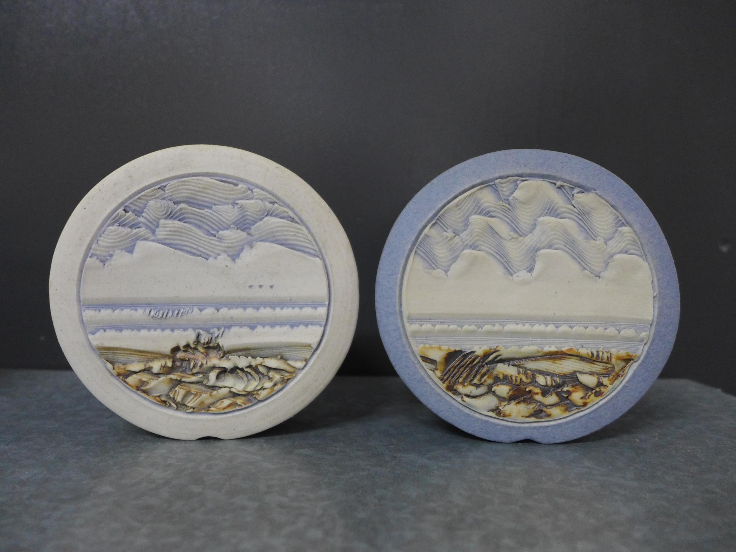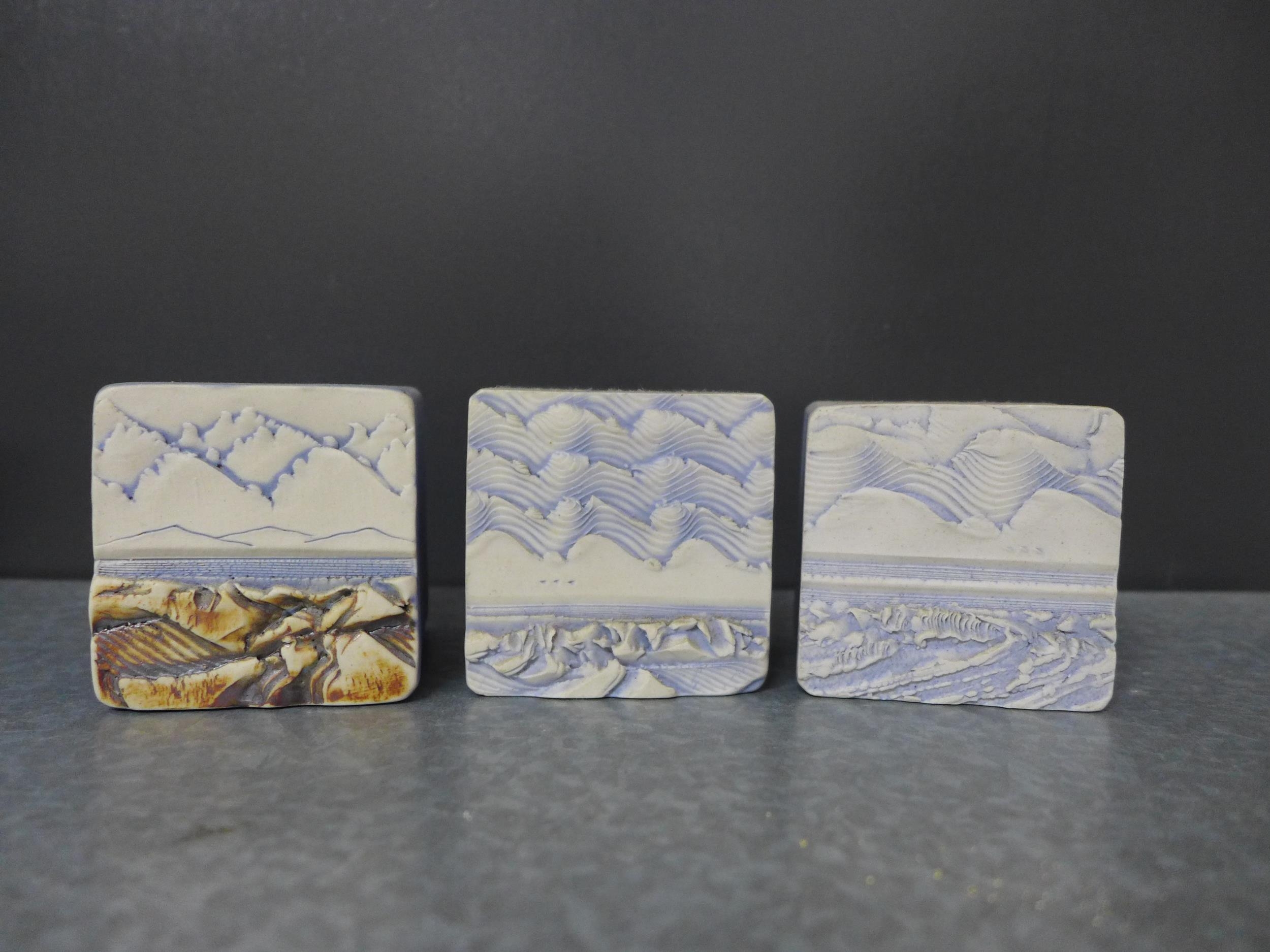 Duncan Hood Dunnydeer studio pottery landscape and sea textured vases, tallest 12cm, together with two circular and three square taper candle holders (8)