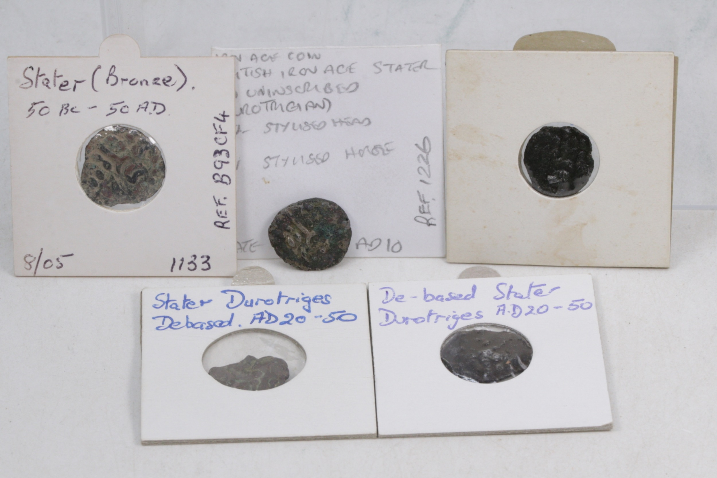 De-based Stater durotriges AD20-50 x 2, Stater Bronze durotriges C60BC-AD20, Iron Age Stater uninscribed stylised head, and Bronze stater 50BC-50AD - all these coins are from a lifetime collector.