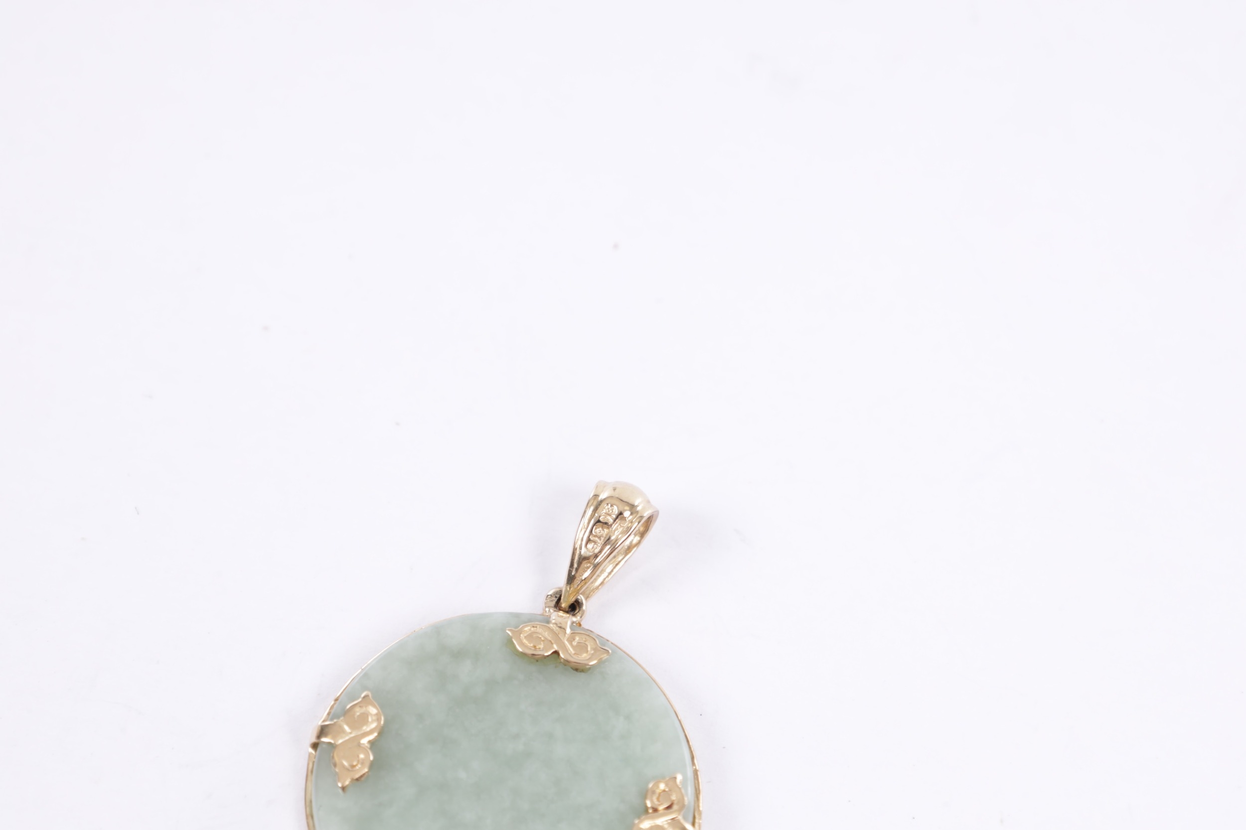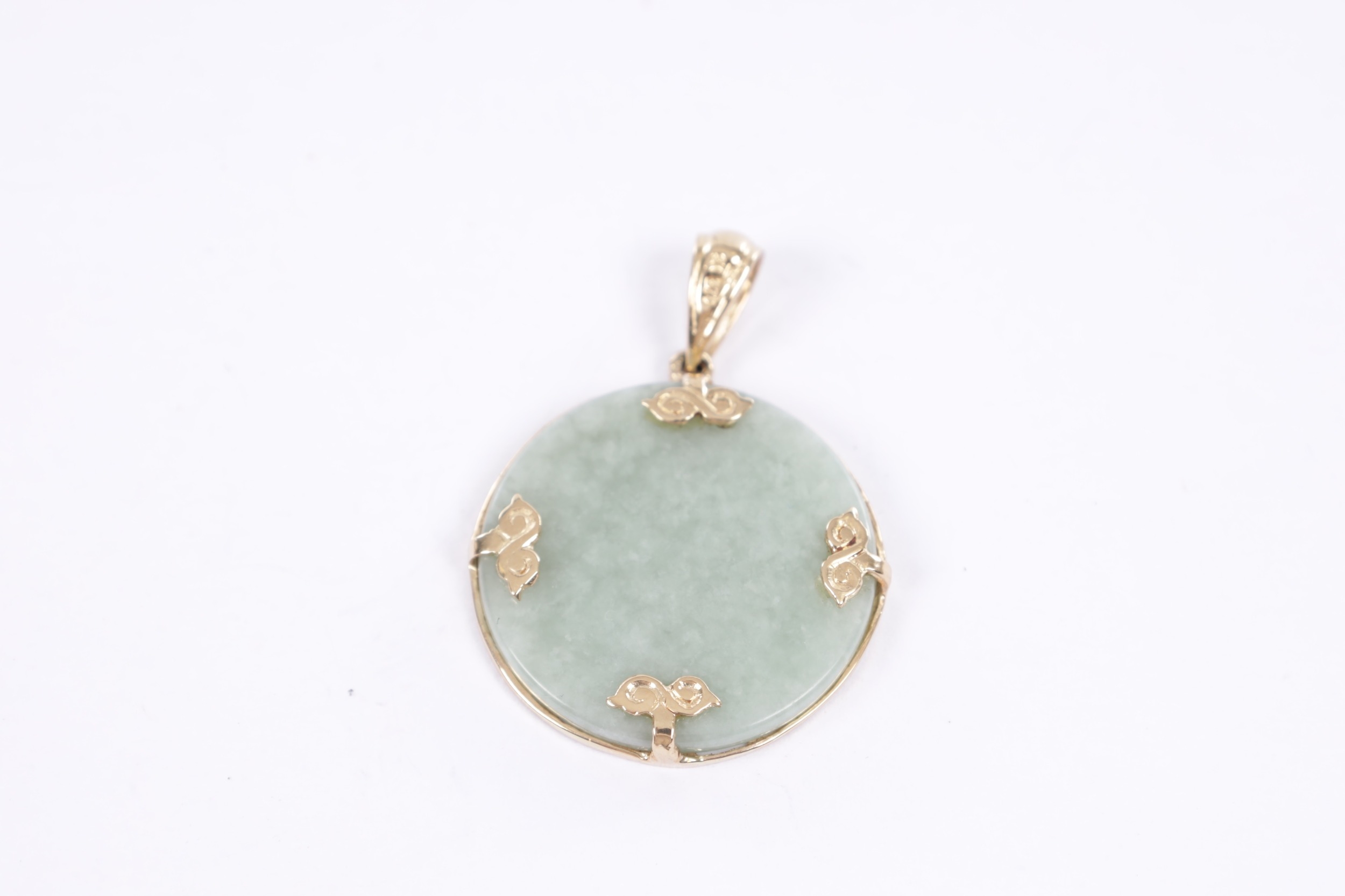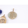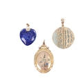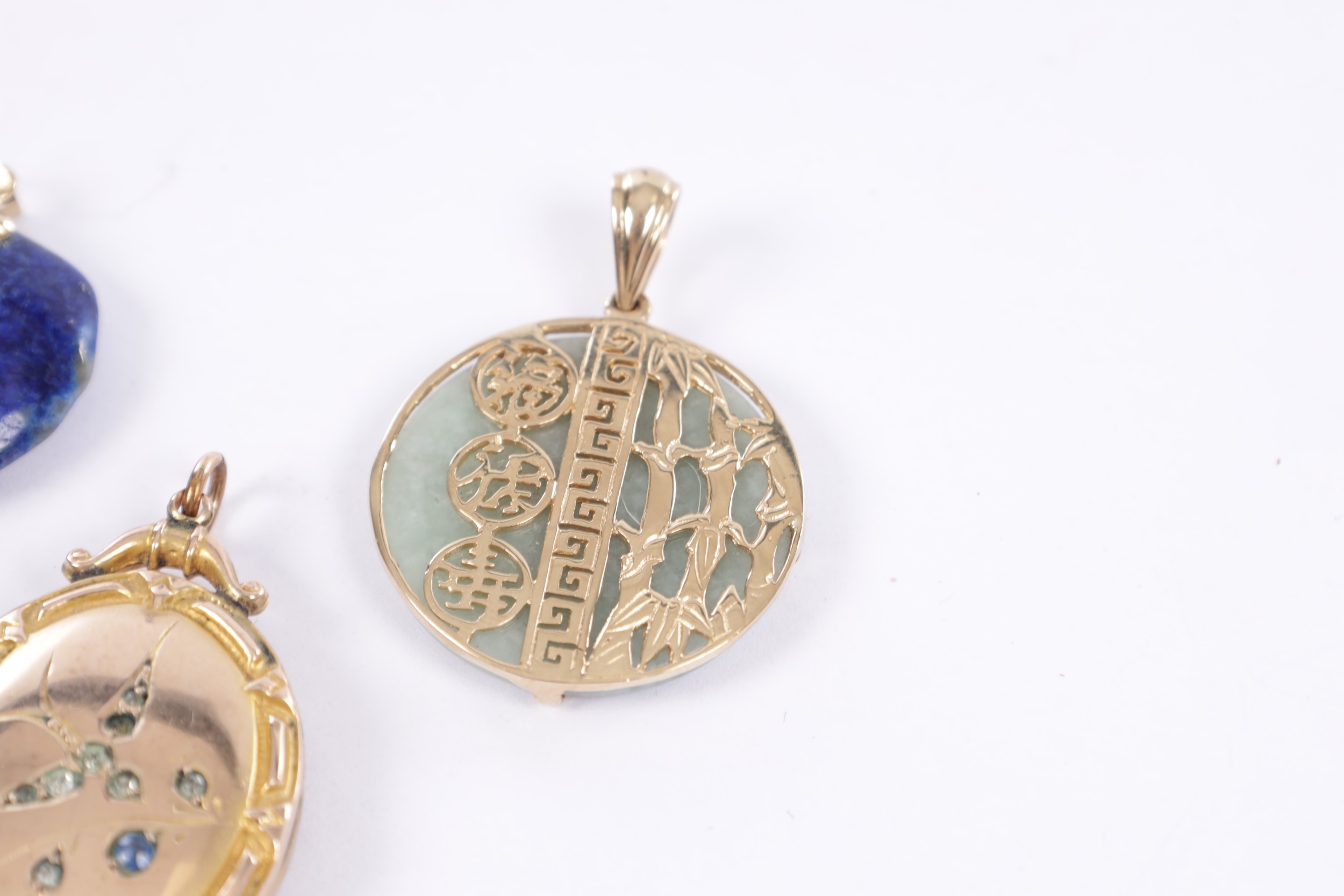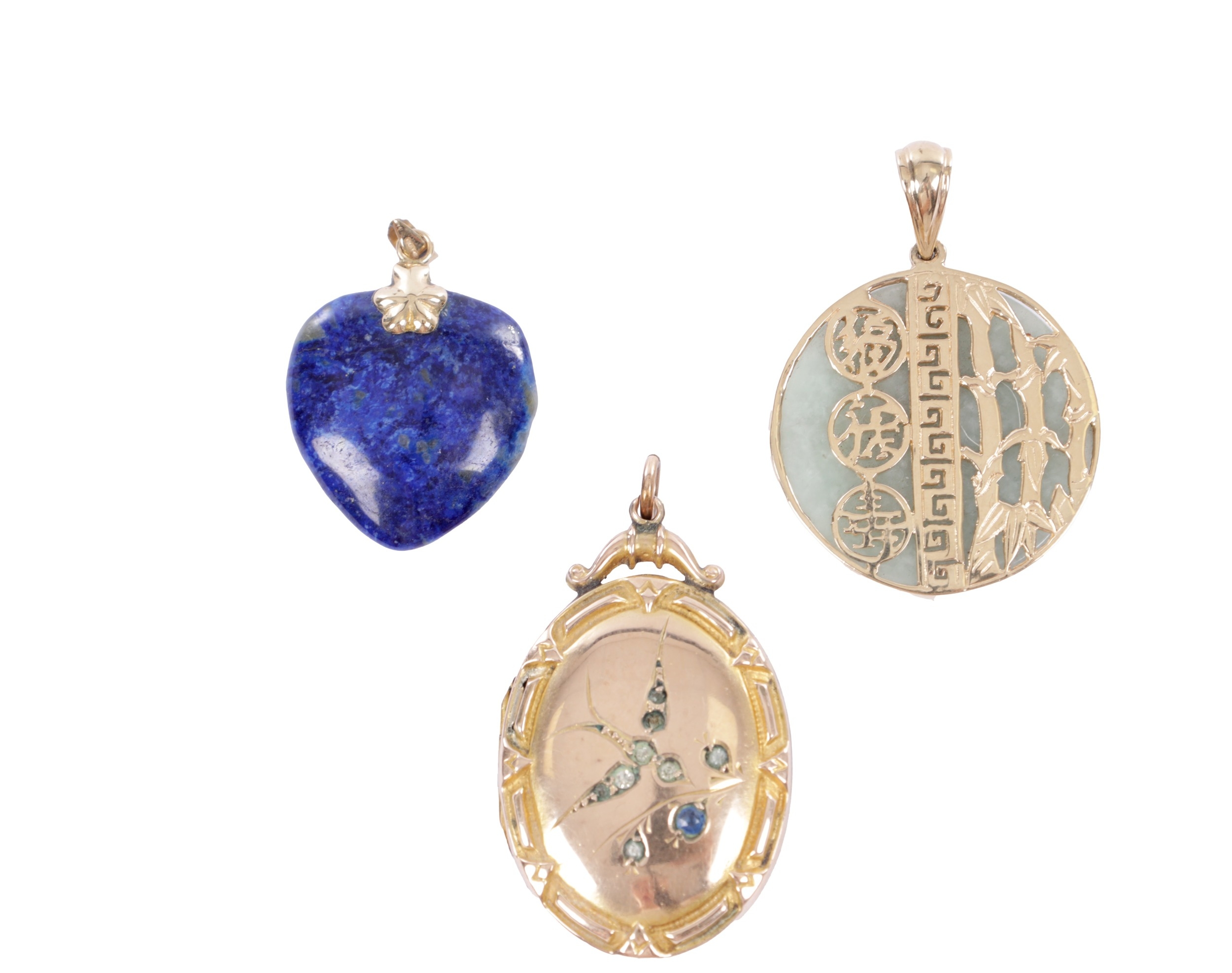 THREE 9CT GOLD MOUNTED PENDANTS, comprising a gold mounted lapiz lazuli heart-shaped pendant, a gold mounted circular jade pendant with Chinese script, and an oval gold locket pendant set with engraved jewelled decoration, total weight app. 18g. (3) (jade pendant is 26mm diameter)