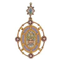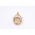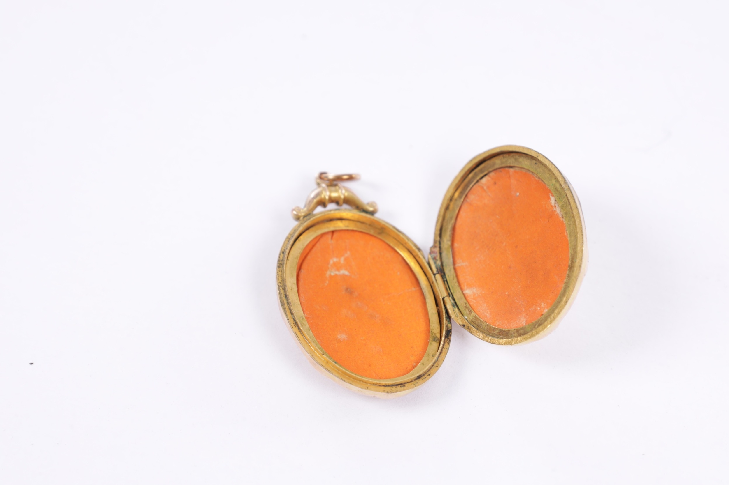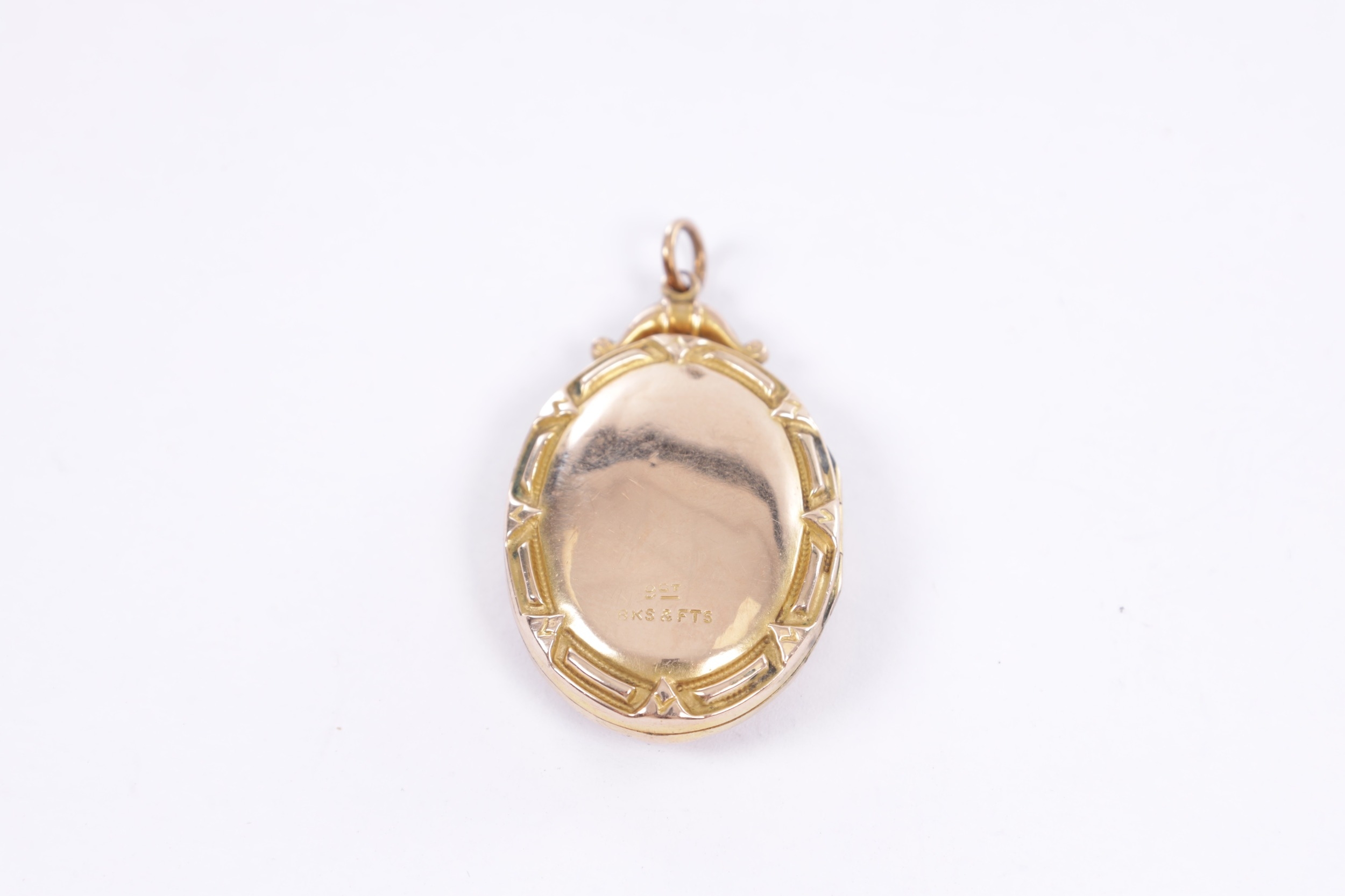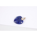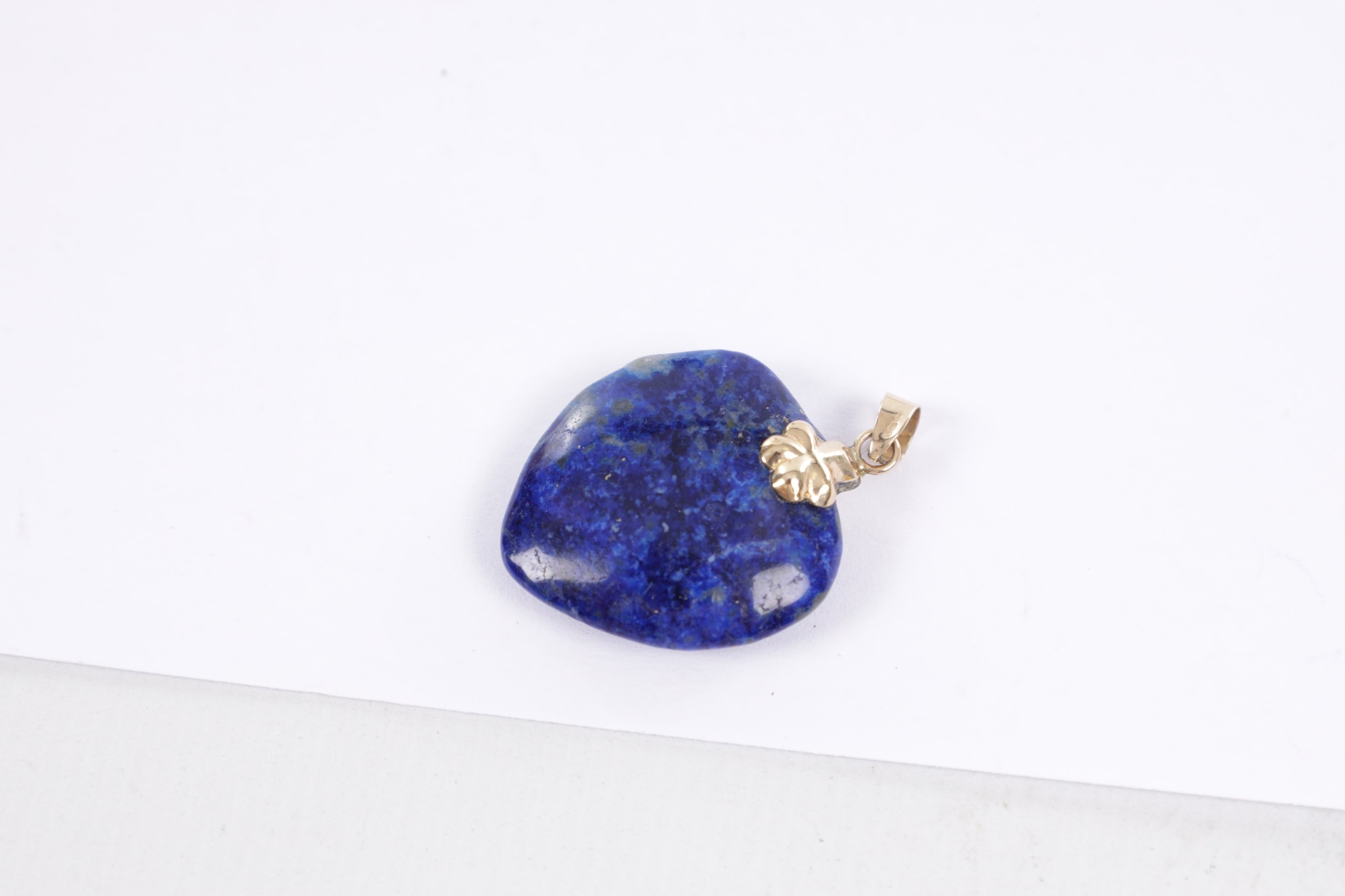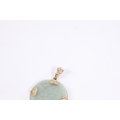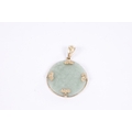 THREE 9CT GOLD MOUNTED PENDANTS, comprising a gold mounted lapiz lazuli heart-shaped pendant, a gold mounted circular jade pendant with Chinese script, and an oval gold locket pendant set with engraved jewelled decoration, total weight app. 18g. (3) (jade pendant is 26mm diameter)